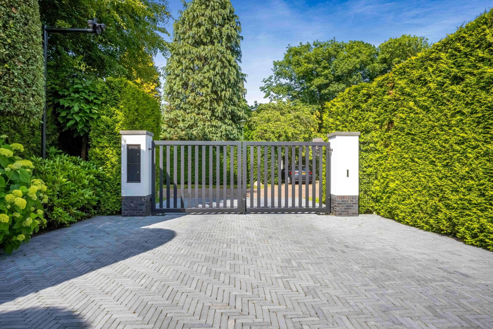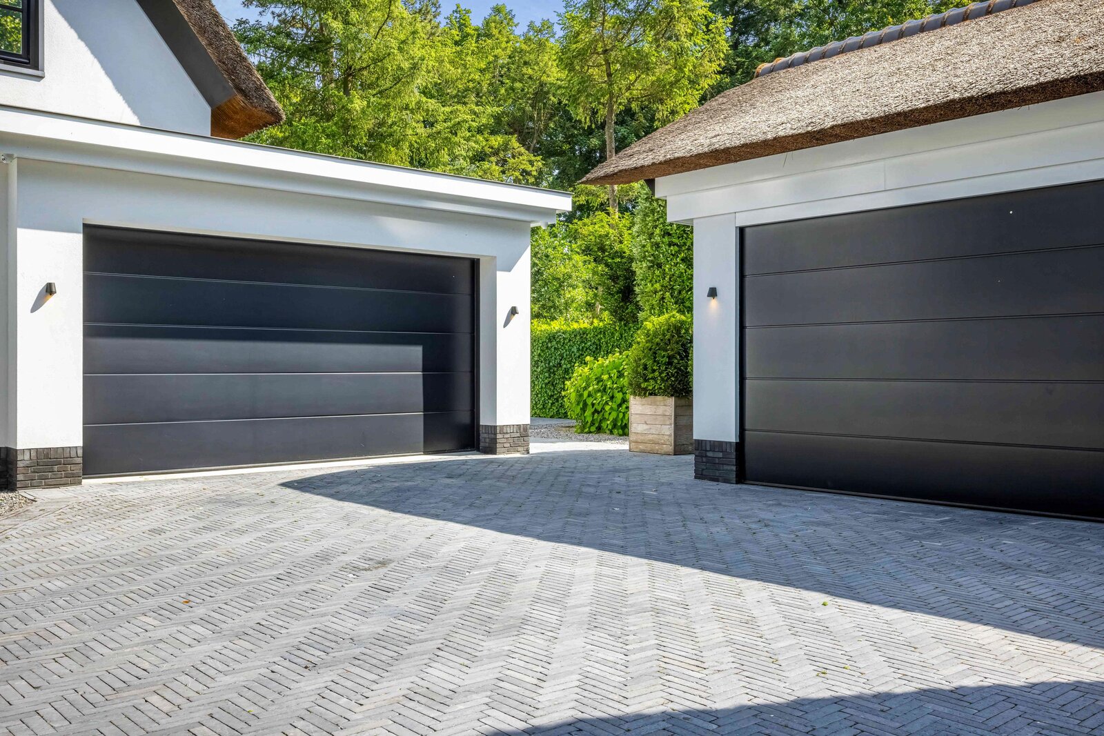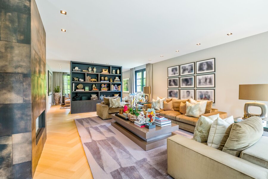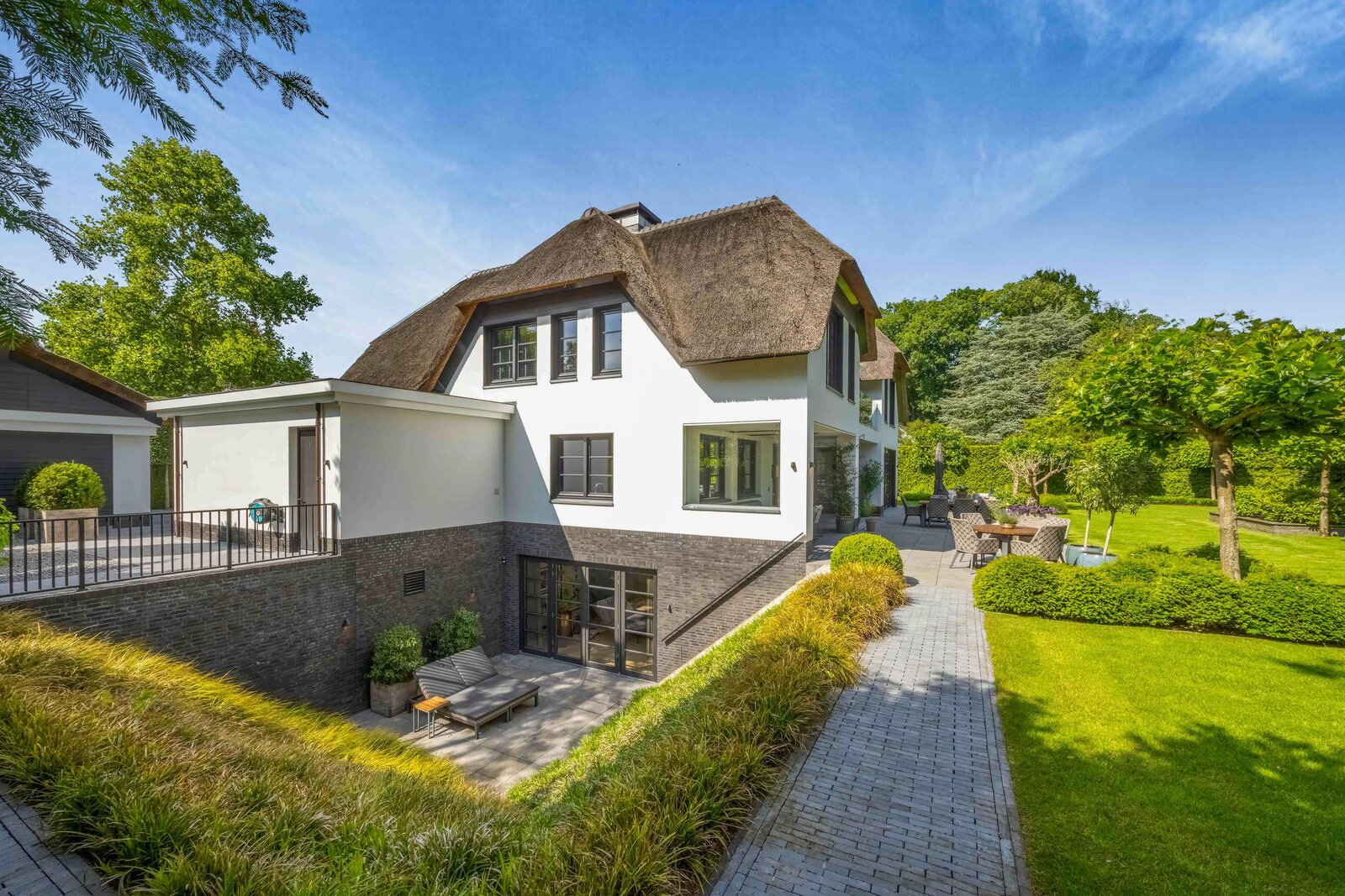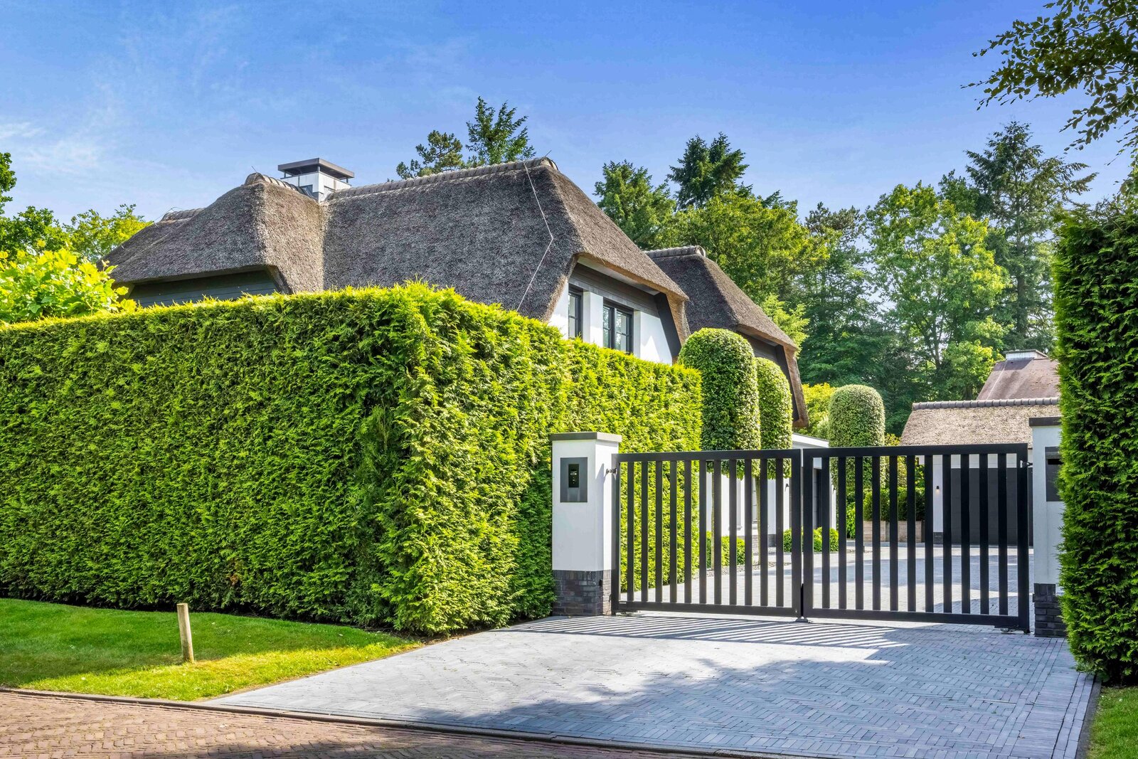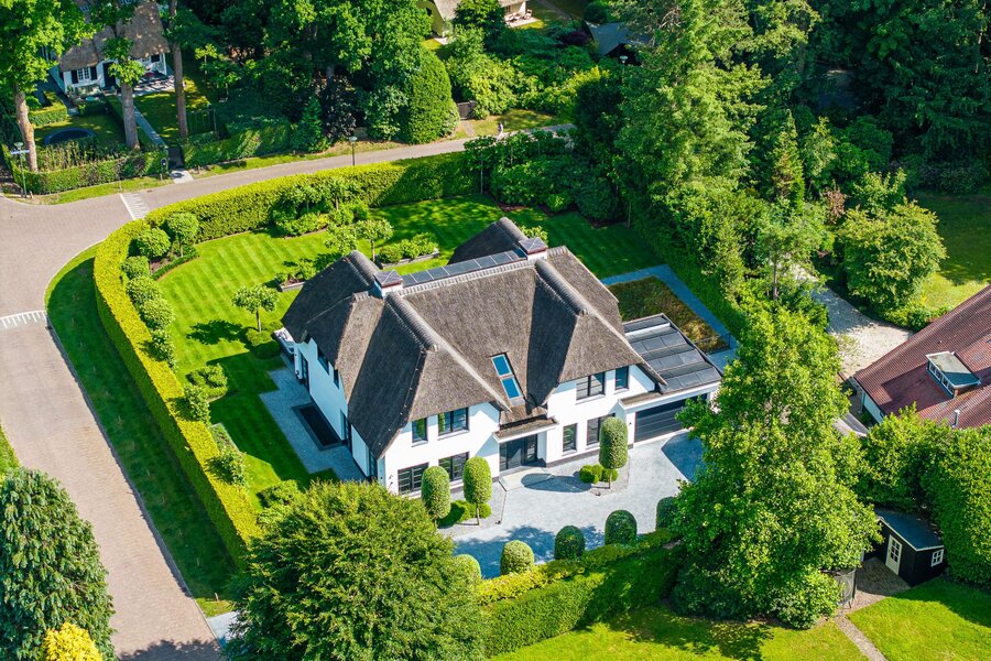 Aan een van de mooiste lanen van Blaricum, in het midden van de Gouden Driehoek, verscholen achter hoge hagen en een automatische poort, ligt deze rietgedekte villa (2017). Een oase van rust en verfijning, met een zeldzame combinatie van woonoppervlak (ca. 545 m²), wellness-souterrain, inpandige garage én een vrijstaande garage/berging — alles omgeven door een fraai aangelegde tuin op het zuiden.