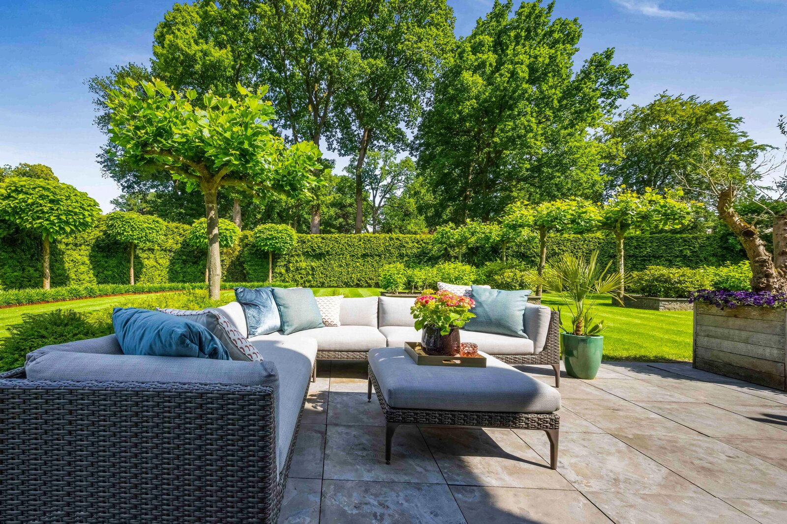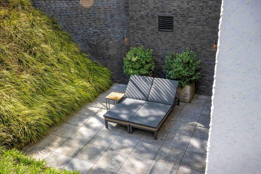 De zuid-tuin is ontworpen voor privacy: lommerrijke borders, meerdere terrassen (ook beschut bij de patio) en een diepe oprit achter de poort. Aan de villa grenst een overdekte veranda; aan de zij- en achterzijde vindt u zonnige plekken gedurende de hele dag.