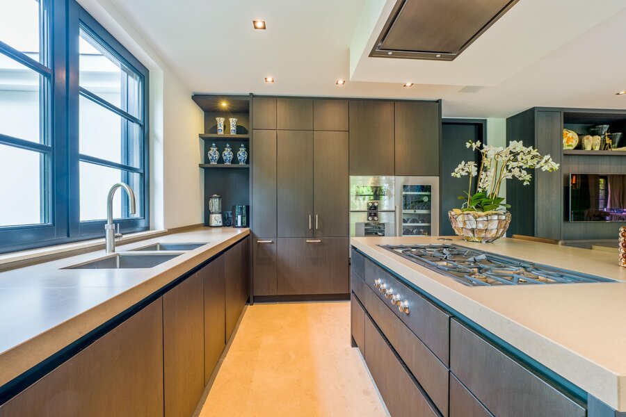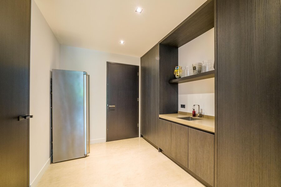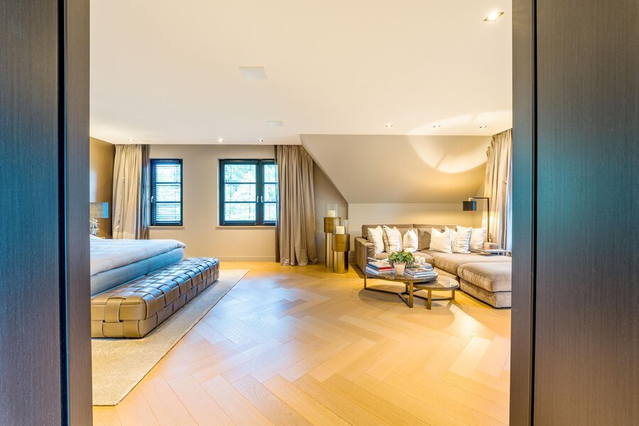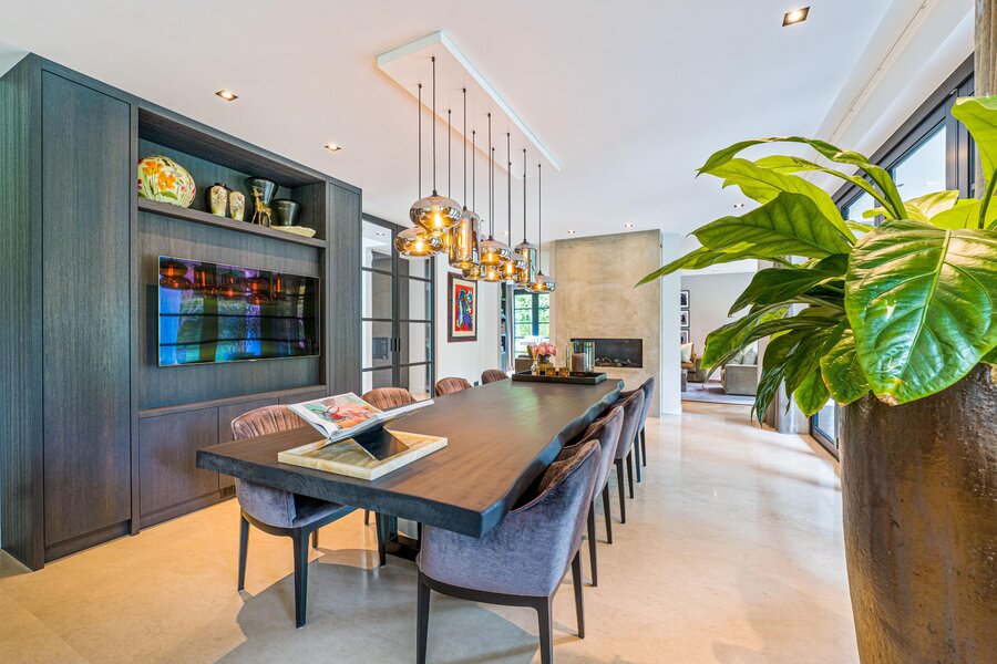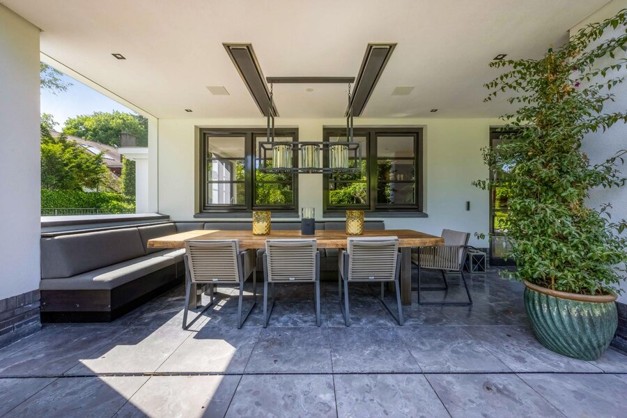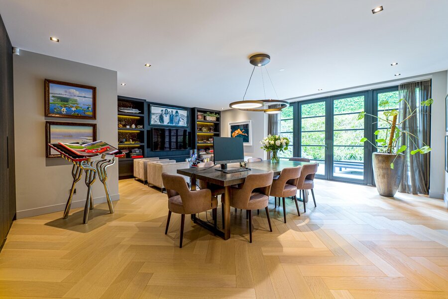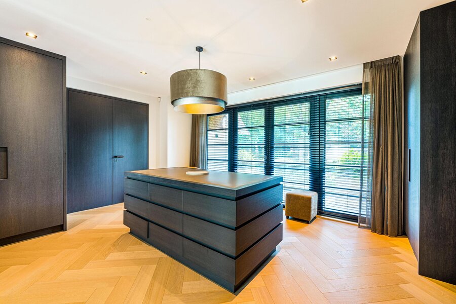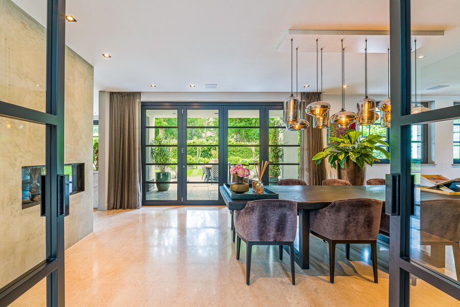 De living en eetkamer lopen naadloos in elkaar over, rondom twee separate haarden in hoogte verschillend. Openslaande deuren brengen u naar de overdekte veranda met vaste zithoek en terrasverwarming: vier seizoenen buitengenot. De royale maatwerkkeuken met groot kookeiland en hoogwaardige inbouwapparatuur vormt het kloppend hart. Naastliggend bevinden zich een praktische bijkeuken/second kitchen en een rustige werkkamer. De vloeren in de hal en de keuken zijn uitgevoerd in lichte natuursteen, de rest van de vloeren zijn uitgevoerd in een visgraat pakket.
