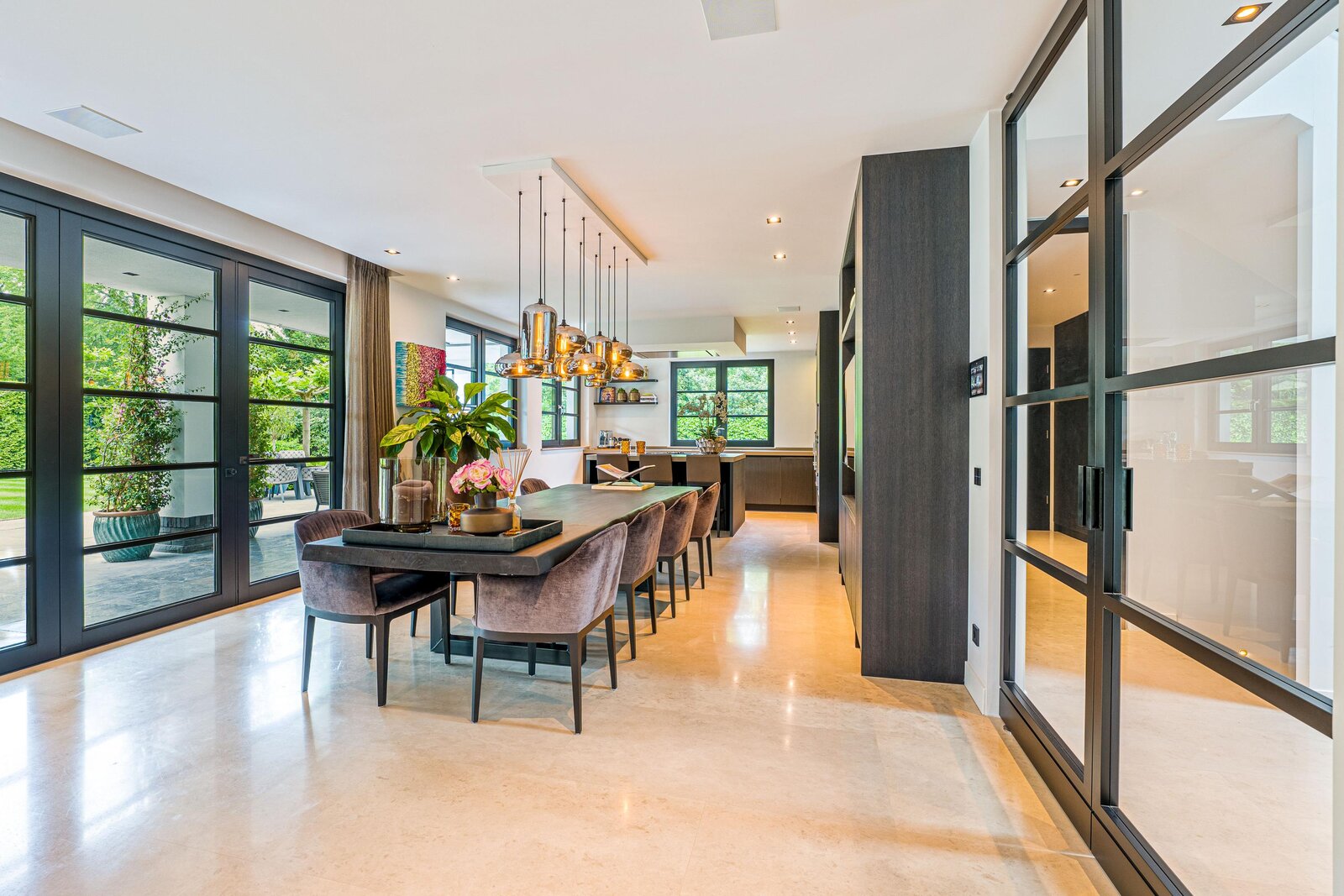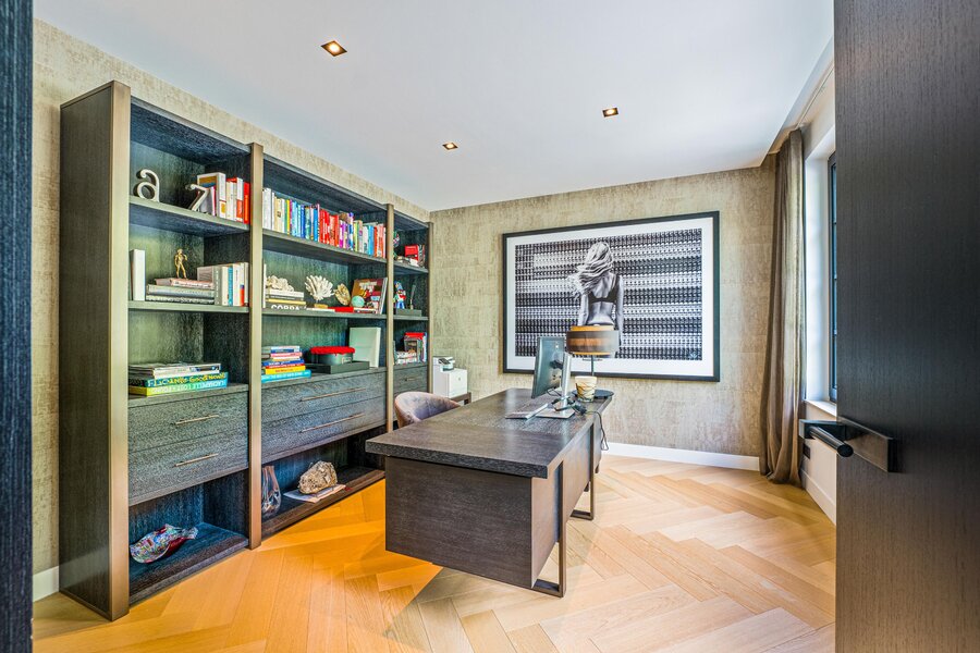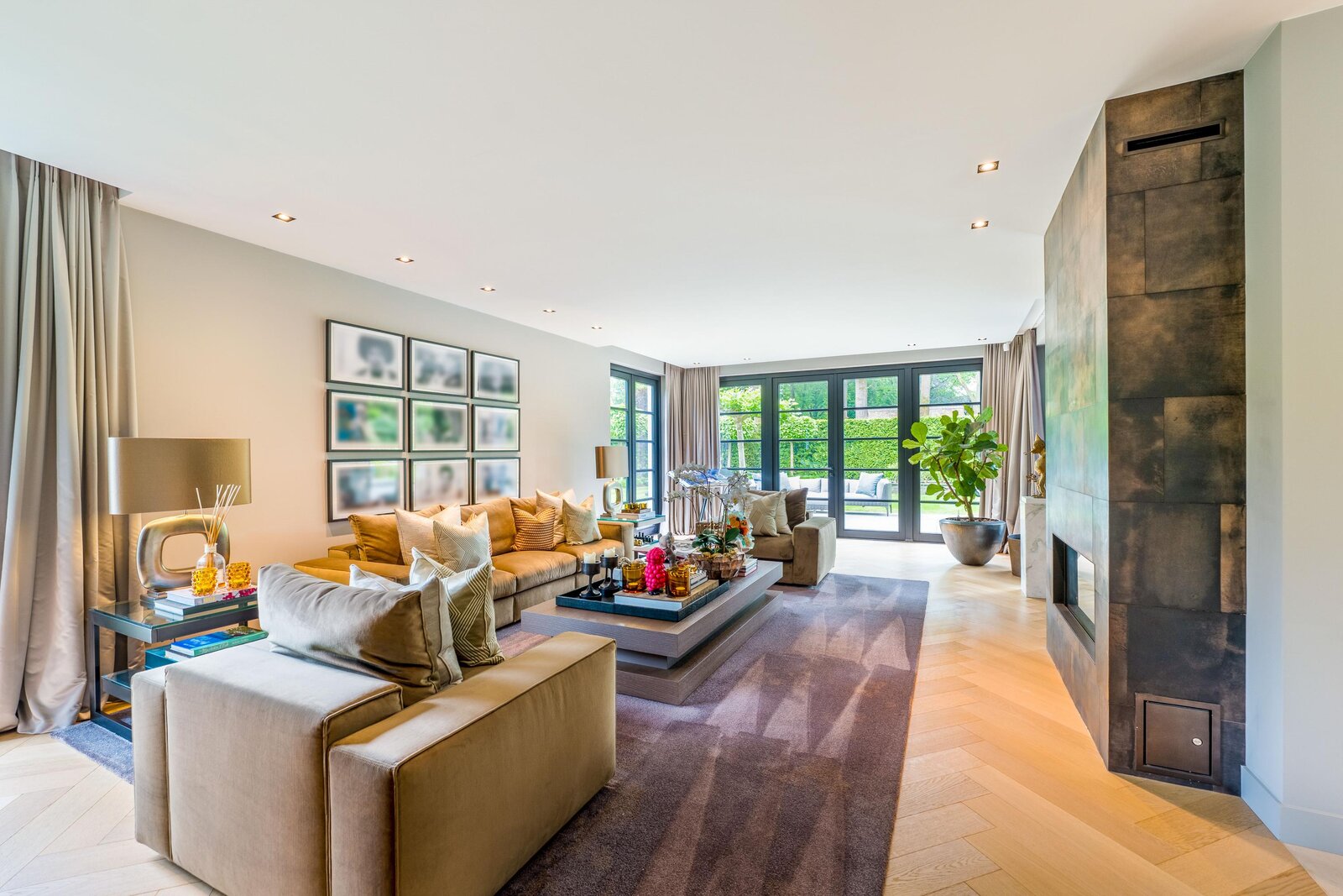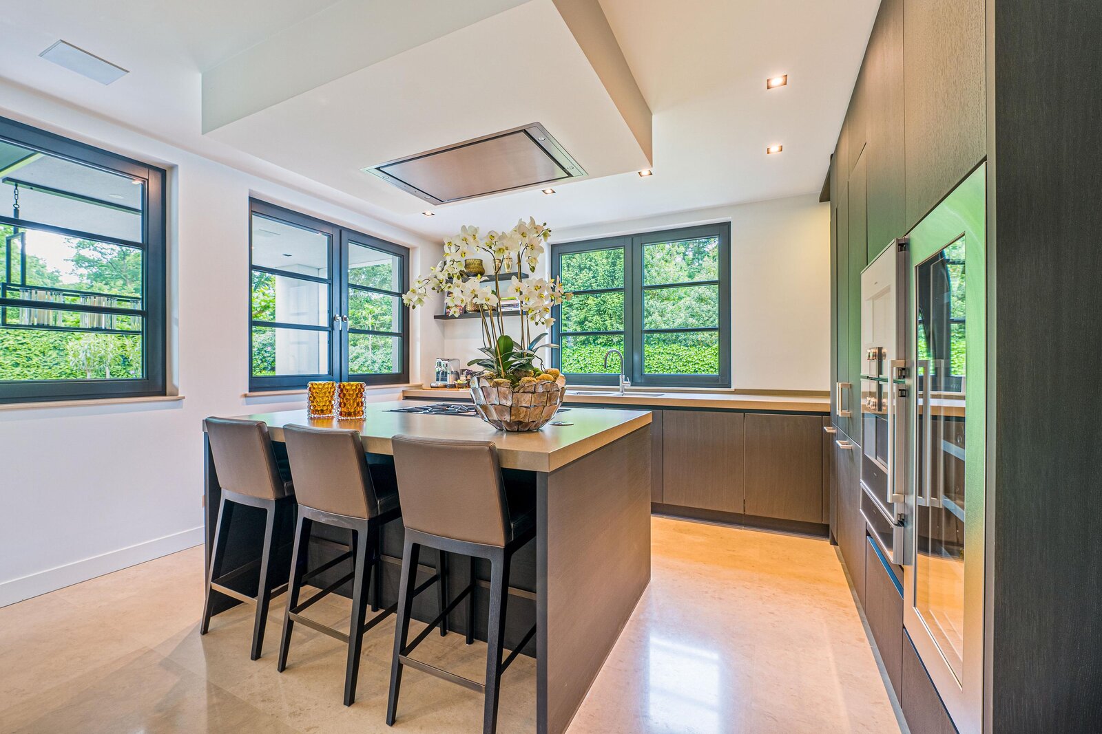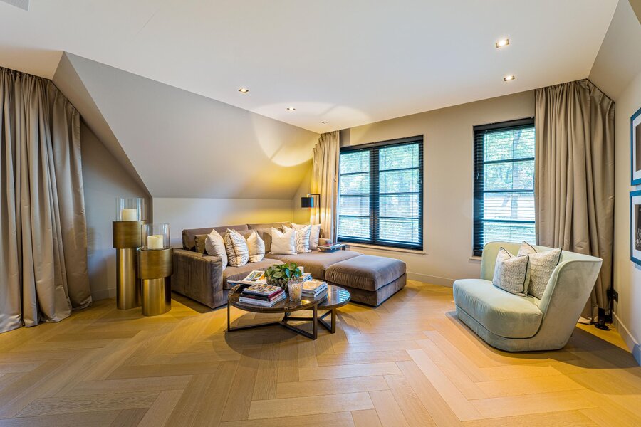 De living en eetkamer lopen naadloos in elkaar over, rondom twee separate haarden in hoogte verschillend. Openslaande deuren brengen u naar de overdekte veranda met vaste zithoek en terrasverwarming: vier seizoenen buitengenot. De royale maatwerkkeuken met groot kookeiland en hoogwaardige inbouwapparatuur vormt het kloppend hart. Naastliggend bevinden zich een praktische bijkeuken/second kitchen en een rustige werkkamer. De vloeren in de hal en de keuken zijn uitgevoerd in lichte natuursteen, de rest van de vloeren zijn uitgevoerd in een visgraat pakket.