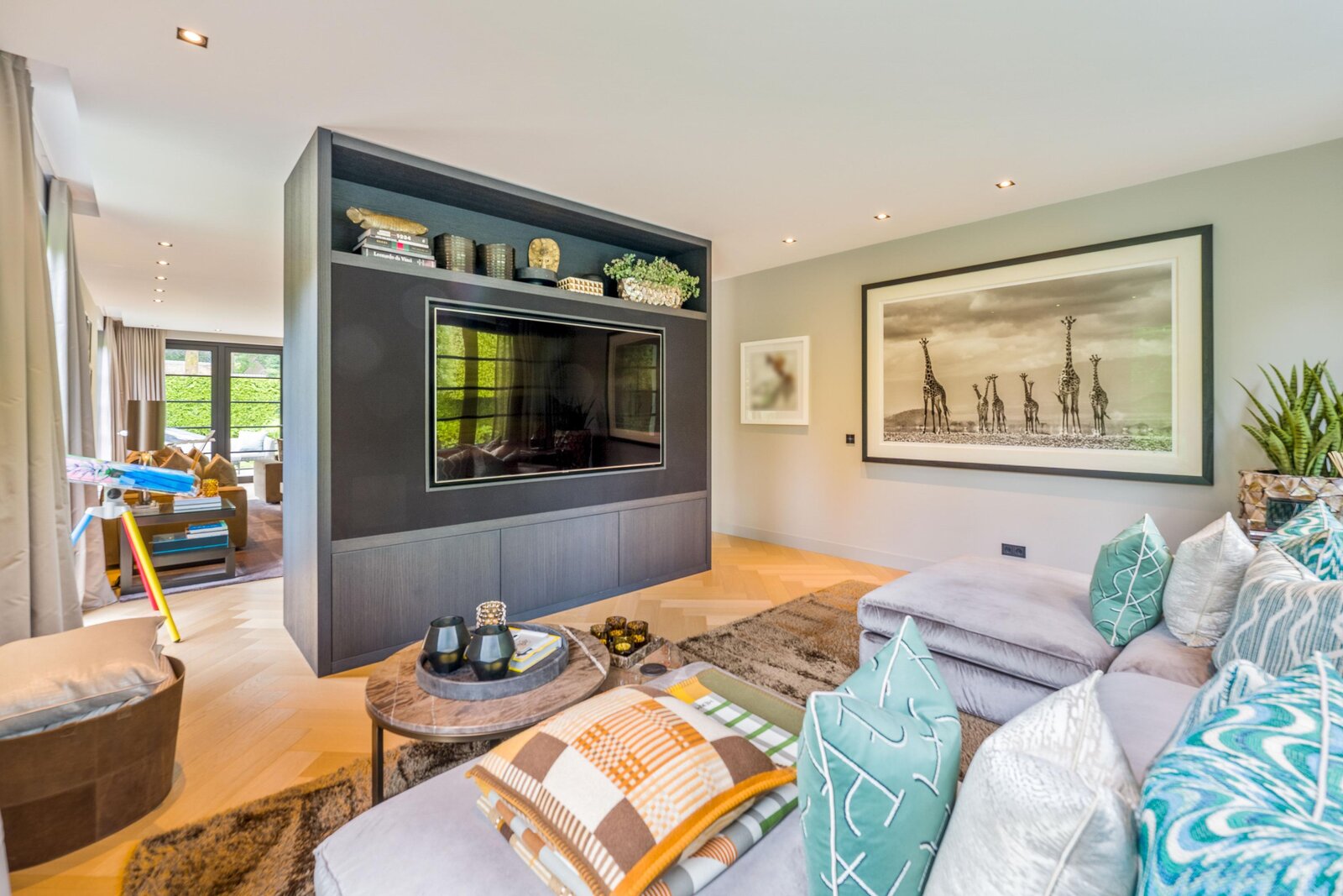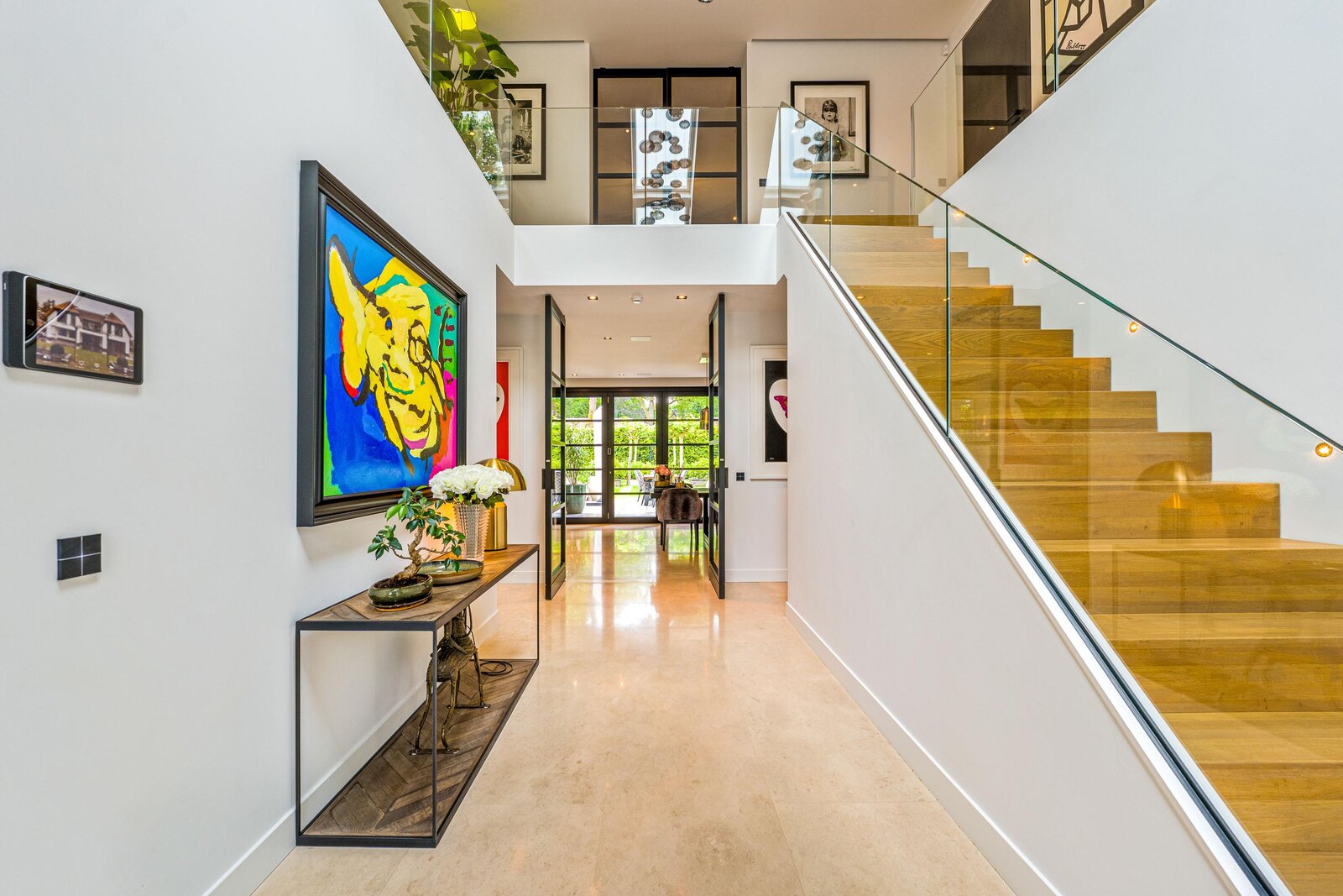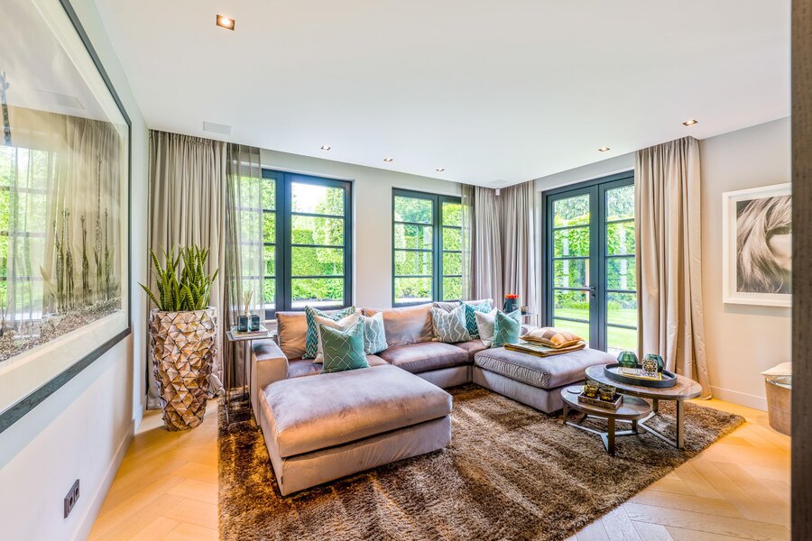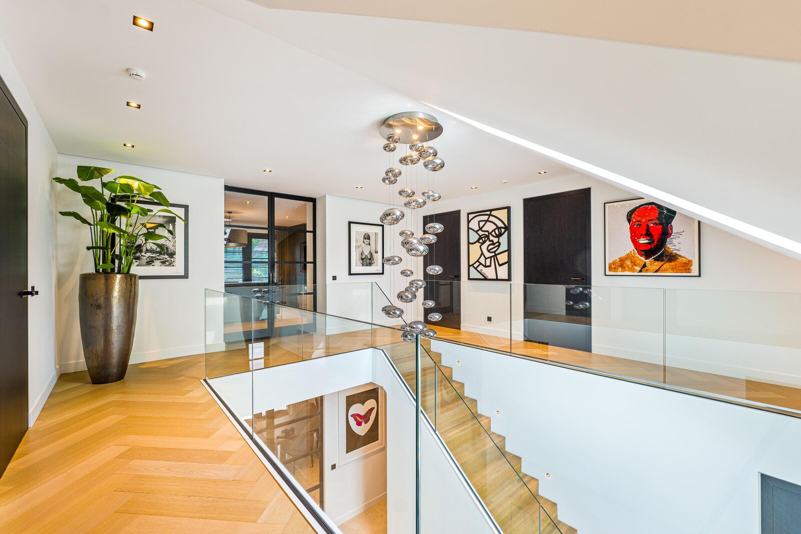De living en eetkamer lopen naadloos in elkaar over, rondom twee separate haarden in hoogte verschillend. Openslaande deuren brengen u naar de overdekte veranda met vaste zithoek en terrasverwarming: vier seizoenen buitengenot. De royale maatwerkkeuken met groot kookeiland en hoogwaardige inbouwapparatuur vormt het kloppend hart. Naastliggend bevinden zich een praktische bijkeuken/second kitchen en een rustige werkkamer. De vloeren in de hal en de keuken zijn uitgevoerd in lichte natuursteen, de rest van de vloeren zijn uitgevoerd in een visgraat pakket.