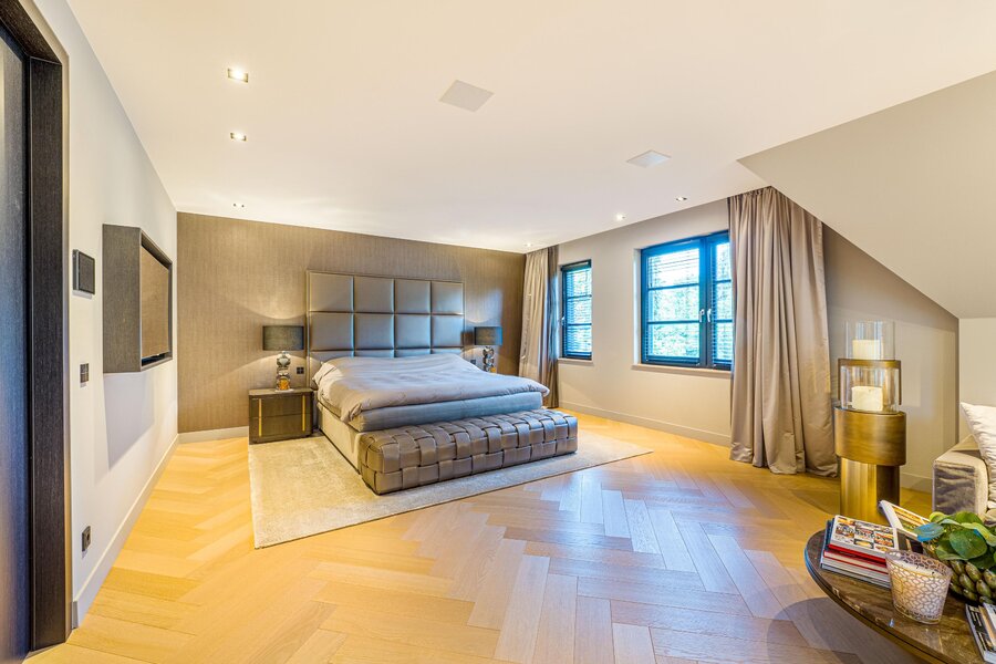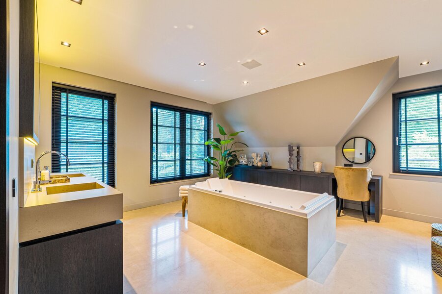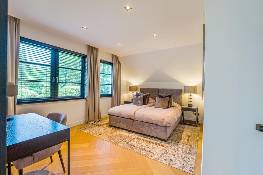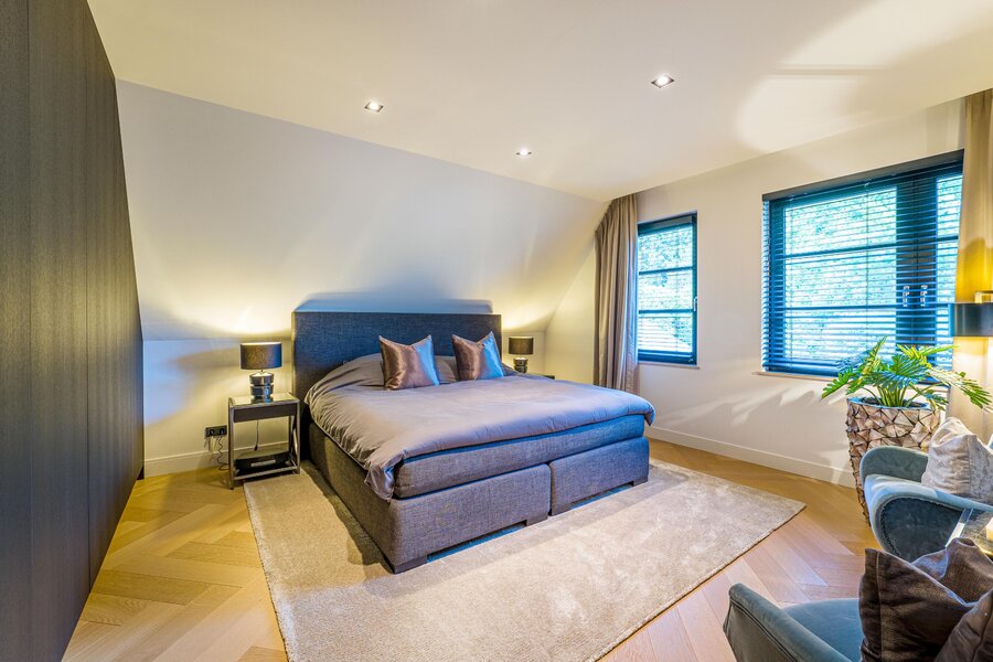 De eerste verdieping biedt drie royale slaapkamers en twee luxe badkamers in natuursteen. De master suite heeft een eigen zitgedeelte met open haard, een mooie walk-in-closet met balkon en een wellness badkamer met ligbad, inloopdouche en dubbele wastafel. Uiteraard zijn er op deze verdieping nog twee royale slaapkamers én een extra dressing én een extra tweede badkamer (met alle voorzieningen) aanwezig. Bovenliggend is er een ruime bergvliering.