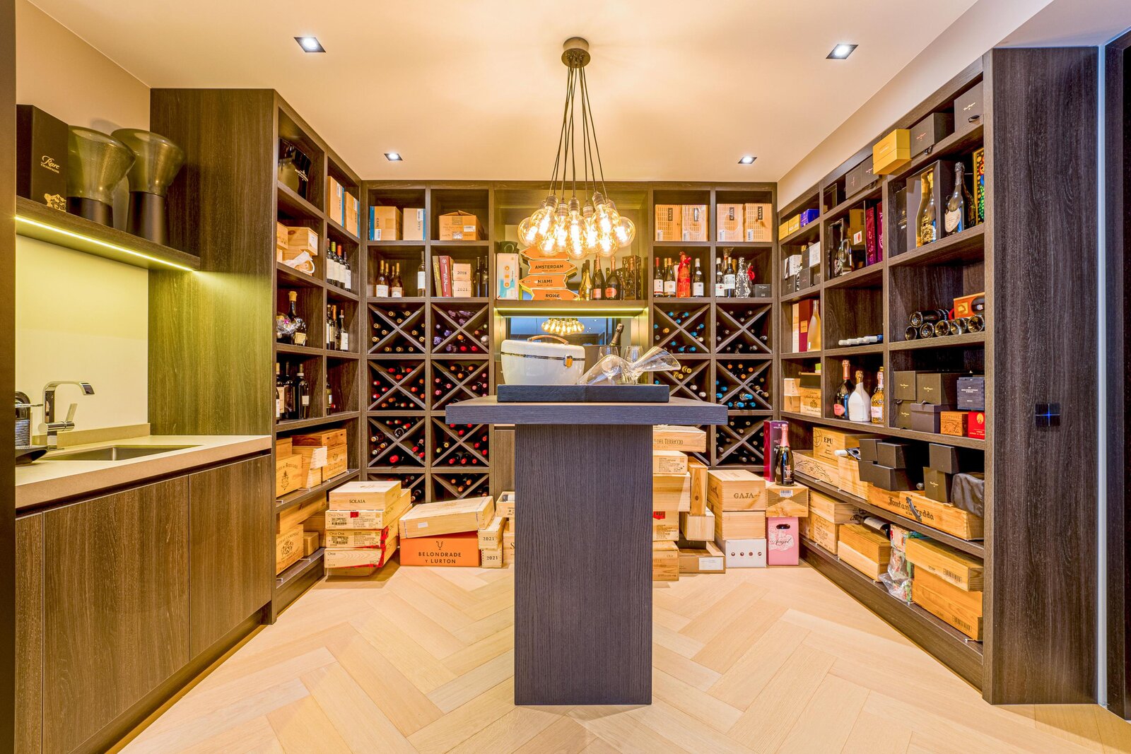 • Wijnkelder met maatwerk stellingwerk, koelkast en spoelunit