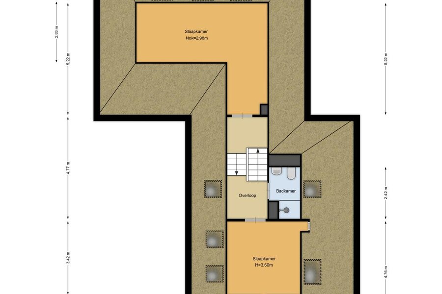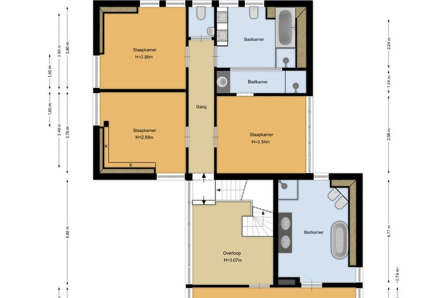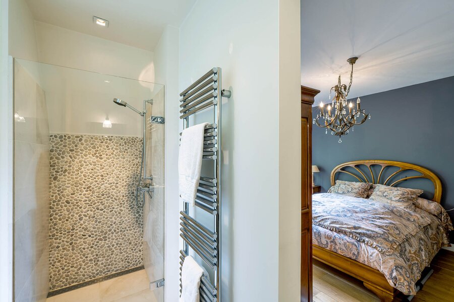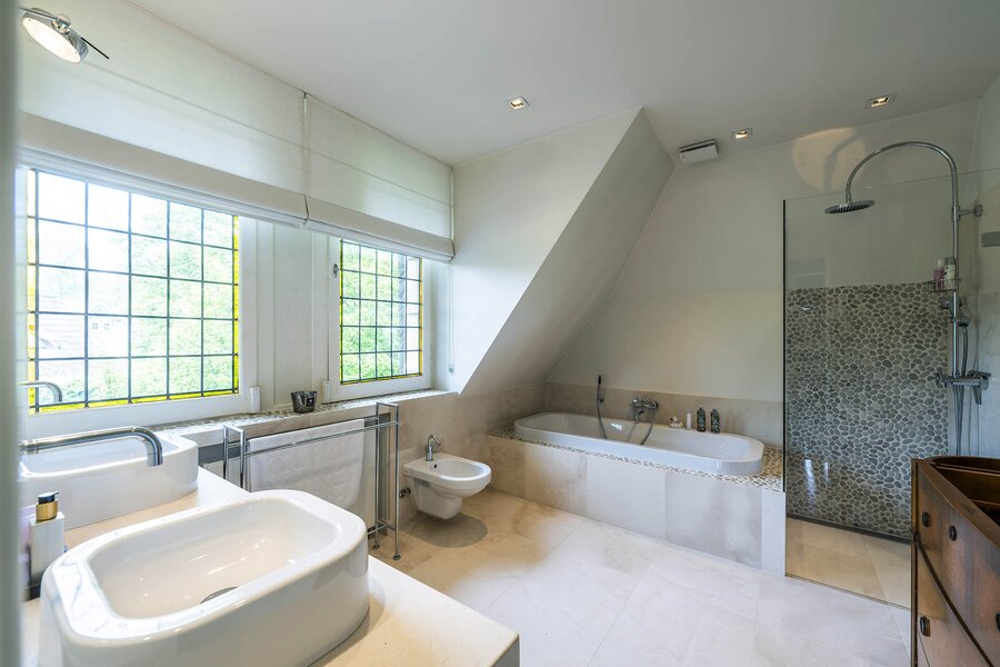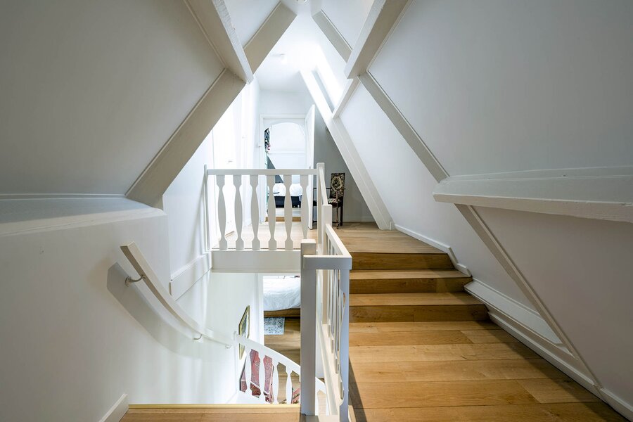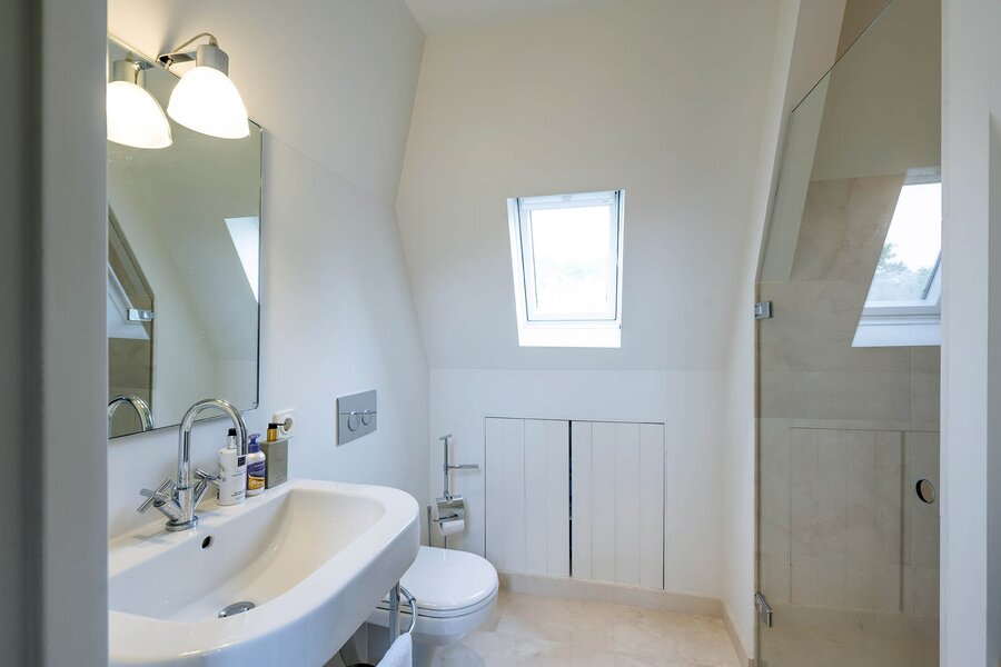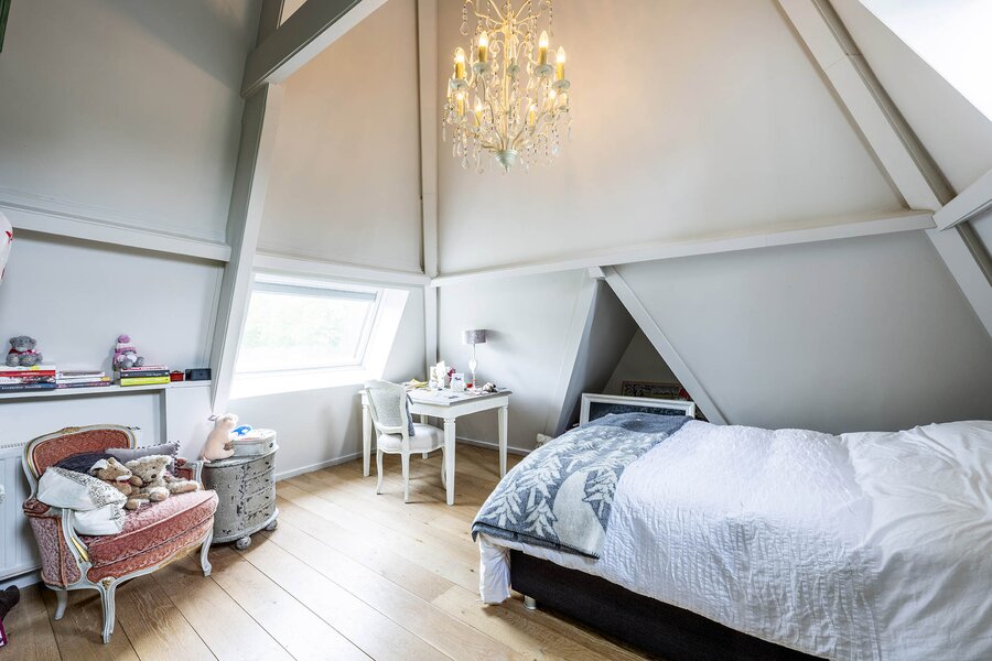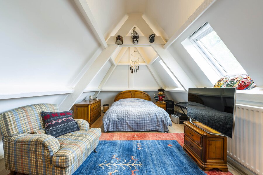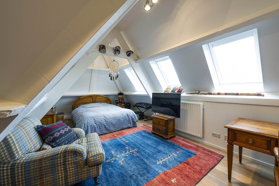 Op deze bovenste etage bevinden zich nog twee royale slaapkamers, een aparte badkamer met toilet, wastafel en douche en een grote zolderruimte – ideaal als extra slaap-, hobby- of werkruimte.