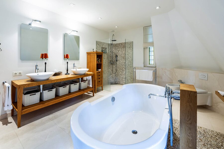 Middels de fraaie royale trap, bereikt u de eerste verdieping. Deze biedt een royale overloop, een riante ouderslaapkamer met kleedruimte en toegang tot een balkon. Deze slaapkamer heeft een badkamer ensuite, welke is voorzien van een vrijstaand bad, inloopdouche, dubbele vaste wastafel en toilet. Aan de andere zijde van de overloop, bevinden zich drie ruime slaapkamers, twee luxe badkamers, een separaat toilet en een vaste trap naar de tweede verdieping.