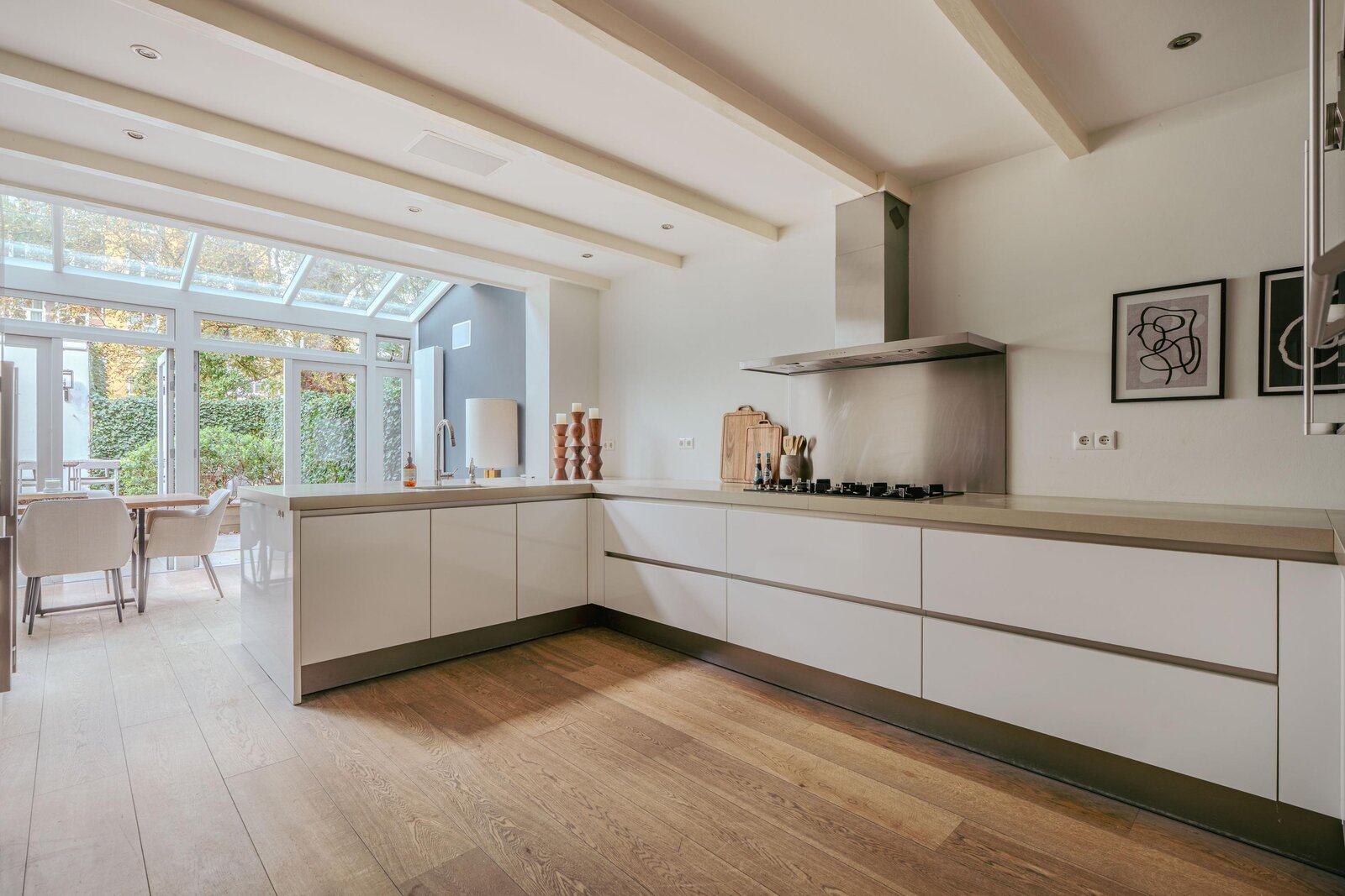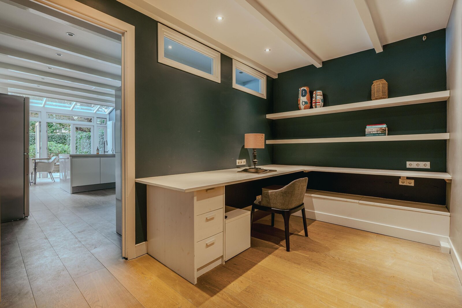Op de benedenverdieping bevindt zich een ruime keuken met aansluitend een eetkamer, direct grenzend aan de tuin. De eetkamer is volledig gelegen in de uitbouw en geheel van glas voorzien, waardoor er bijzonder veel natuurlijk licht binnenvalt. Grenzend aan de keuken ligt een ruime werkkamer, ideaal voor werk of studie. Daarnaast is er een slaapkamer met en-suite badkamer, perfect als gastenverblijf. De praktische functionele bijkeuken biedt ruimte voor wasapparatuur en opslag, terwijl een apart toilet en een ruime berging voorzien van wijnkoeler het geheel compleet maken.