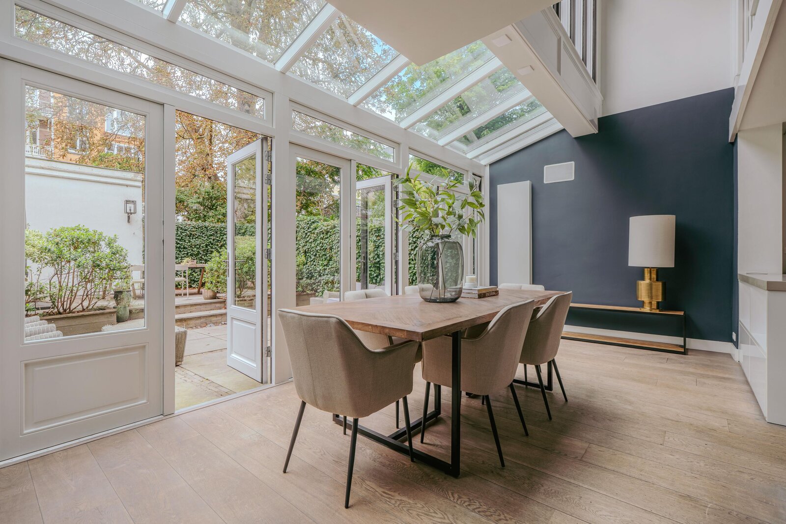 The lower floor features a generous kitchen with an adjoining dining area, directly connected to the garden. The dining area is fully located in the glass extension, allowing exceptional natural light to fill the space. Adjacent to the kitchen is a spacious study, ideal for work or study. There is also a bedroom with an en-suite bathroom, perfect as a guest room. The practical utility room provides space for laundry and storage, while a separate toilet and a large storage room equipped with a wine cooler complete this level.