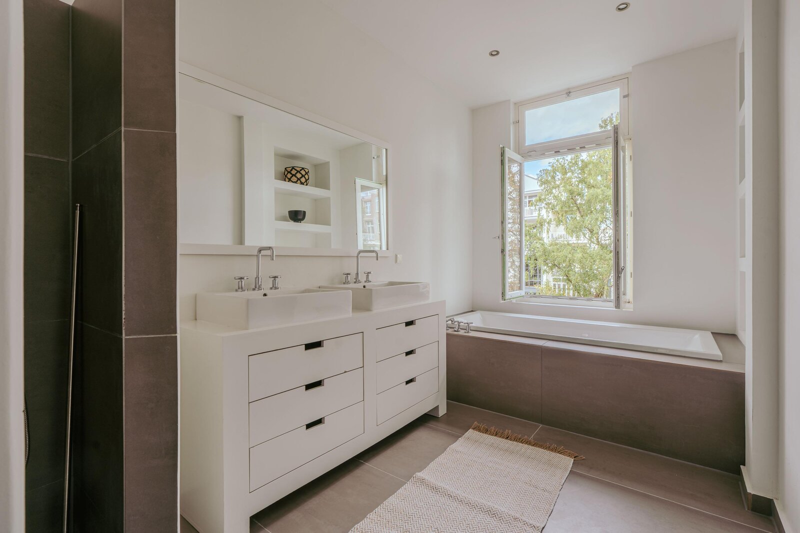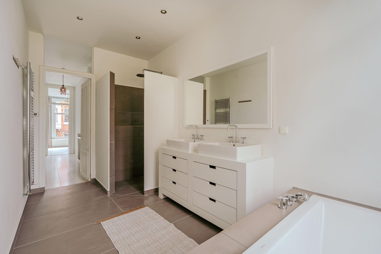Op de bovenverdieping bevinden zich twee riante slaapkamers, waarvan één met een royale inloopkast en directe toegang tot een balkon met fraai uitzicht op de tuin. De moderne, elegant afgewerkte badkamer is voorzien van een ligbad, inloopdouche en dubbele wastafel. Daarnaast is er een derde, knusse slaapkamer die uitstekend kan dienen als tweede werkruimte of logeerkamer. Op deze verdieping bevindt zich tevens een apart toilet.