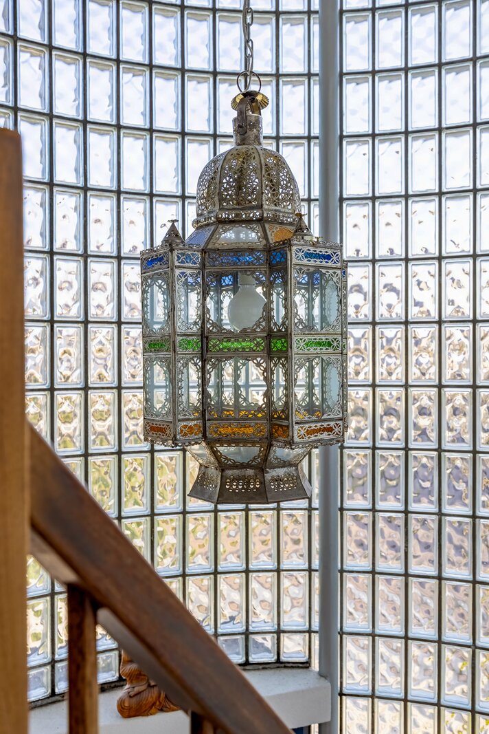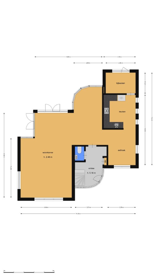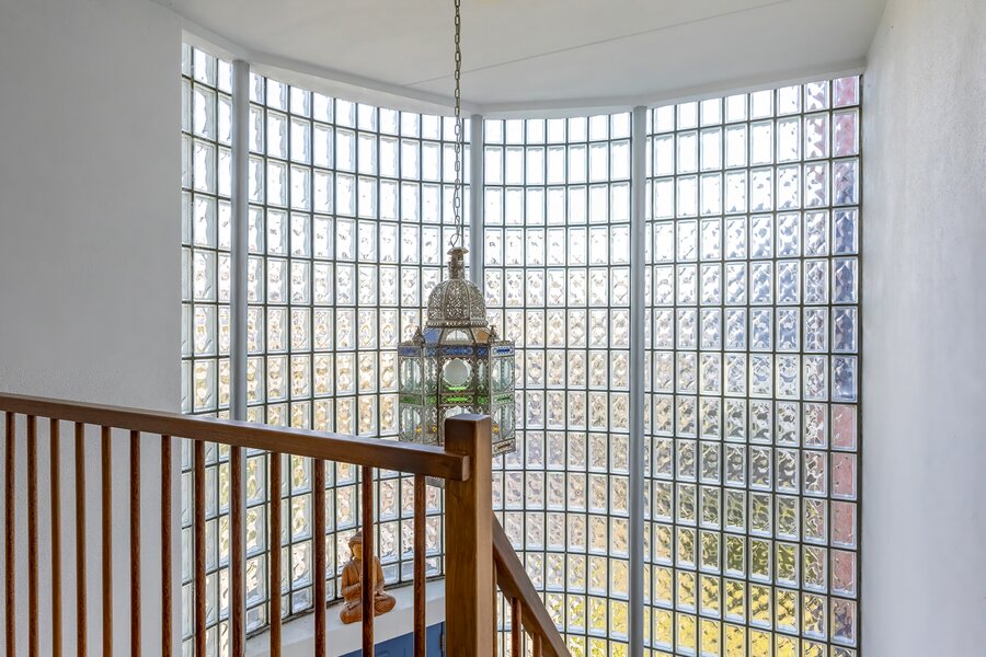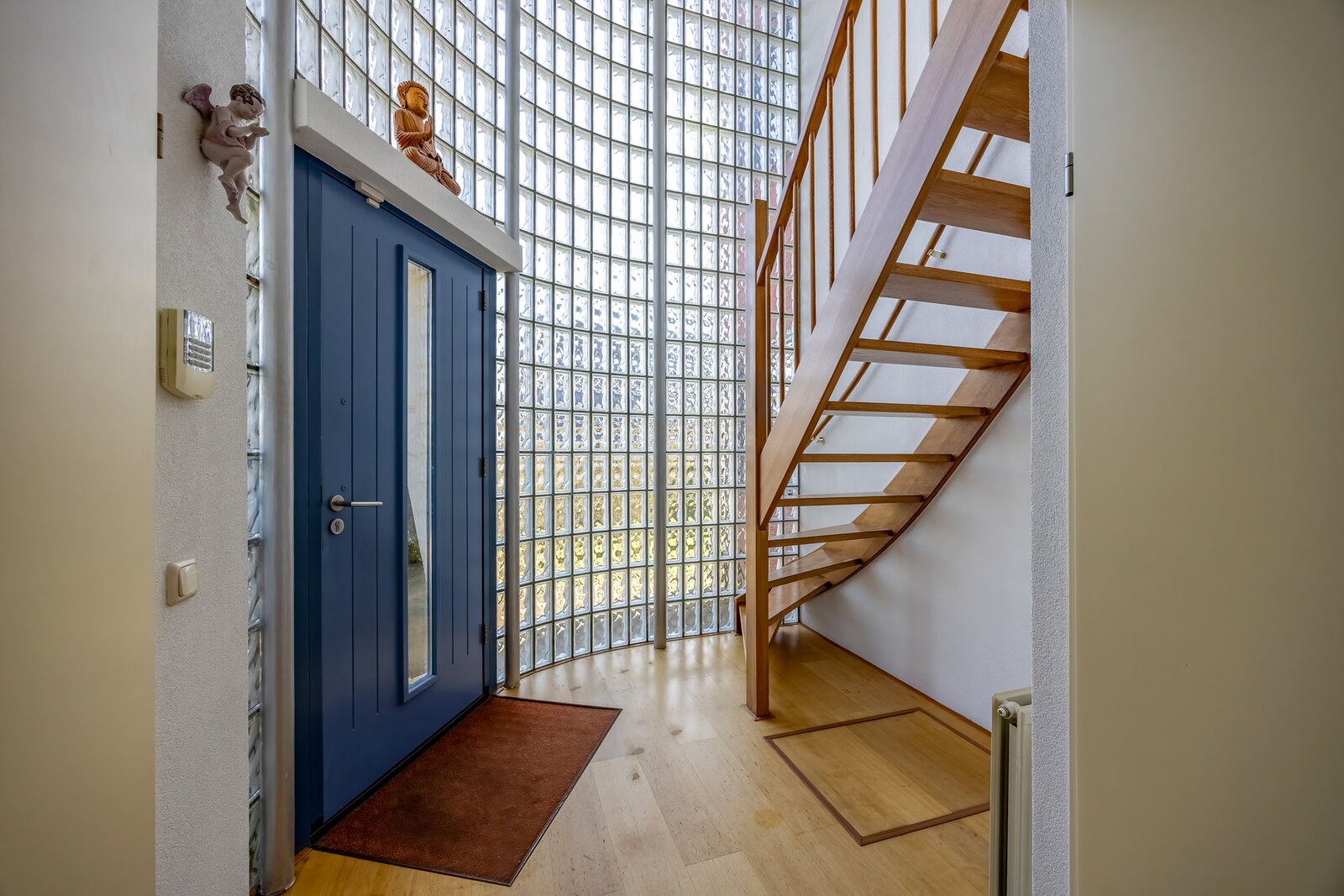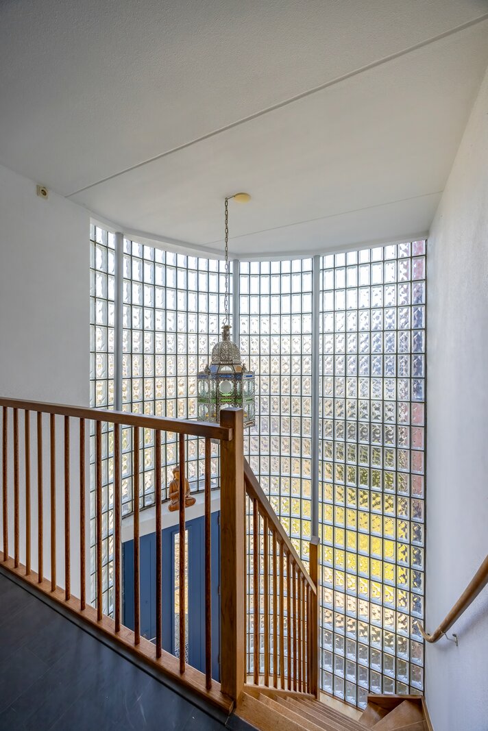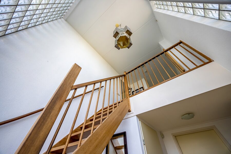 Begane grond: Binnenkomst in de hal/entree met een unieke plafondhoogte van ca. 5,2 meter. Deze ruimte ontvangt veel daglicht dankzij de glazen bouwstenen. De hal heeft een meterkast, garderobe, toilet en toegang tot de leefruimte. Aan de rechter zijde is de eethoek met aansluitend de halfopen keuken en bijkeuken met CV ketel. Via de bijkeuken is de achtertuin bereikbaar. De woonkamer aan de linkerzijde biedt volop ruimte om een grote eettafel te plaatsen aan de achterzijde. De woonkamer heeft openslaande deuren naar de achtertuin en loggia en een sfeervolle serre.