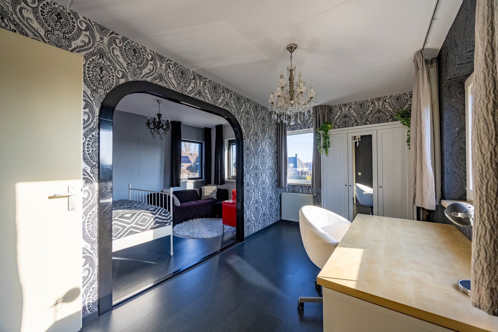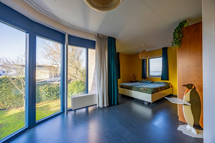 Eerste verdieping: Royale overloop met toegang naar vier slaapkamers, een apart toilet, badkamer en bergruimte. Aan de achterzijde bevindt zich de master bedroom met vrij uitzicht over de achtertuin via een halfronde glazen pui en via het raam aan de zijkant over het Gooimeer. Deze slaapkamer is voorzien van airco. Een tweede slaapkamer aan de voorzijde, ook ideaal als kantoor/werkkamer. De badkamer ertussenin is voorzien van een douche, dubbele wastafel en ligbad. Extra slaapkamer aan de achterzijde met vaste kast en wastafel. Aan de voorzijde een ruime vierde slaapkamer die eenvoudig is om te bouwen tot twee aparte kamers.