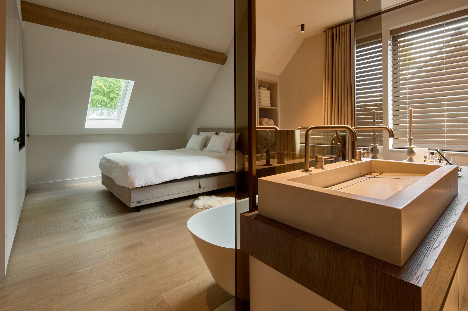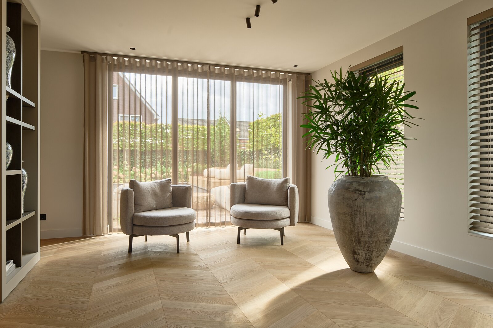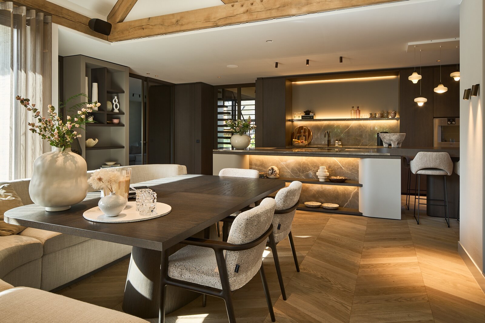 De villa beschikt over een indrukwekkende leefkeuken met marmeren kookeiland en topapparatuur (o.a. Gaggenau, Bora en Quooker), een elegante living, meerdere luxe badkamers en een royale master suite met spa-uitstraling. Hoogwaardige materialen zoals Microtopping, eiken Hongaarse puntvloeren en maatwerk kasten zijn door de gehele woning doorgevoerd.