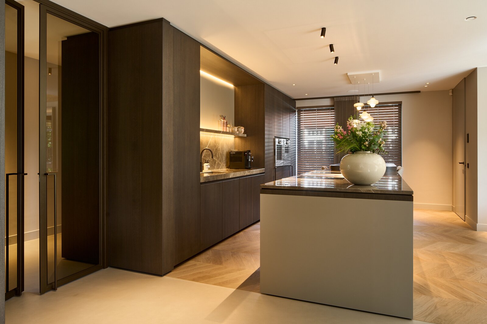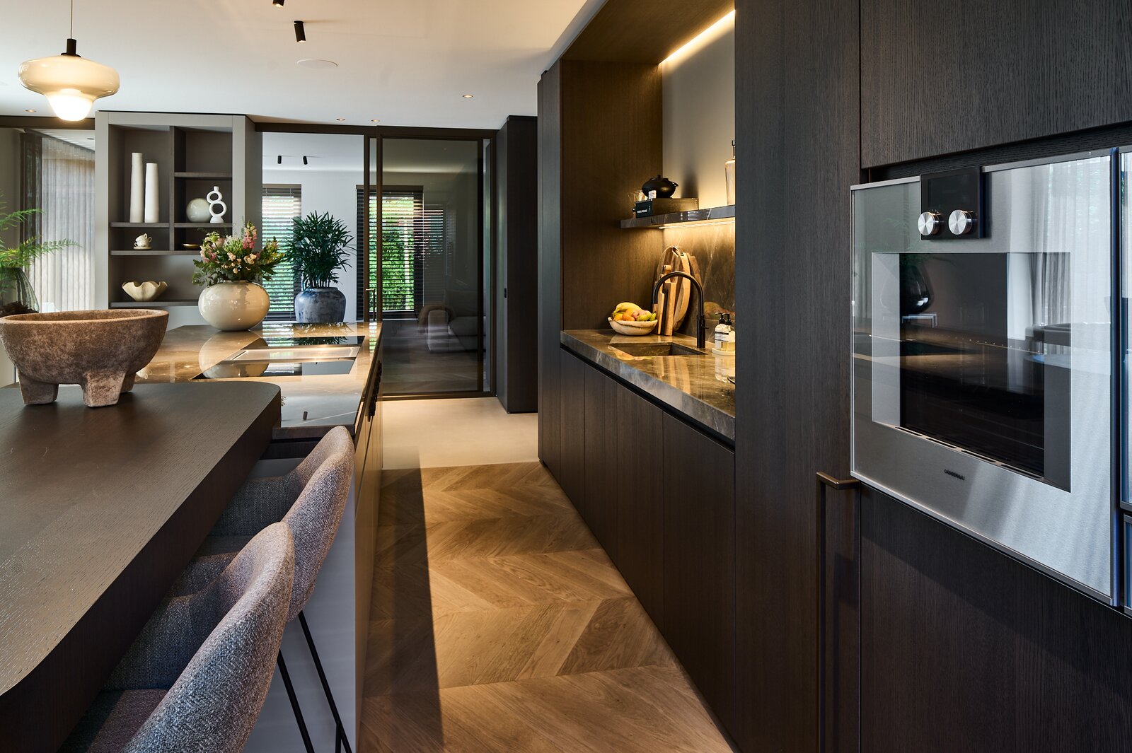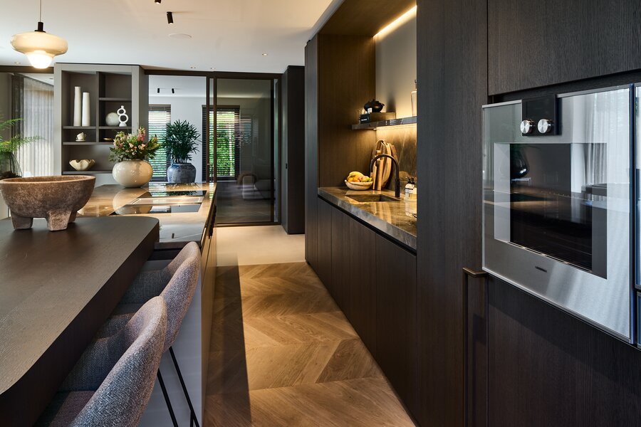 • Keuken voorzien van kookeiland in bookmatched uitvoering met topapparatuur van Gaggenau stoomoven,
