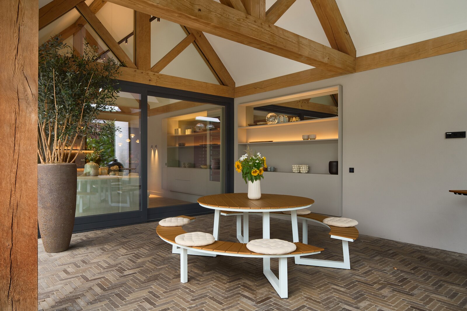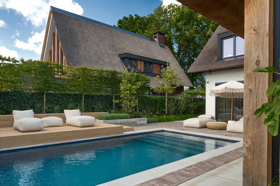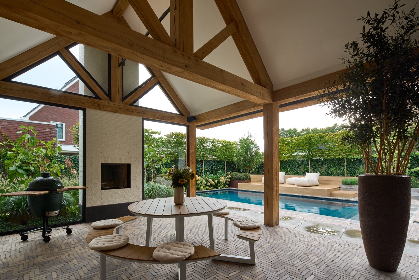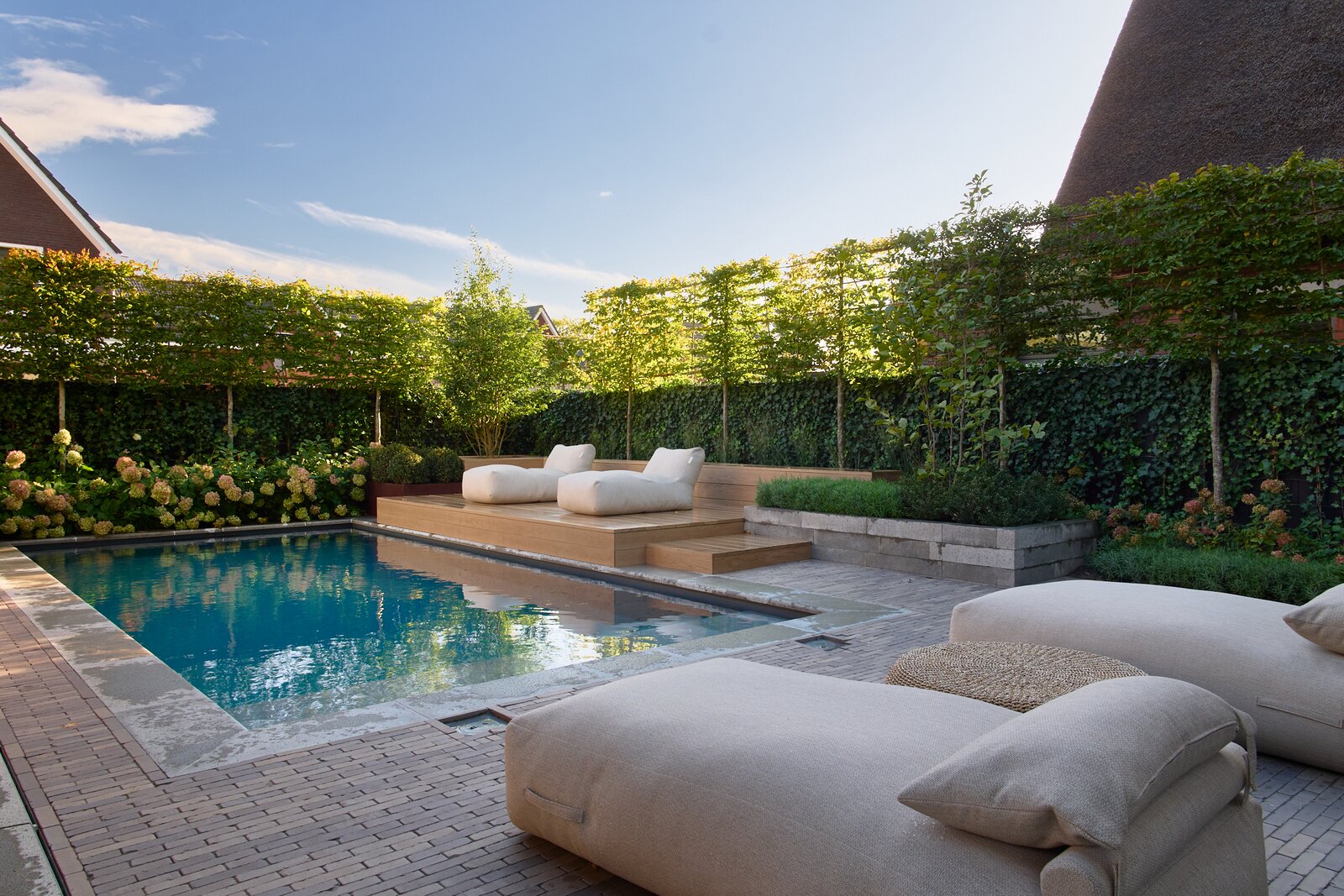 De onder architectuur aangelegde tuin, ontworpen door Knops Tuindesign, vormt een waar buitenparadijs met zelfreinigend zoutwaterzwembad, loungeplateau, veranda met Kalfire haard en wellnessvoorzieningen. Veel privacy en perfect afgestemd op de woning.
