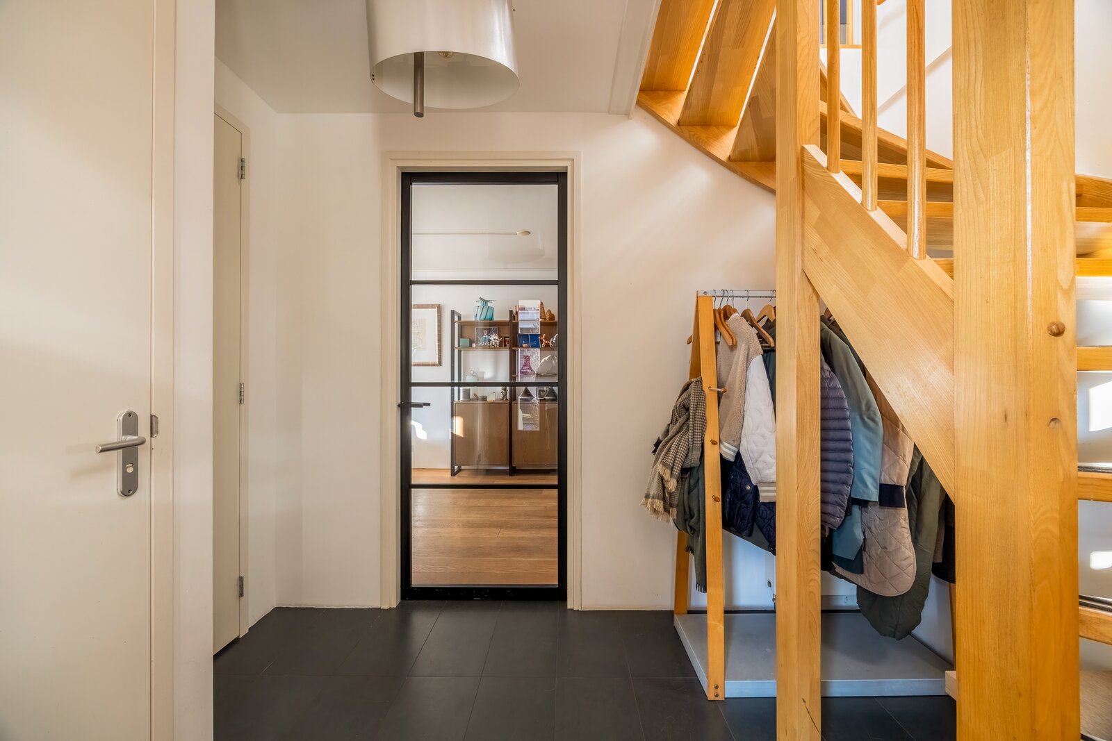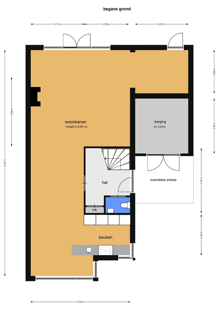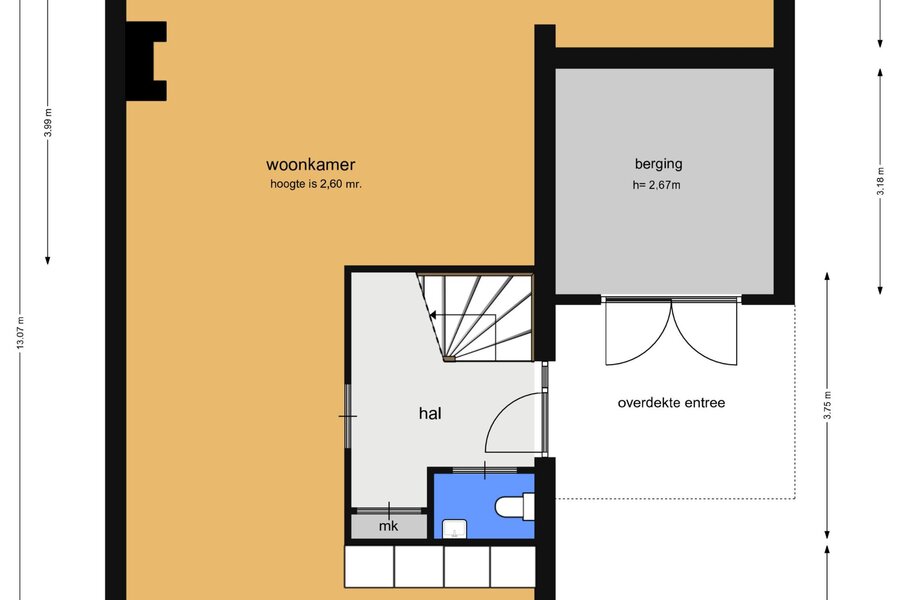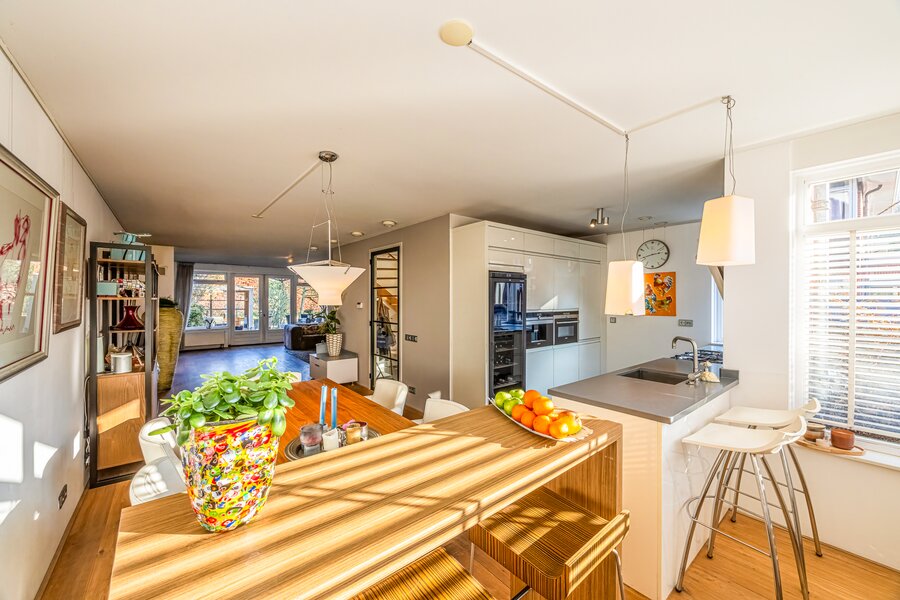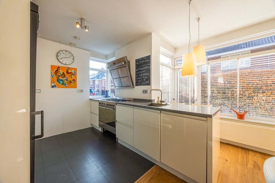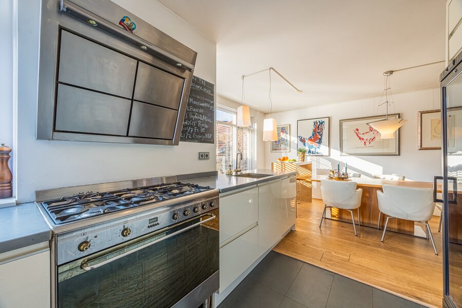 Aan de voorzijde bevindt zich de erker en de moderne, halfopen keuken met diverse hoogwaardige inbouwapparatuur. De voormalige garage is deels bij de woonkamer betrokken, wat zorgt voor extra leefruimte; het resterende gedeelte functioneert als praktische berging met een zelfstandige, overdekte entree aan de voorzijde.