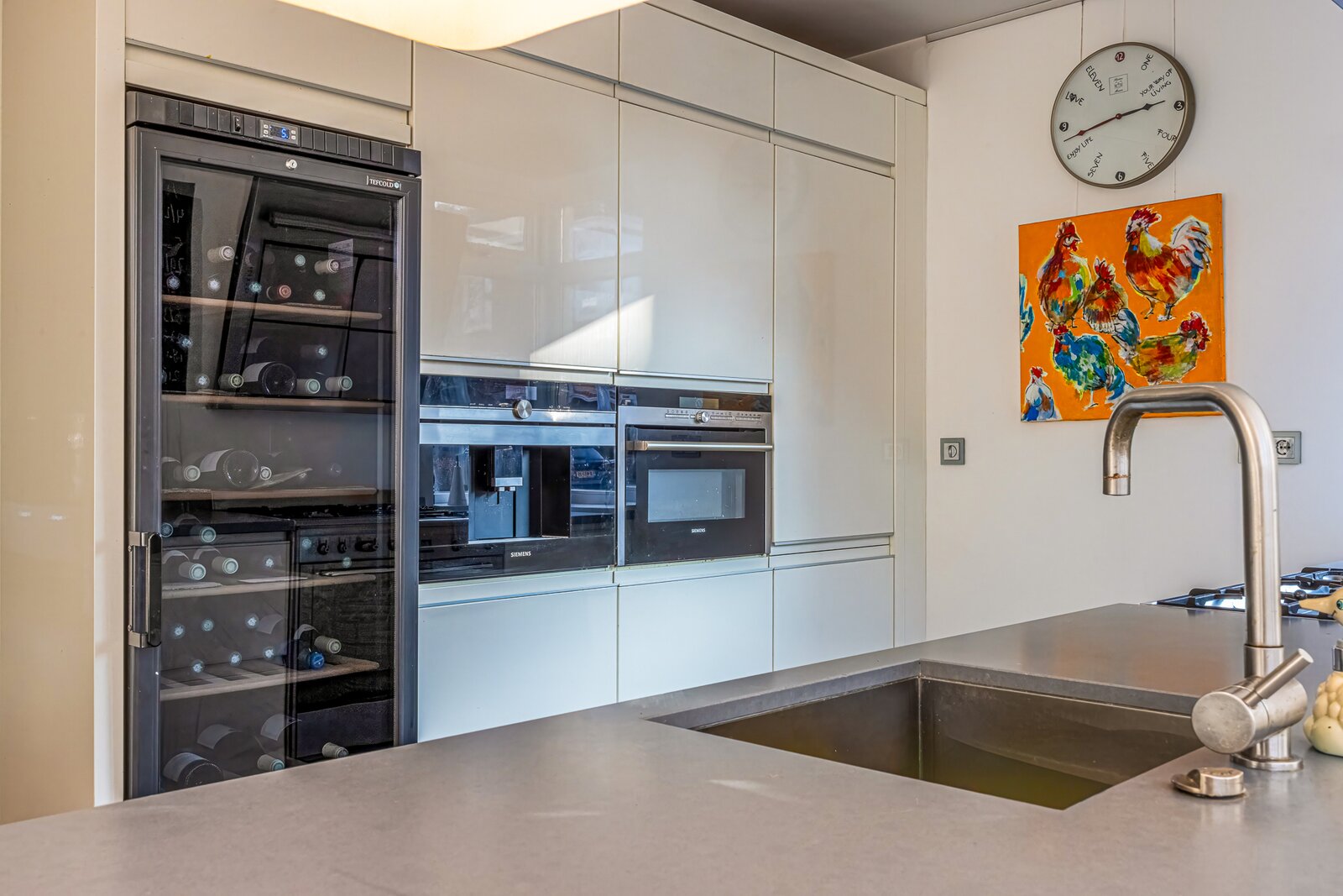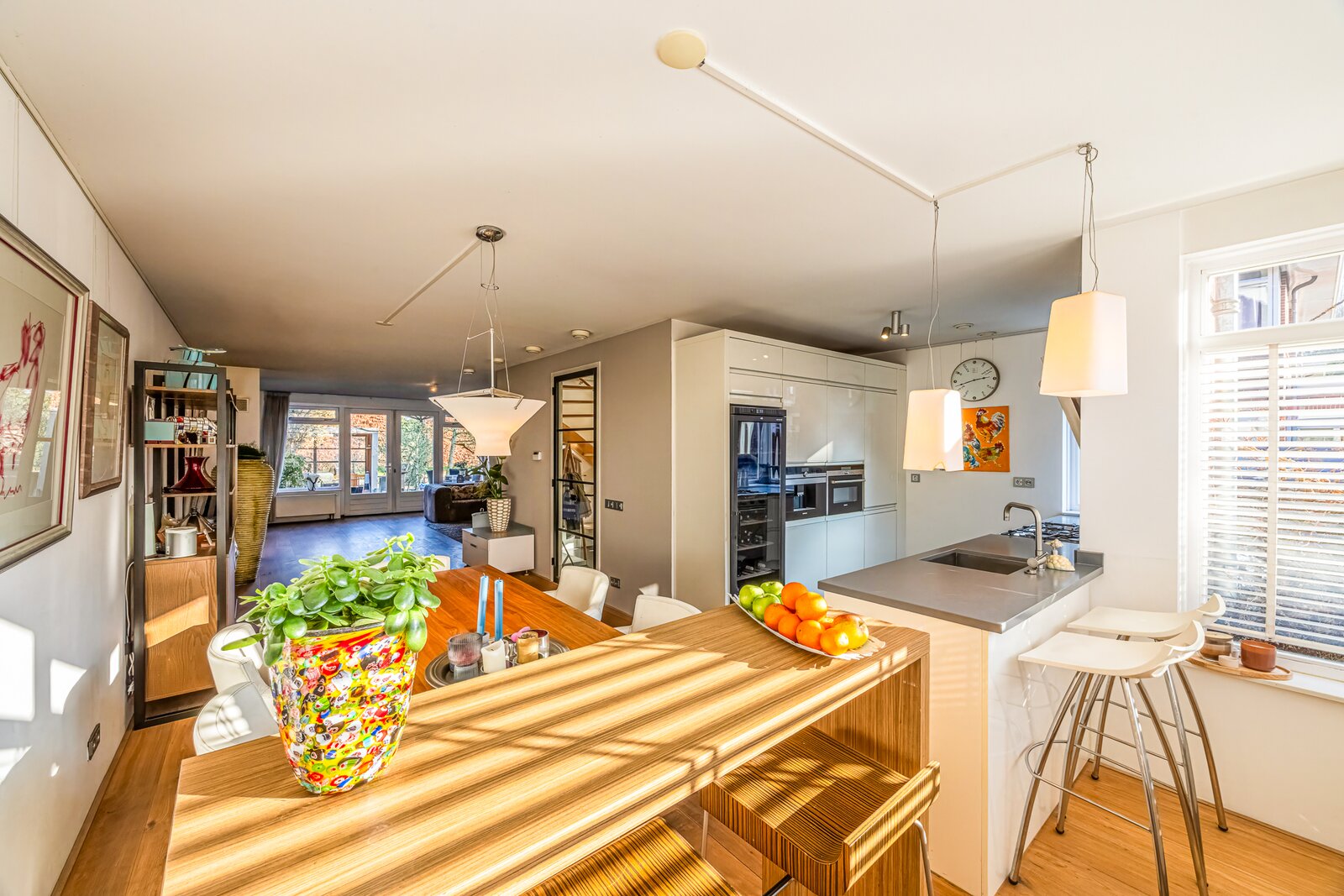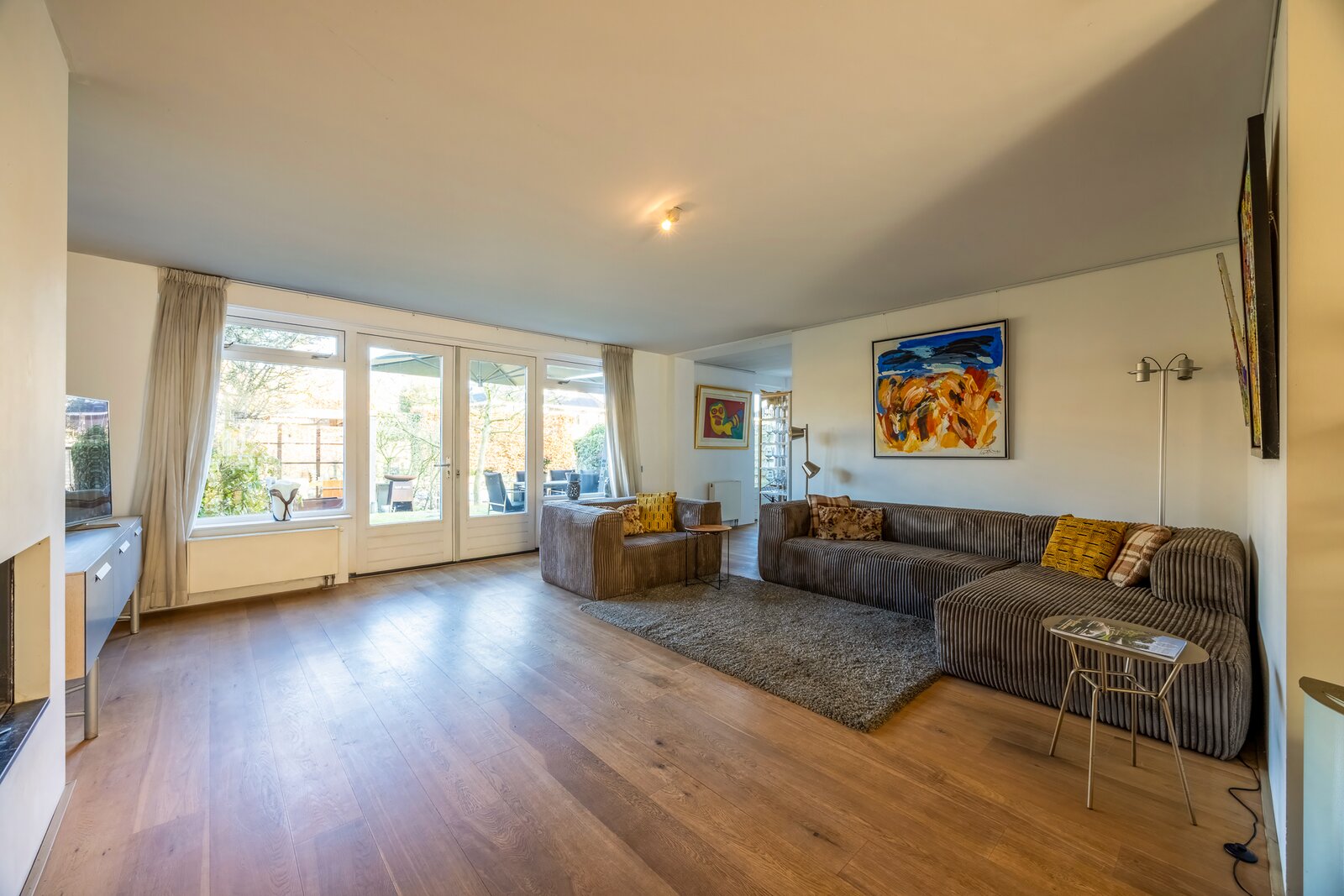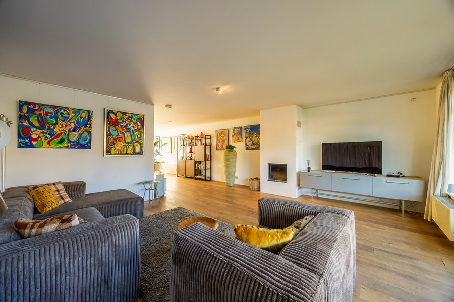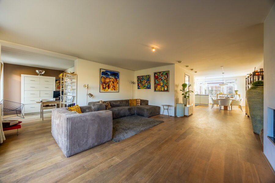 Royale entree met garderoberuimte, meterkast en toilet met fontein. Vanuit de hal komt u in de ruime L-vormige woonkamer met houten vloer en open haard, die zorgt voor een warme en uitnodigende sfeer. Grote raampartijen en openslaande deuren creëren een mooie verbinding met de tuin en het water.