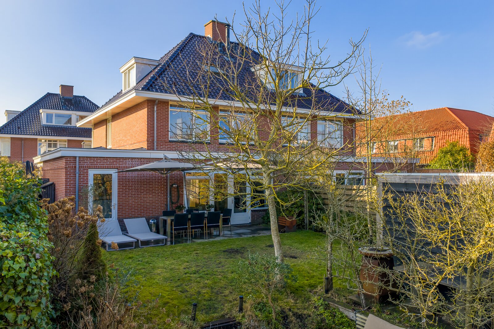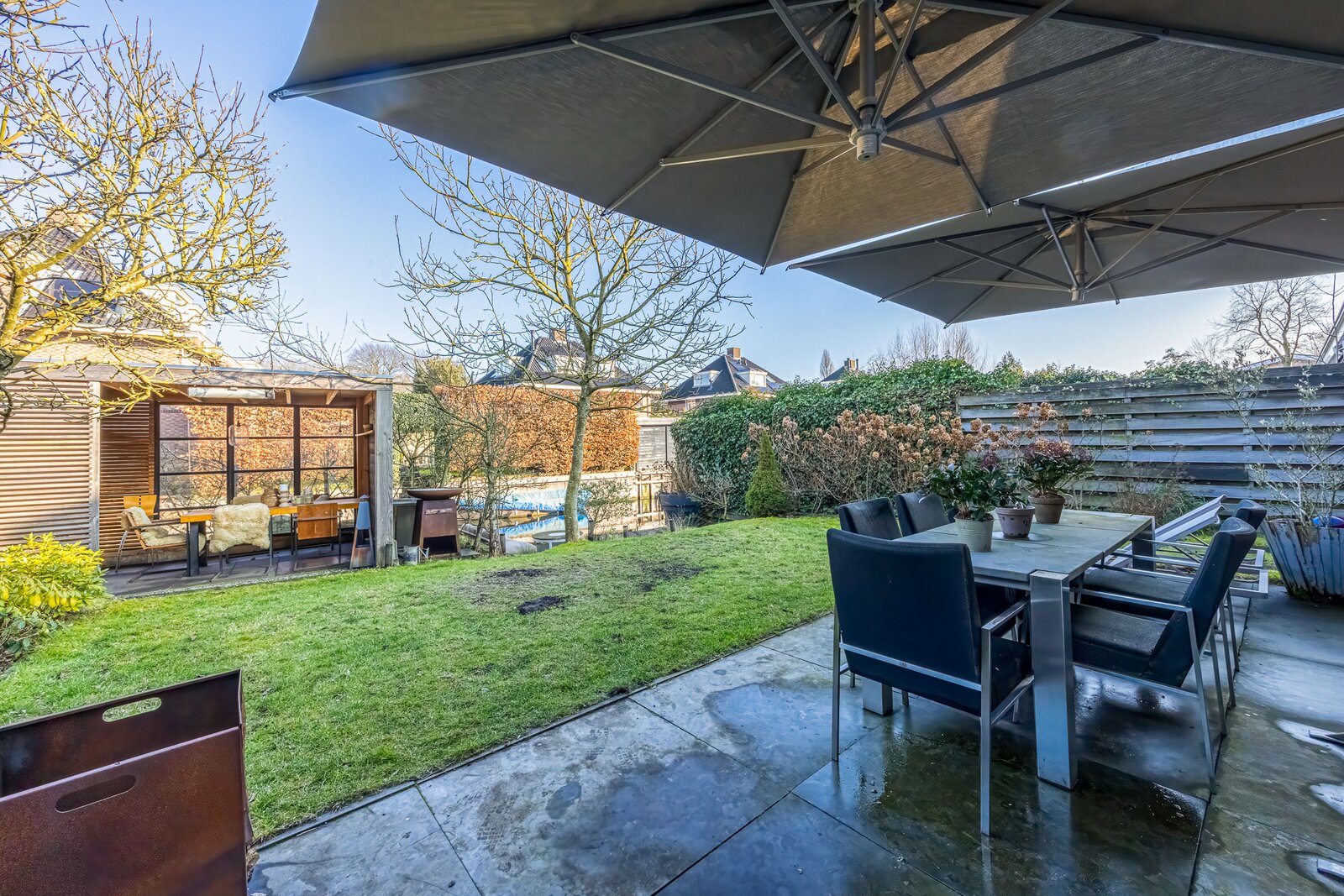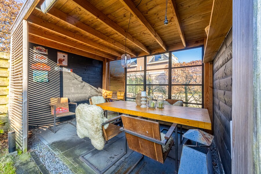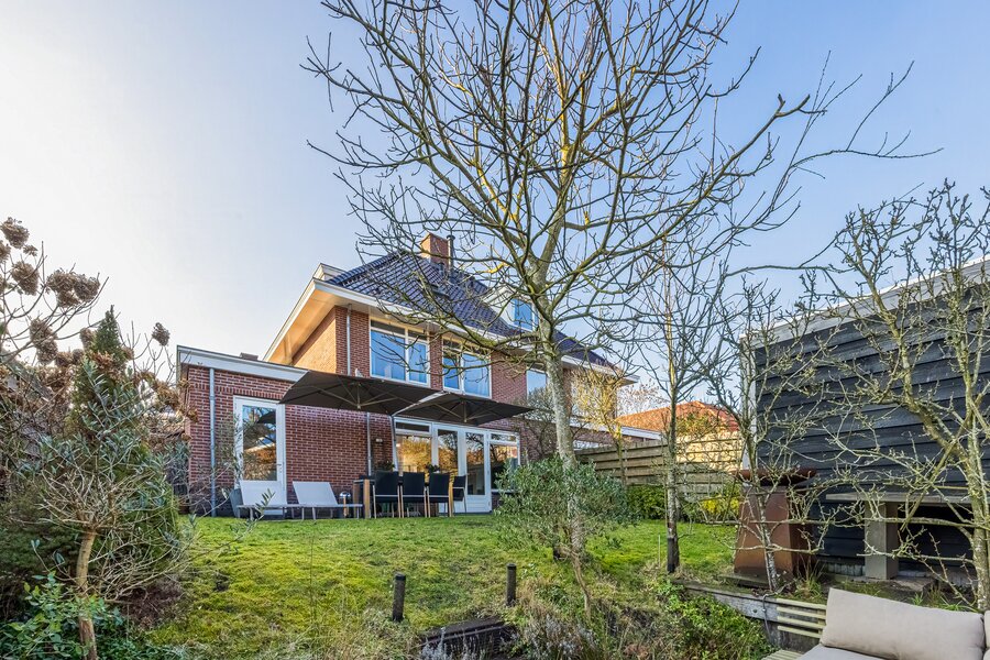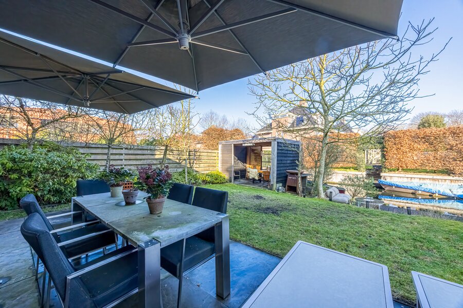 Het terras aan het water en het stijlvolle tuinhuis maken de tuin tot een volwaardige verlenging van het woonhuis: een plek voor lange zomeravonden, ontspannen weekenden en het echte buitenleven.