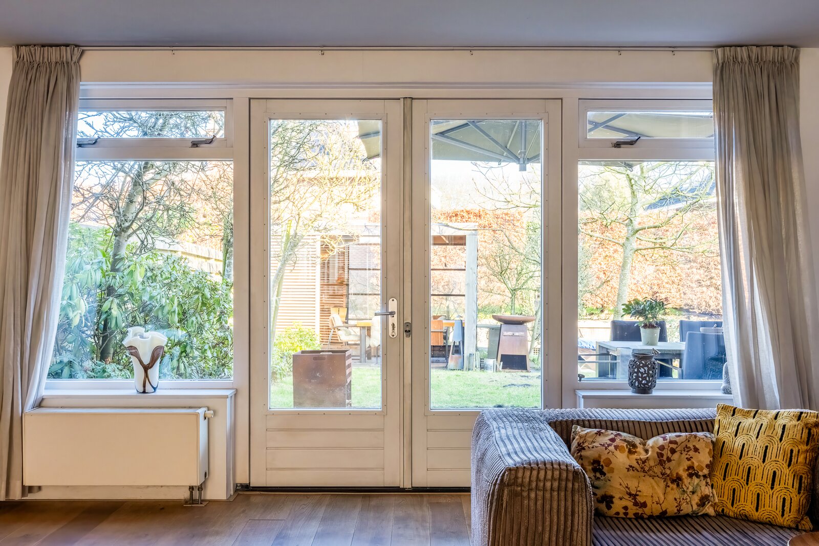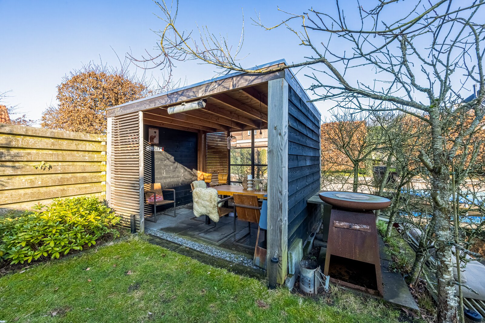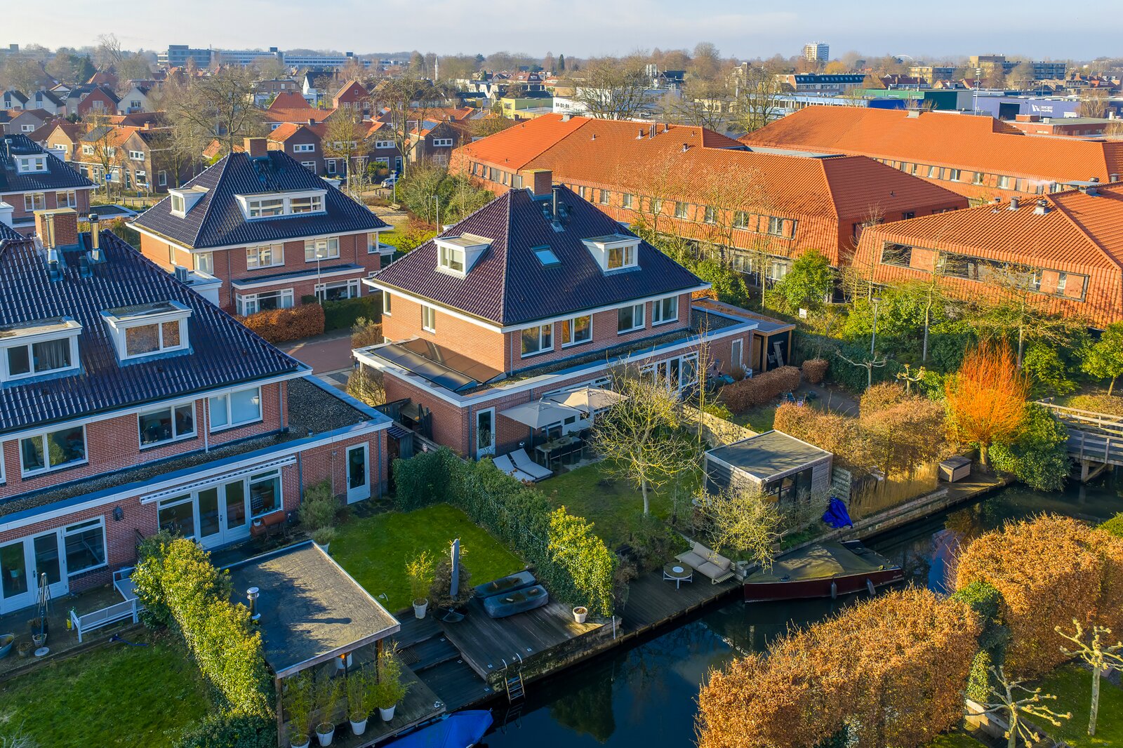 Het terras aan het water en het stijlvolle tuinhuis maken de tuin tot een volwaardige verlenging van het woonhuis: een plek voor lange zomeravonden, ontspannen weekenden en het echte buitenleven.
