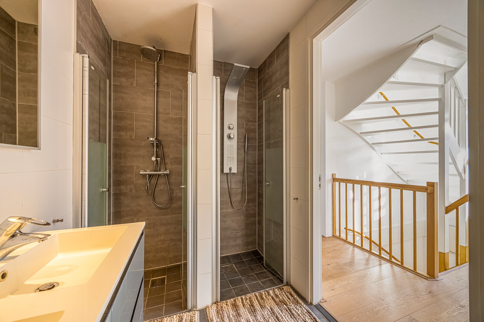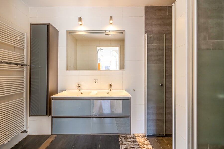 De moderne badkamer is luxe uitgevoerd met twee inloopdouches, wastafelmeubel en zwevend toilet.