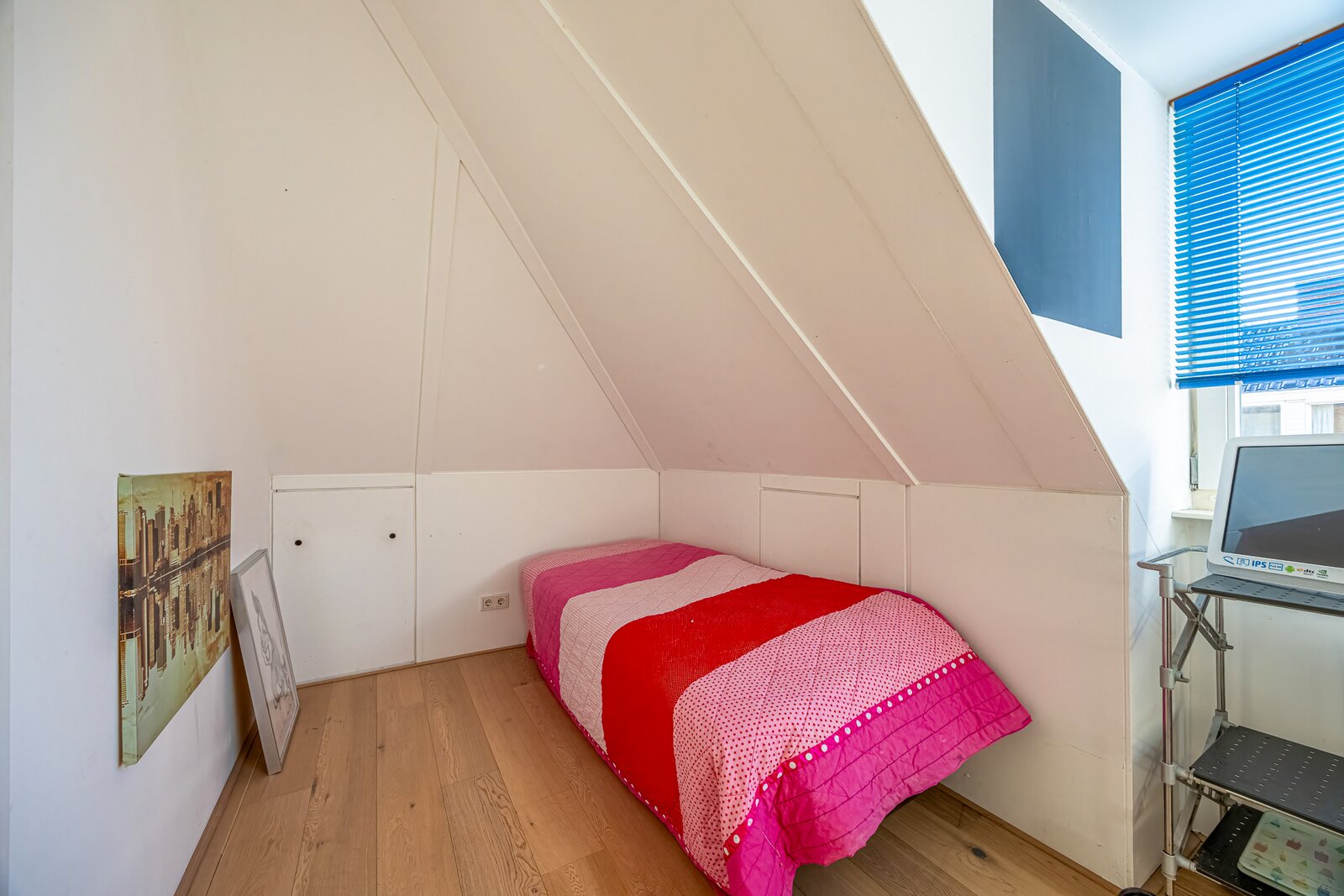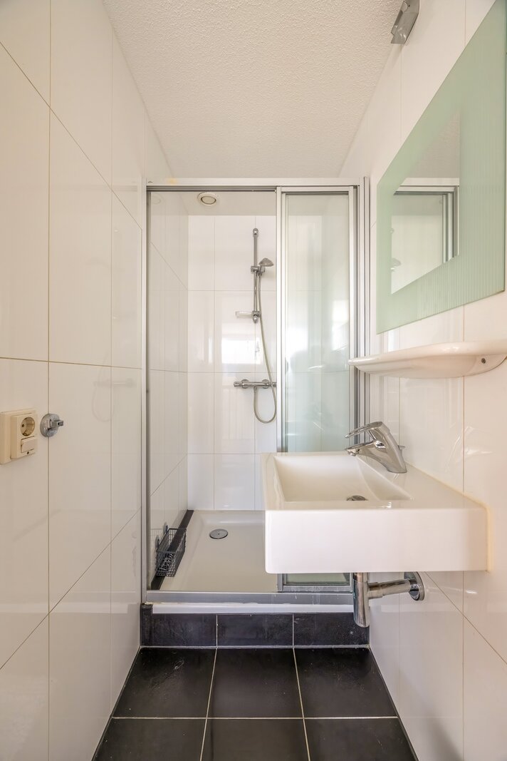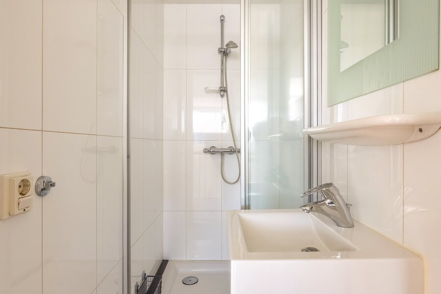 Daarnaast is er een tweede badkamer met douche en wastafel, een separate wasruimte met opstelling voor wasmachine en droger, de cv-installatie en het WTW-systeem. Extra bergruimte is aanwezig in de knieschotten en in de nok van het dak.