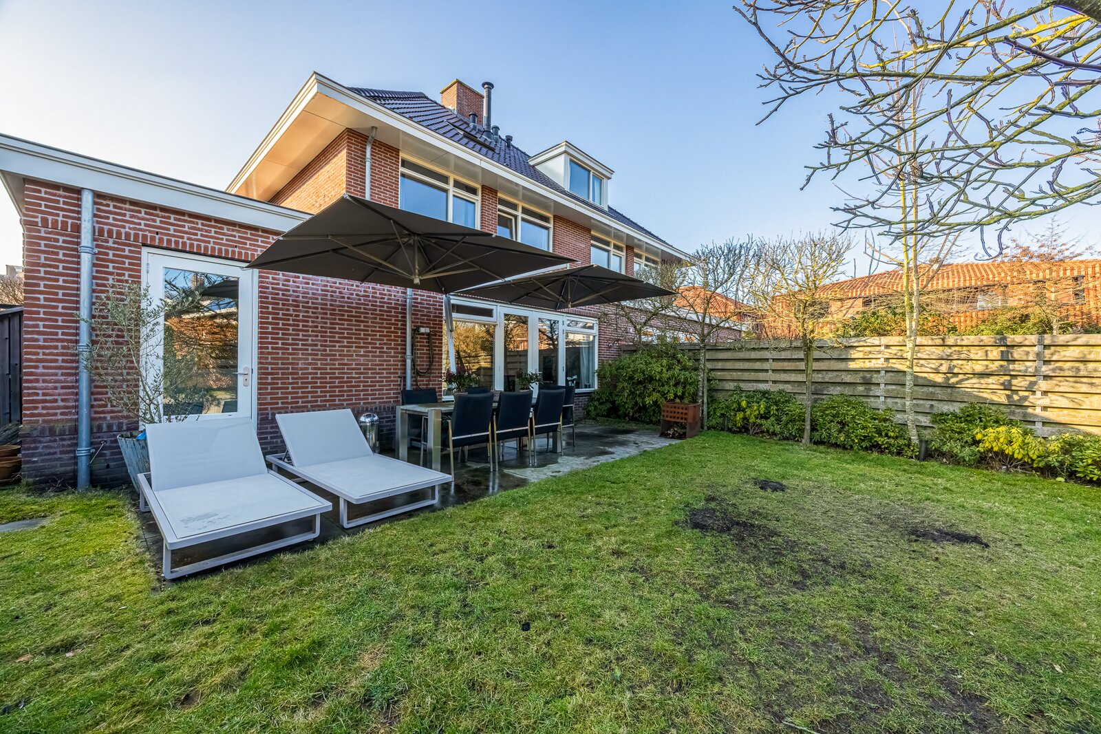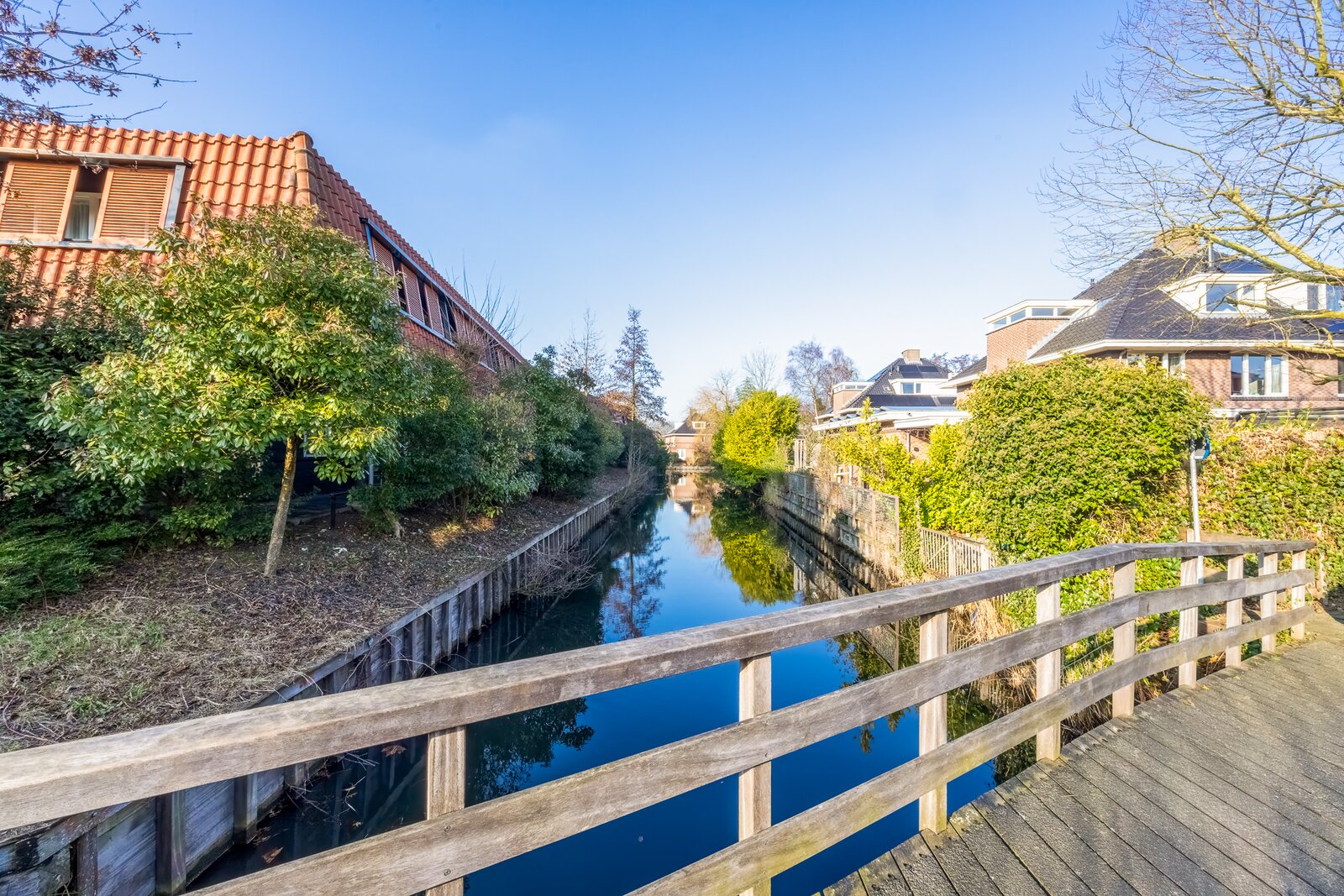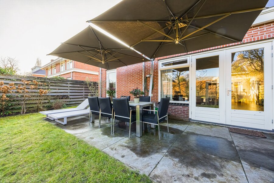 De achtertuin is vrij gelegen, zonnig en direct grenzend aan de Nagtglassloot, een zeldzame kwaliteit in Bussum. Hier beschikt u over een eigen steiger met ligplaats voor een boot, waarmee u direct het vaarwater op kunt richting onder andere de Naarden-Vesting