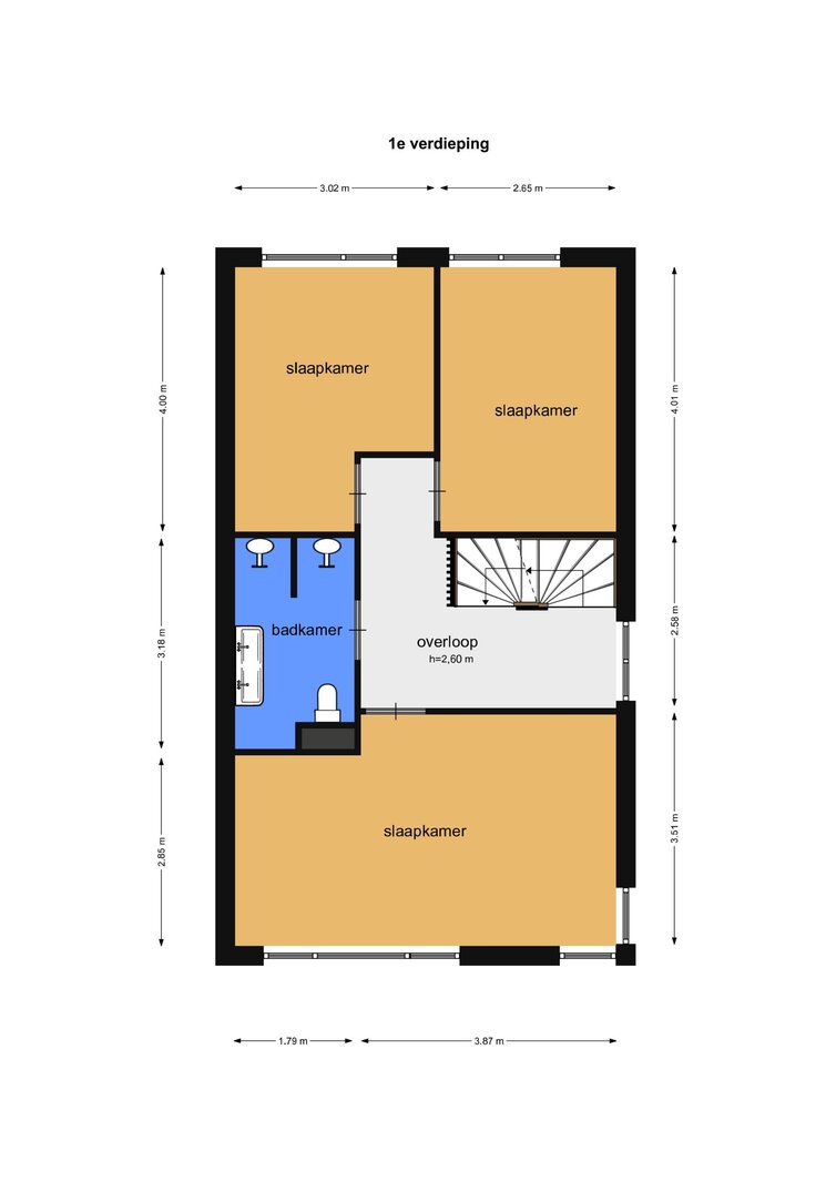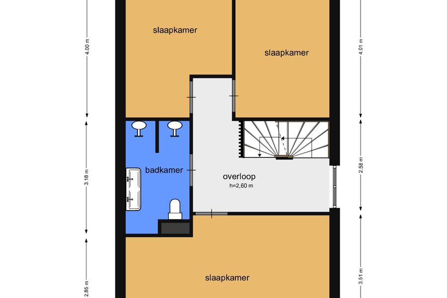 Overloop met toegang tot drie goed bemeten slaapkamers. De ruime master bedroom ligt aan de voorzijde, terwijl de twee slaapkamers aan de achterzijde prettig licht zijn en uitzicht bieden richting de tuin en het water.
