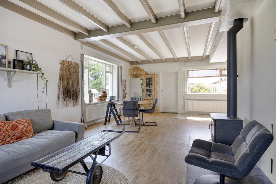 De ruime, lichte woonkamer aan de andere zijde van de woning beschikt over een sfeervolle houtkachel en staat in open verbinding met de keuken.