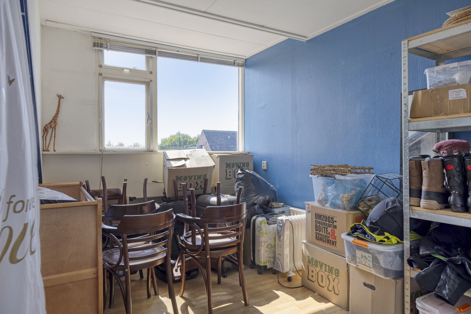 De grote garage (voormalige woonkamer) fungeert momenteel als 'bedrijfsruimte' en bevat een afgesloten ruimte met de cv-opstelling. Hier is eenvoudig weer een woonkamer te realiseren. Verder bevindt zich hier nog een toilet.