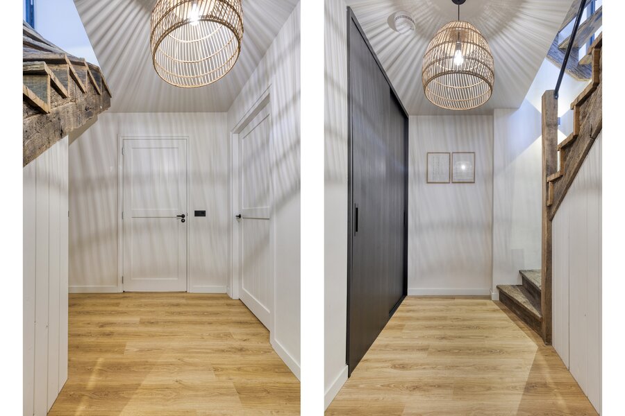 Via de hal naast de keuken heeft u toegang tot de badkamer met douche en toilet, het kantoor op de begane grond en de trap naar de eerste verdieping.