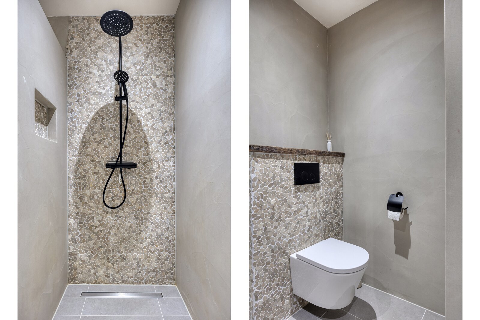 Eerste verdieping: overloop met bergruimte en toegang tot de twee ruime slaapkamers en moderne badkamer met inloopdouche, toilet en wastafelmeubel met 2 natuurstenen waskommen.
