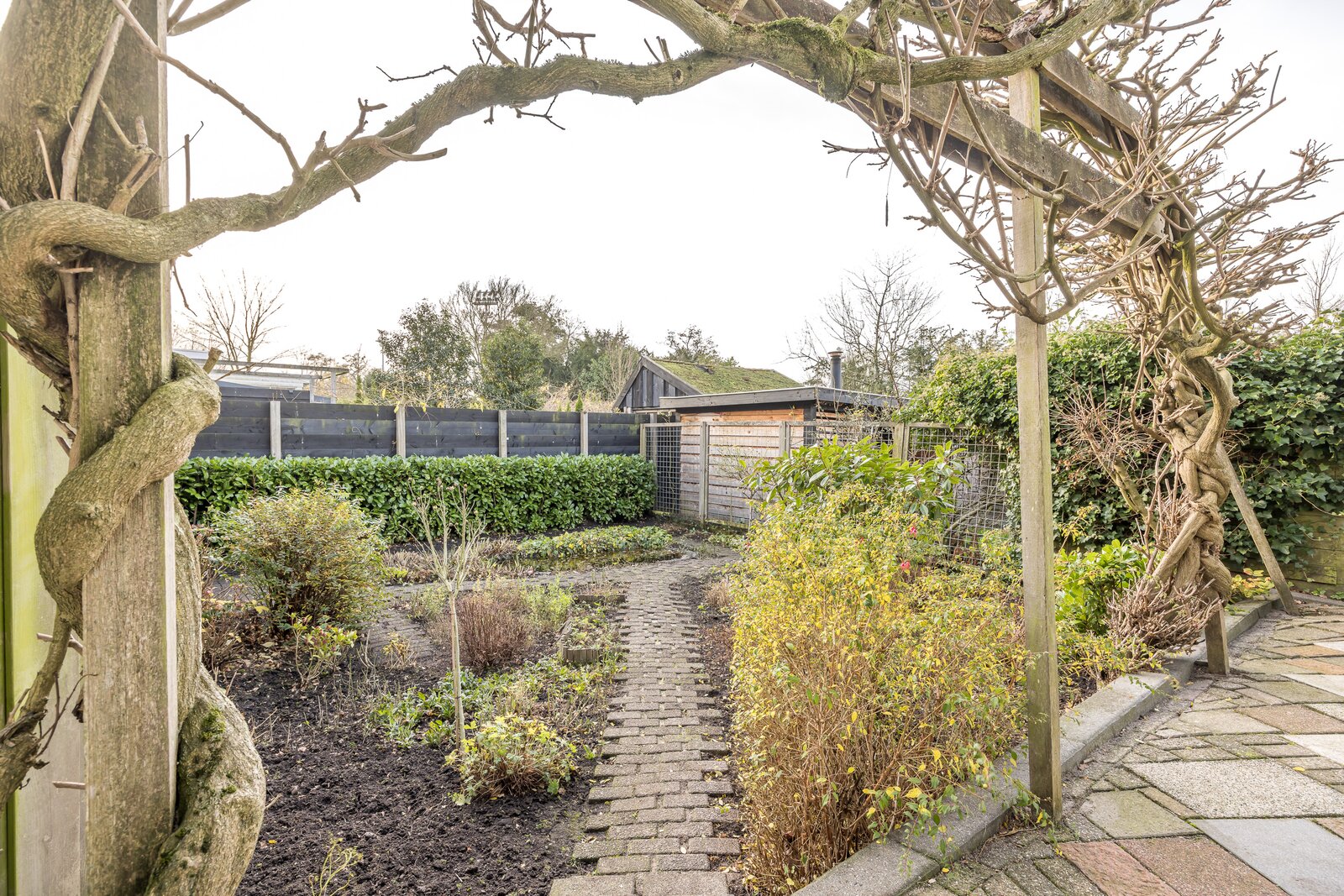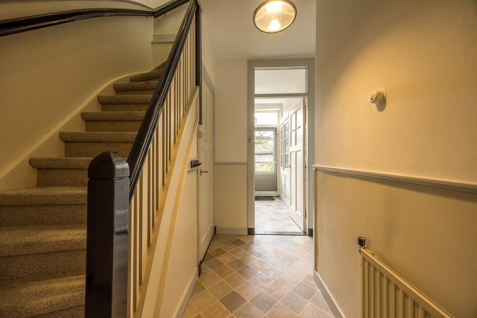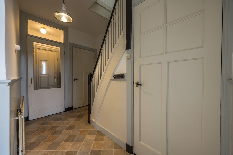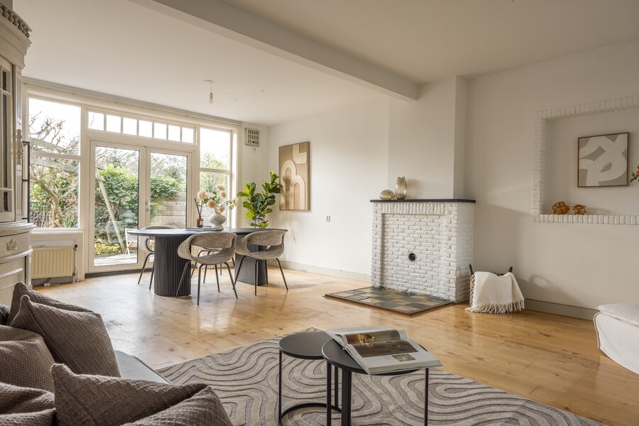 Via de voortuin bereikt u de entree met tochtportaal, gastentoilet en trapkast. Het voorste gedeelte met karakteristieke erker is ingericht als sfeervolle woonkamer, voorzien van een authentieke aansluiting voor een houtkachel. Openslaande deuren geven toegang tot de royale achtertuin op het zuiden, met daarnaast een garage van 19 m² met vide en eigen oprit.