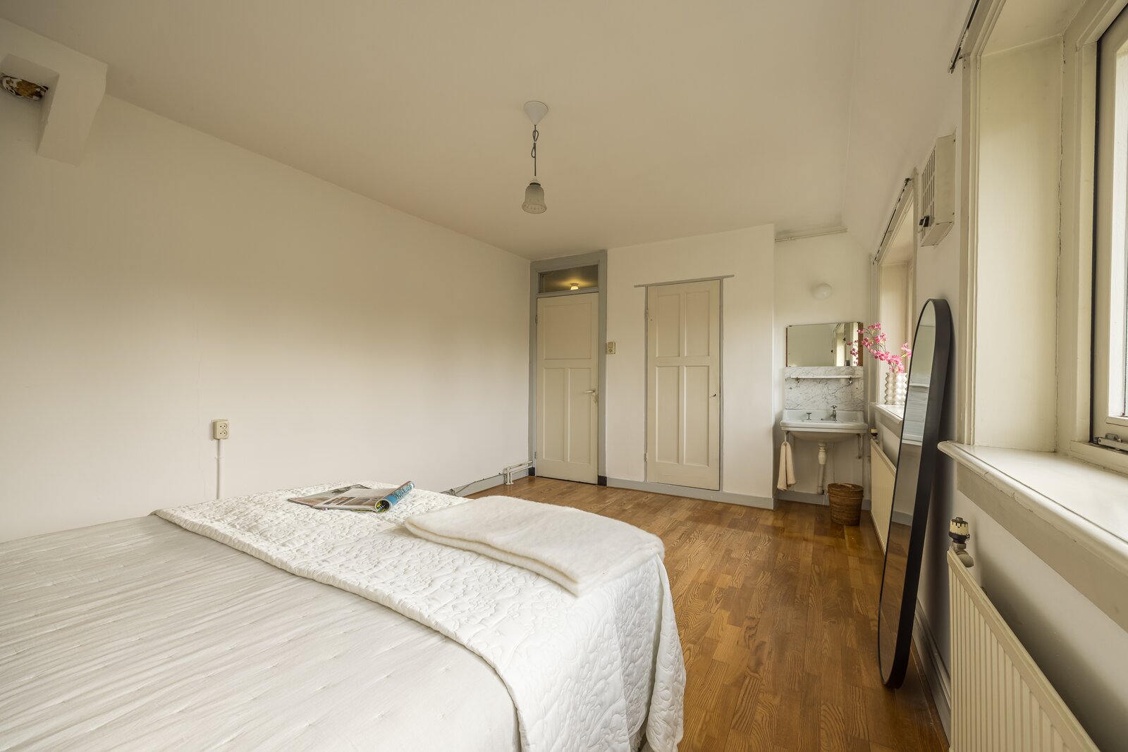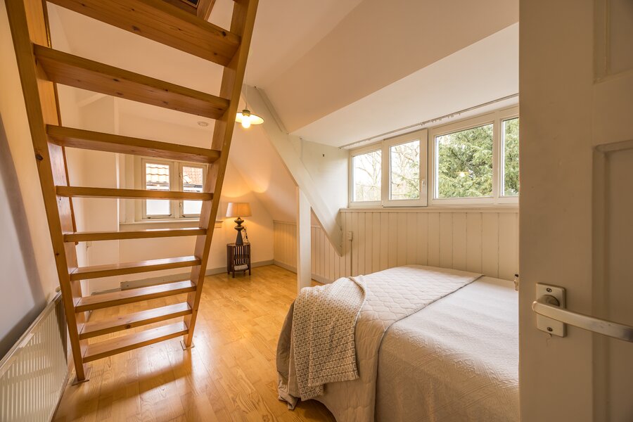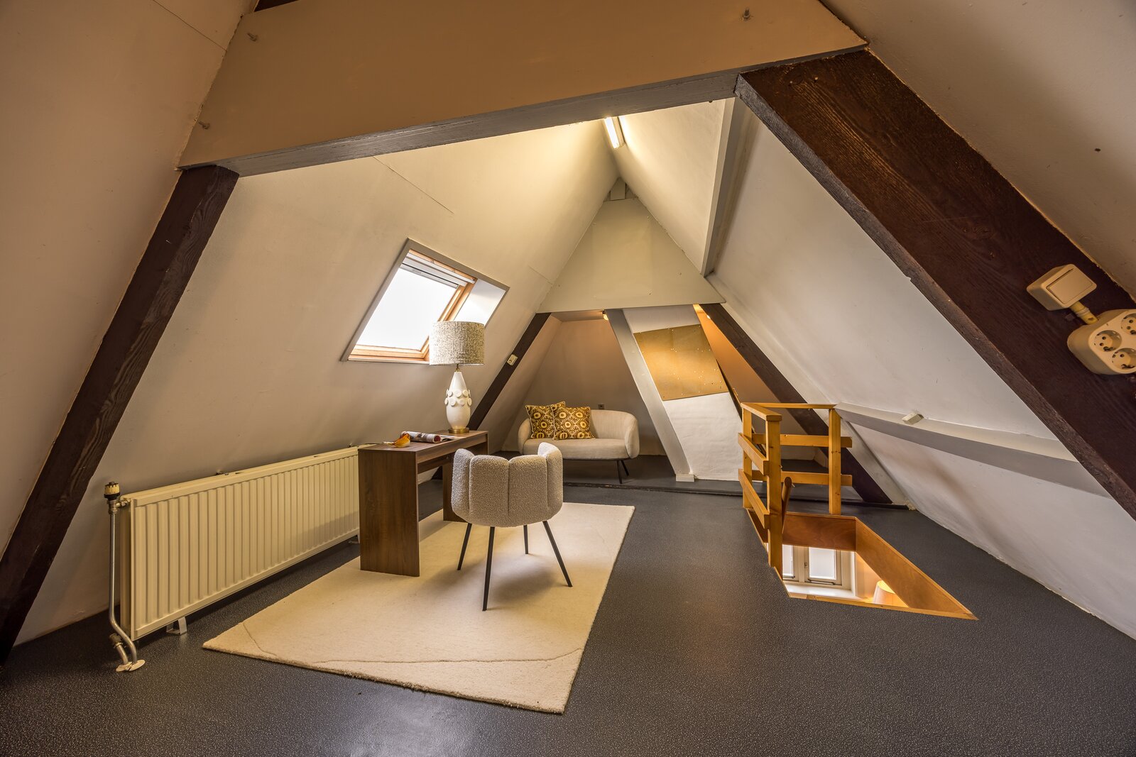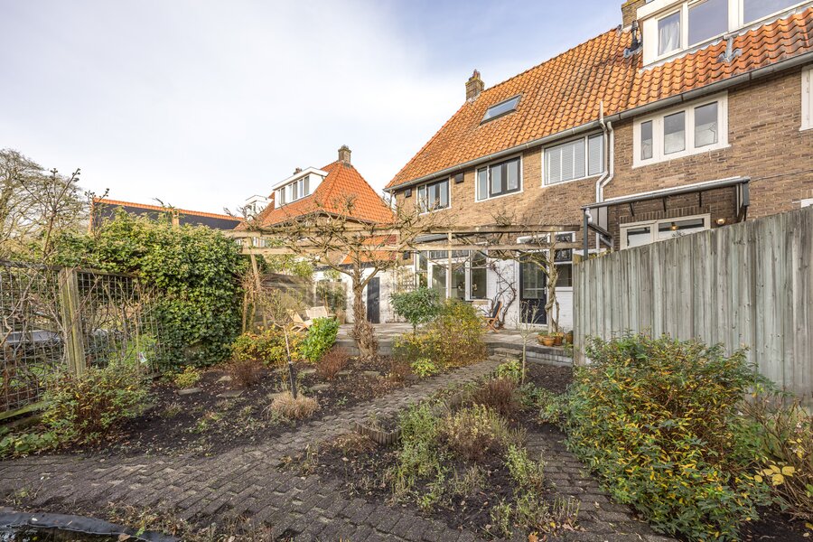 De gesloten keuken heeft de originele indeling en is voorzien van diverse inbouwapparatuur en een achterdeur naar de tuin. Op de eerste verdieping bevinden zich twee ruime slaapkamers, een badkamer met douche en wastafel, en een apart toilet met CV-opstelling. De tweede verdieping biedt een royale zolderkamer met dakraam en een pantry met wateraansluiting, perfect voor een hobbyruimte of kantoor aan huis.