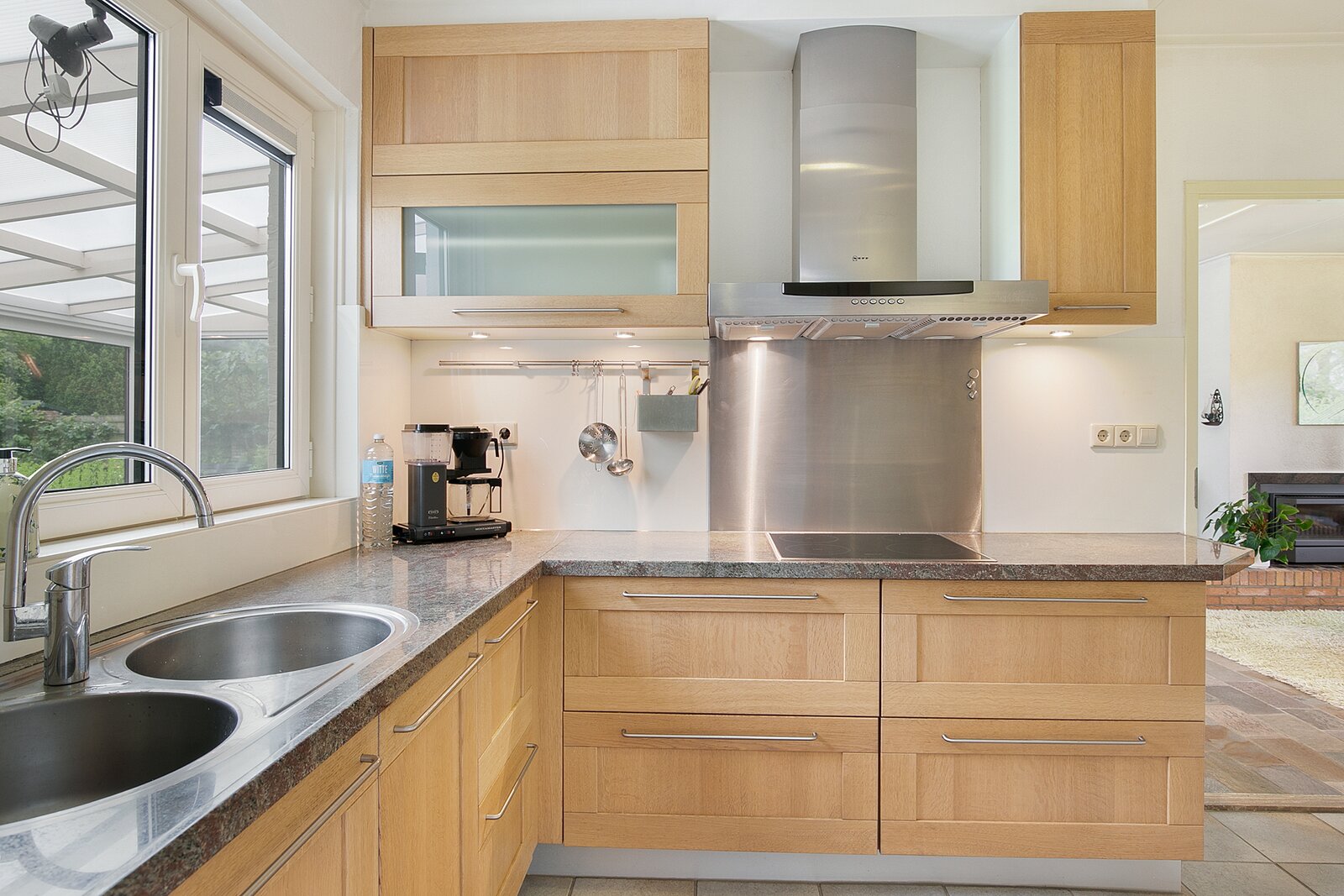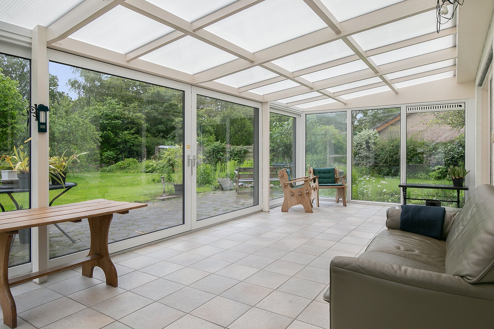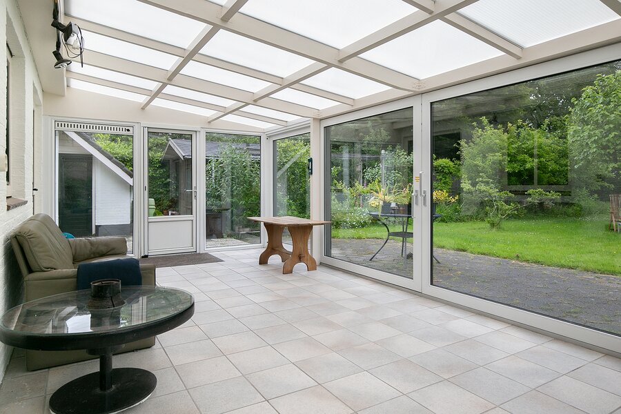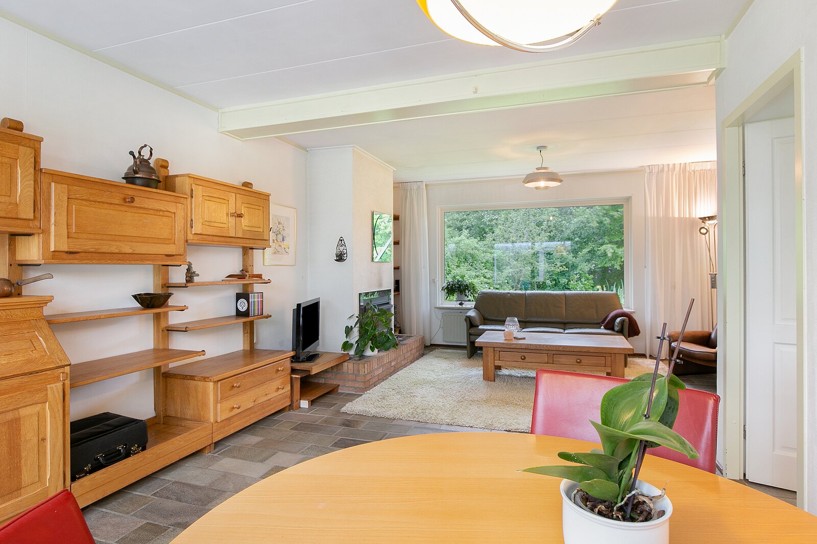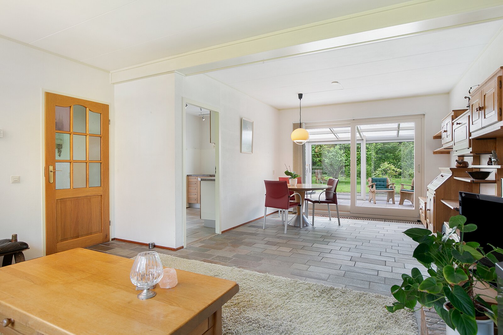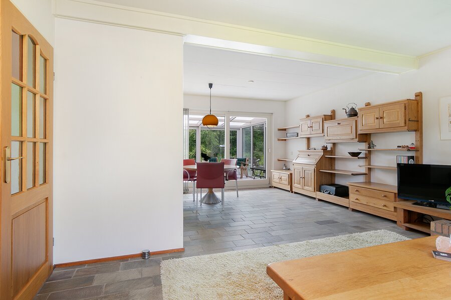 De woonkamer met aangebouwde serre is een lichte en royale leefruimte met plavuizen vloer. Middels een schuifpui bereikt u de serre en vanuit de woonkamer is ook de keuken bereikbaar. De keuken is voorzien van inbouwapparatuur en veel kastruimte. Ook in de achterliggende bijkeuken is mogelijkheid voor veel bergruimte.