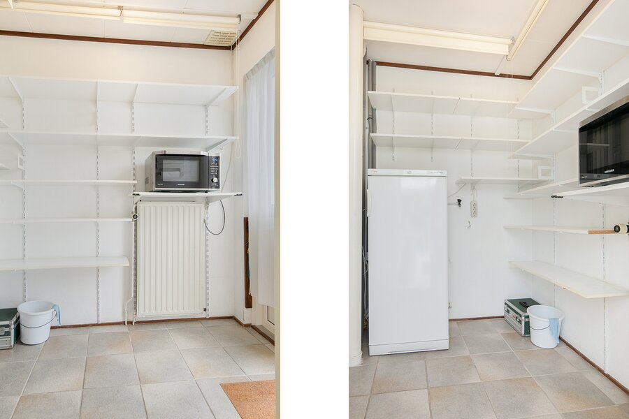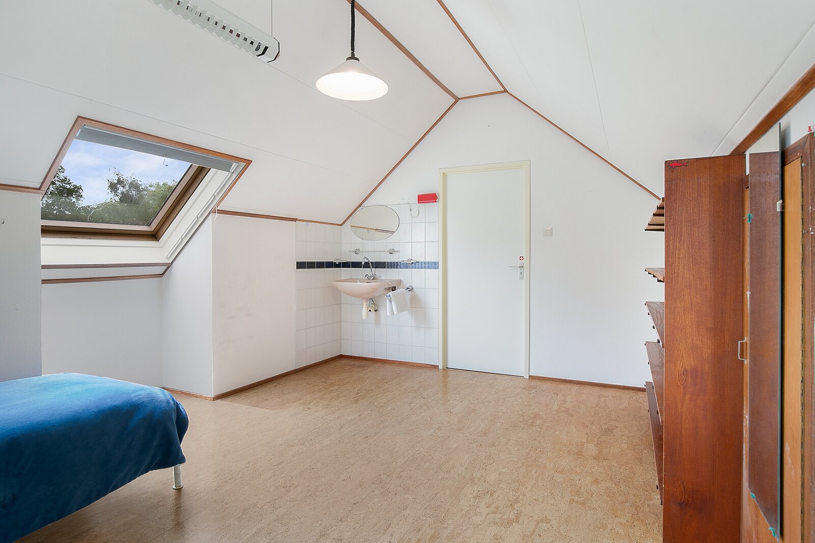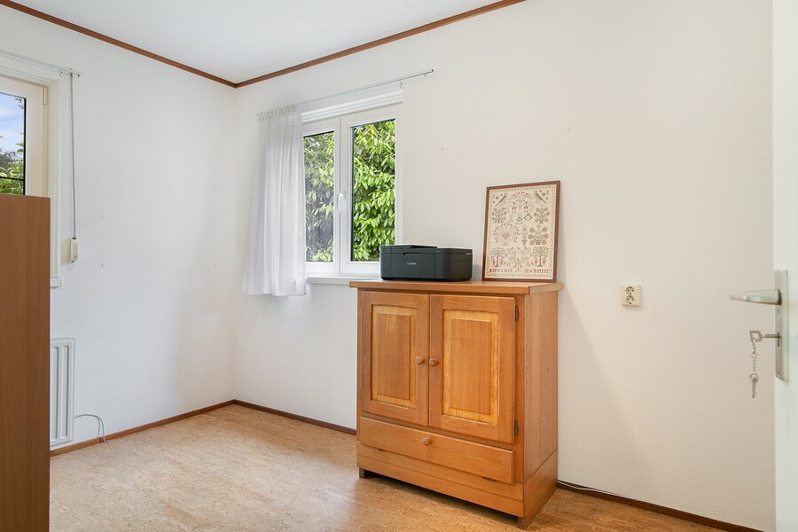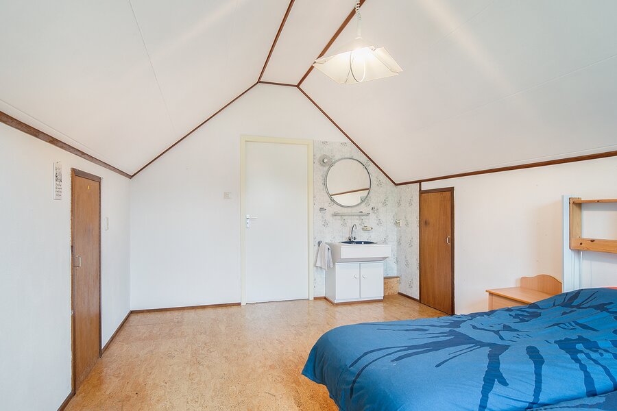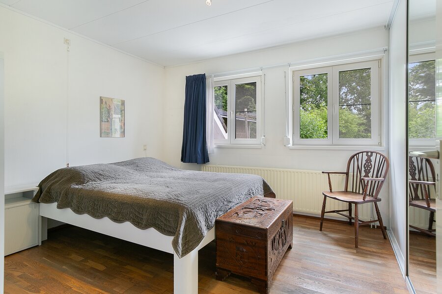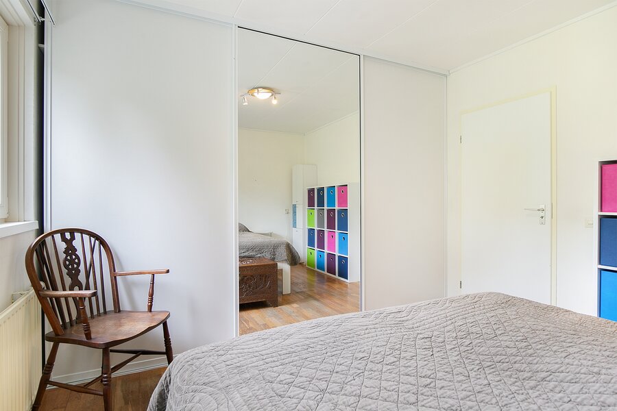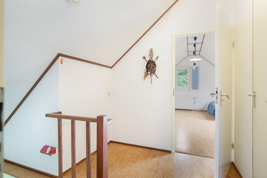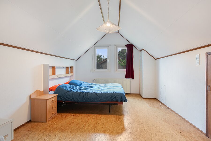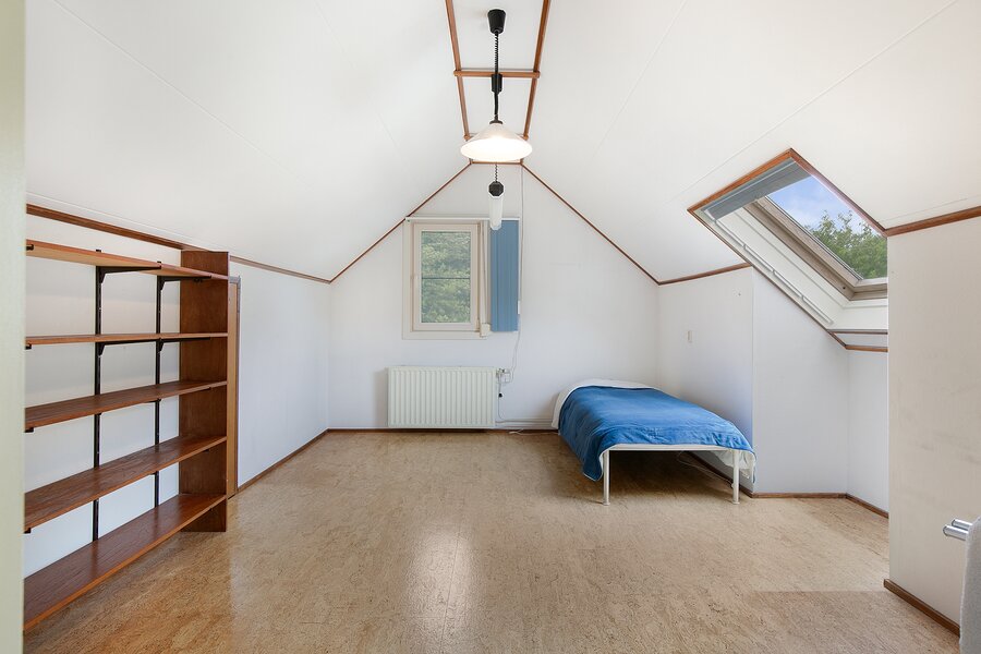 Over de gehele breedte van de woning is onder het laagste punt van het zadeldak bergruimte gecreëerd door middel van knieschotten.