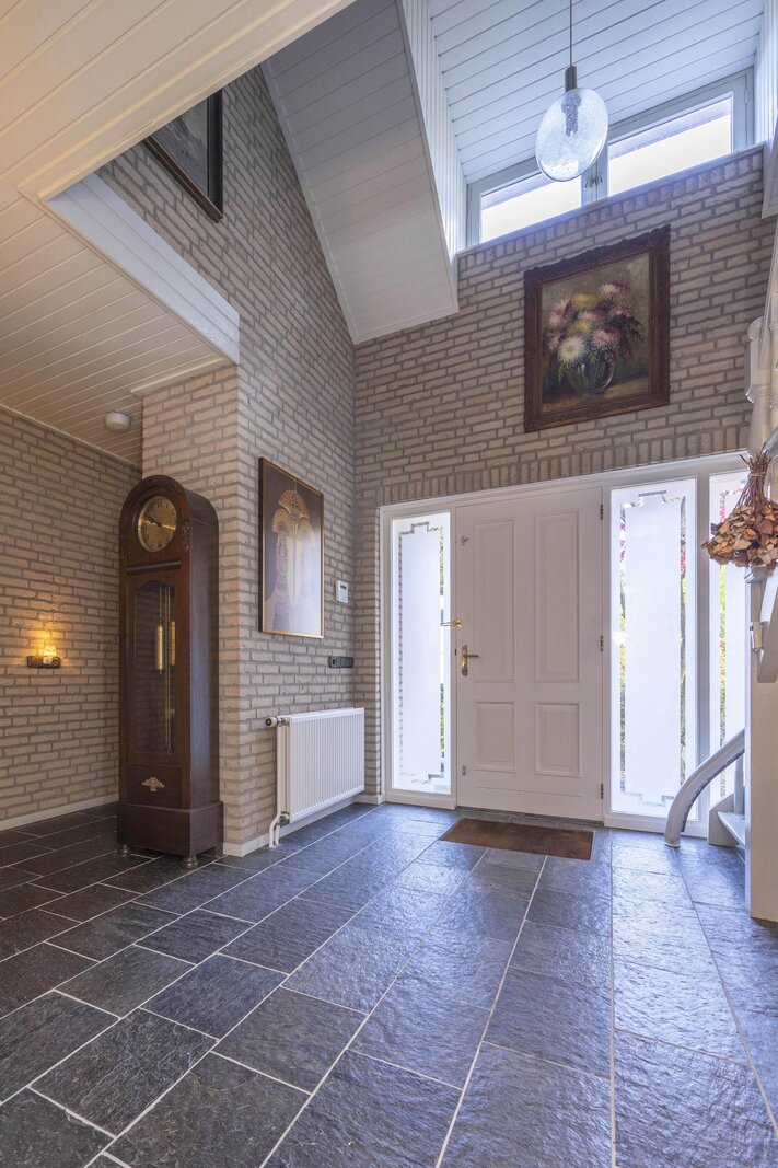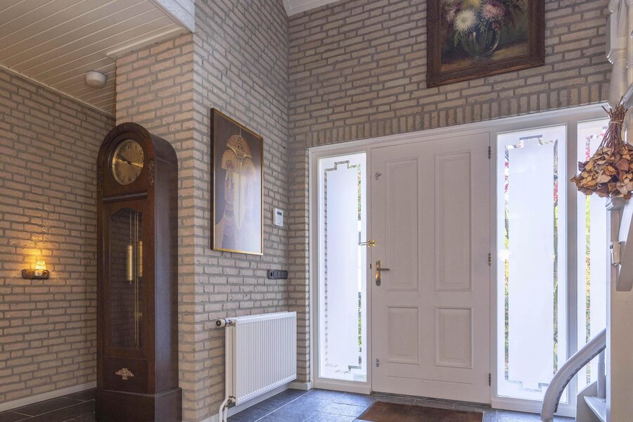 Een royale entree met Noorse Lei tegelvloer leidt u naar de hal met open trapopgang, een verzorgde toiletruimte met wandcloset en fonteintje en een garderobe. Vanuit de hal openen dubbele deuren naar het elegante leefgedeelte.