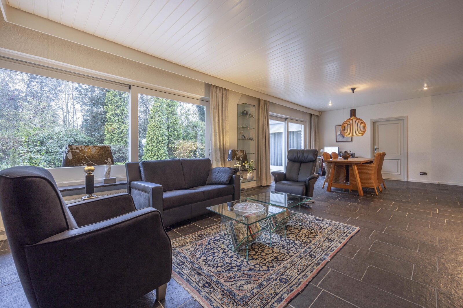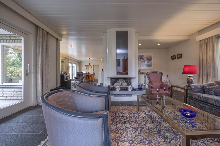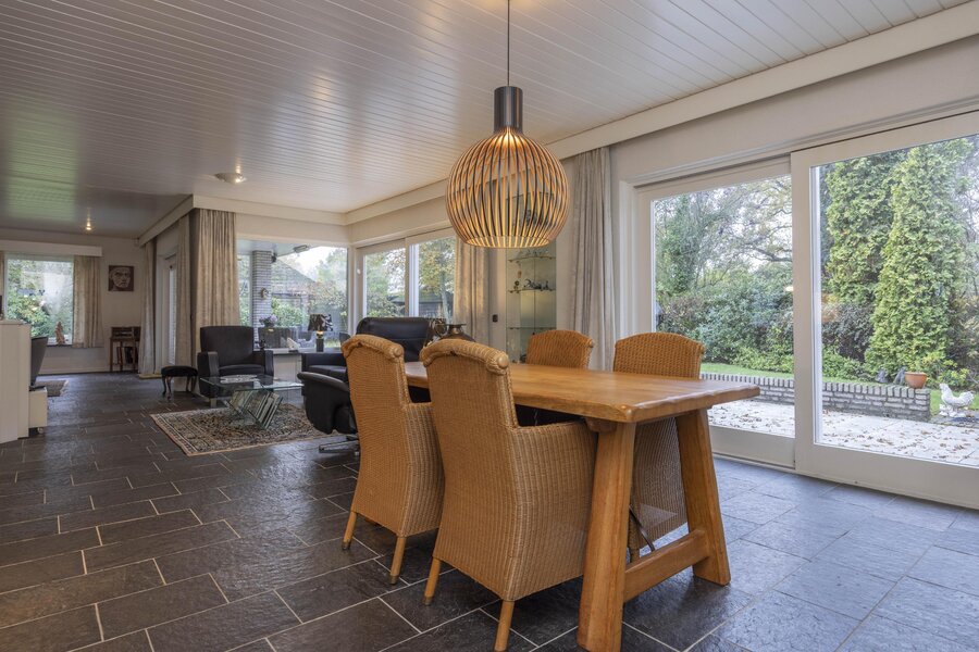 Aan de linkerzijde van de living bevindt zich het sfeervolle zitgedeelte met houtgestookte haard, dat op harmonieuze wijze overgaat in het eetgedeelte. De living wordt gekenmerkt door de vele raampartijen die zorgen voor een rijke lichtinval, terwijl twee schuifpuien een vloeiende verbinding vormen naar het serene buitenleven.