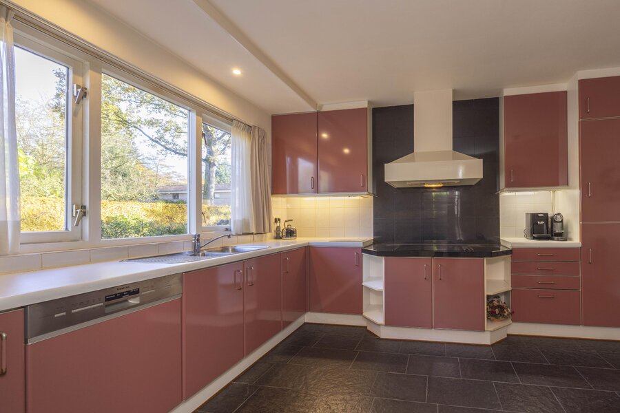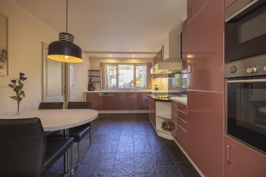 De ruime woonkeuken is uitgevoerd in een praktische hoekopstelling met onder en bovenkasten en voorzien van diverse inbouwapparatuur, waaronder een keramische kookplaat met afzuigkap, koelkast met vriezer, vaatwasser, oven en een magnetron.