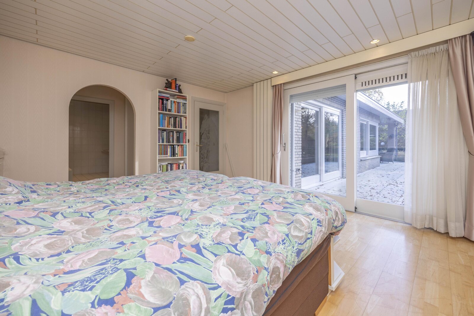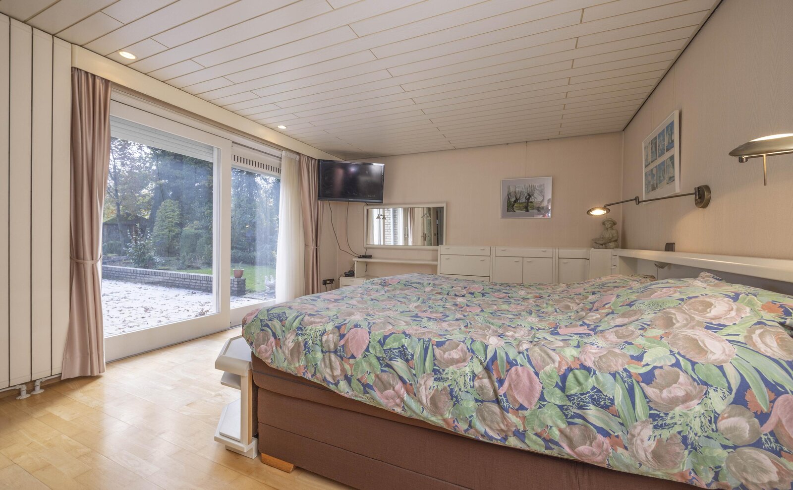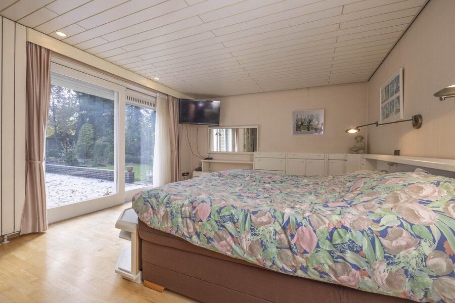 Vanuit het eetgedeelte bereikt u het ruime slaapvertrek op de begane grond, voorzien van een kastengedeelte en een badkamer en suite. In combinatie met het panoramische uitzicht via de schuifpui op het groene perceel ontstaat hier een aangename sfeer die doet denken aan een luxe hotelsuite.