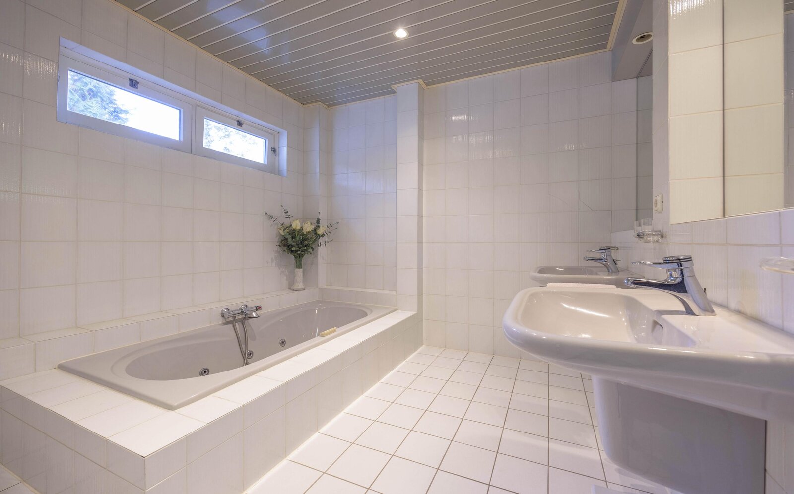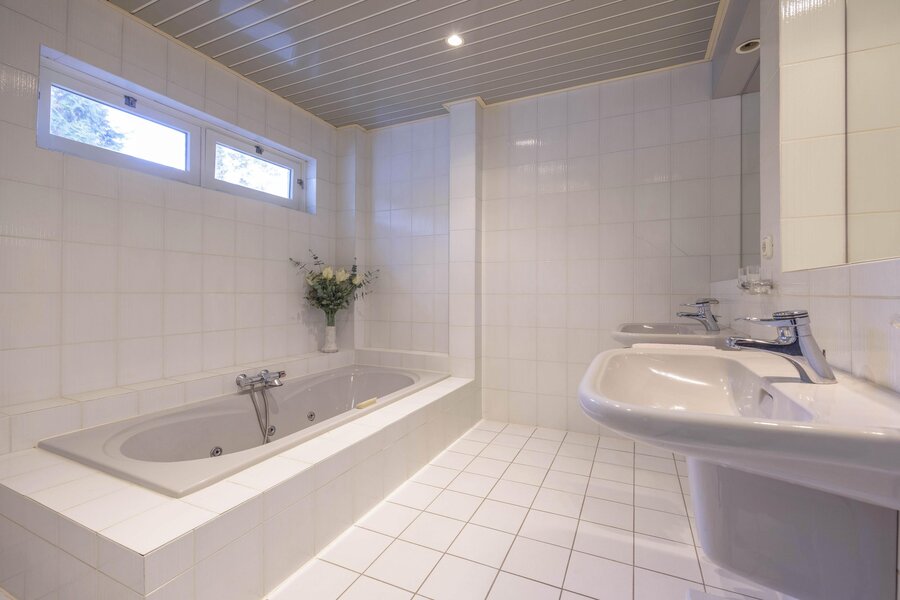 De badkamer is compleet uitgerust met een ligbad, een douche, een wandcloset, een dubbele wastafel, een designradiator en twee raampartijen die zorgen voor natuurlijke ventilatie.