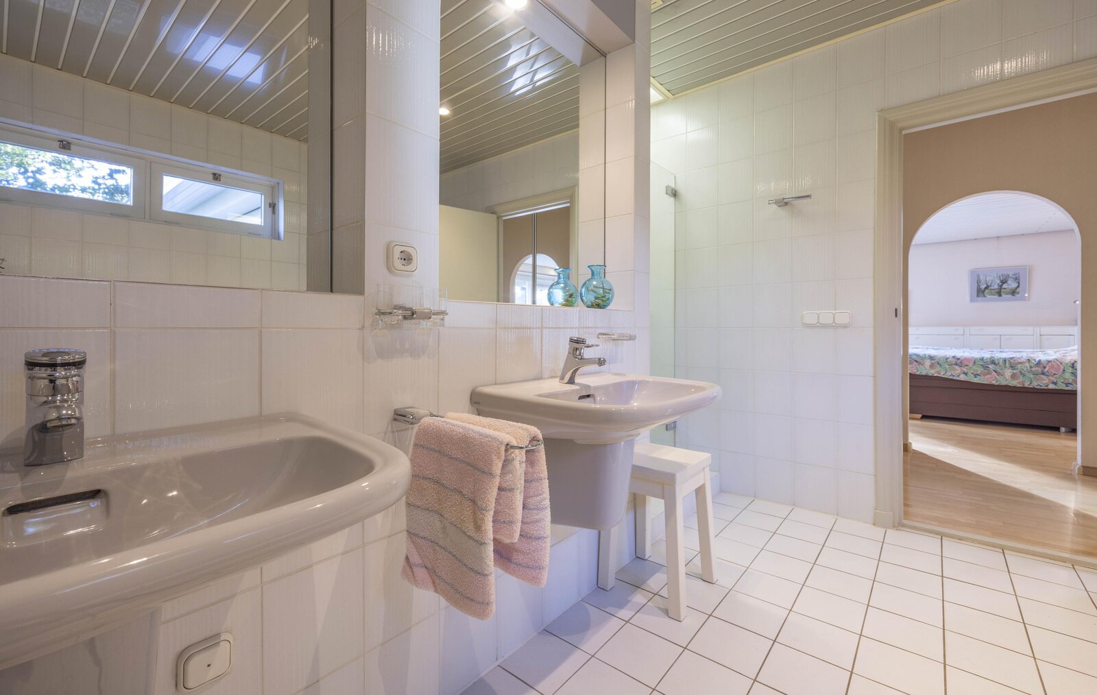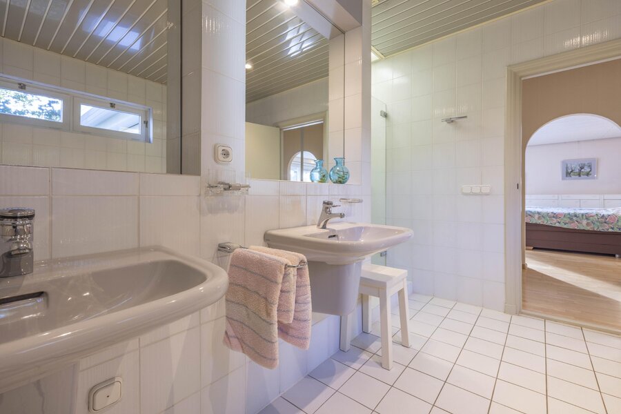 Aan de achterzijde situeert zich de badkamer, bestaande uit een douche en wastafel in meubel. Tevens bevinden zich hier de aansluitingen voor de wasapparatuur.