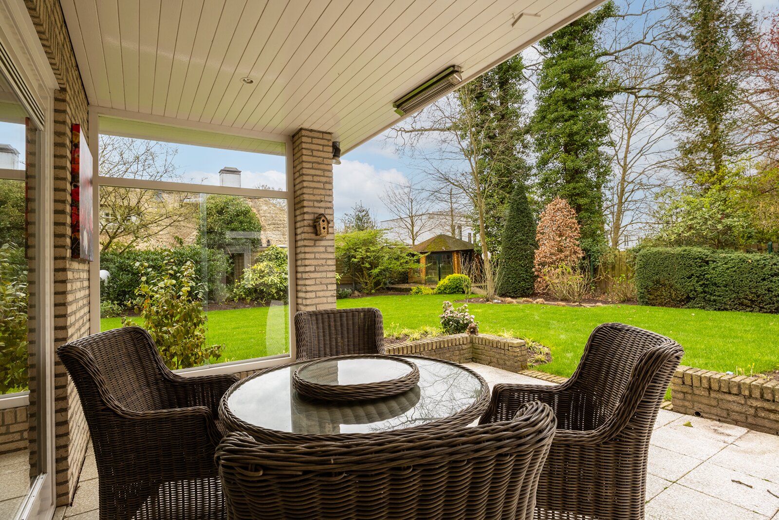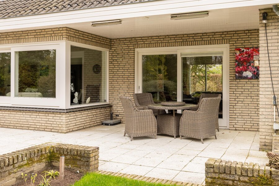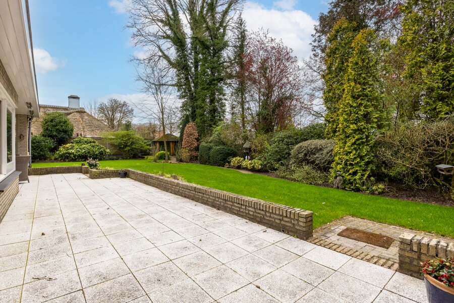 De verzorgde, privacy biedende tuin is rondom de bungalow gelegen en fraai aangelegd met een riant terras met sierbestrating, een weelderig gazon, volwassen bossage met beregeningssysteem en diverse plantenborders. Direct aan de woning ligt een beschut terras onder de overkapping met terrasverwarming, een sfeervolle plek waar het buitenleven in ieder seizoen tot zijn recht komt. Daarnaast profiteert u dankzij de houten berging van extra bergruimte voor uw tuingereedschap.
