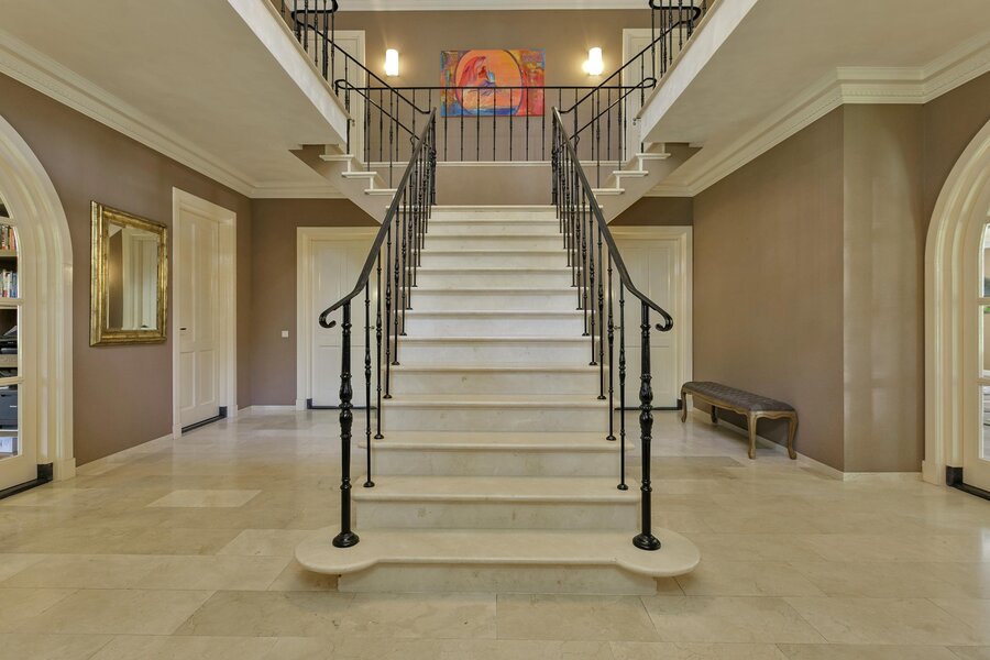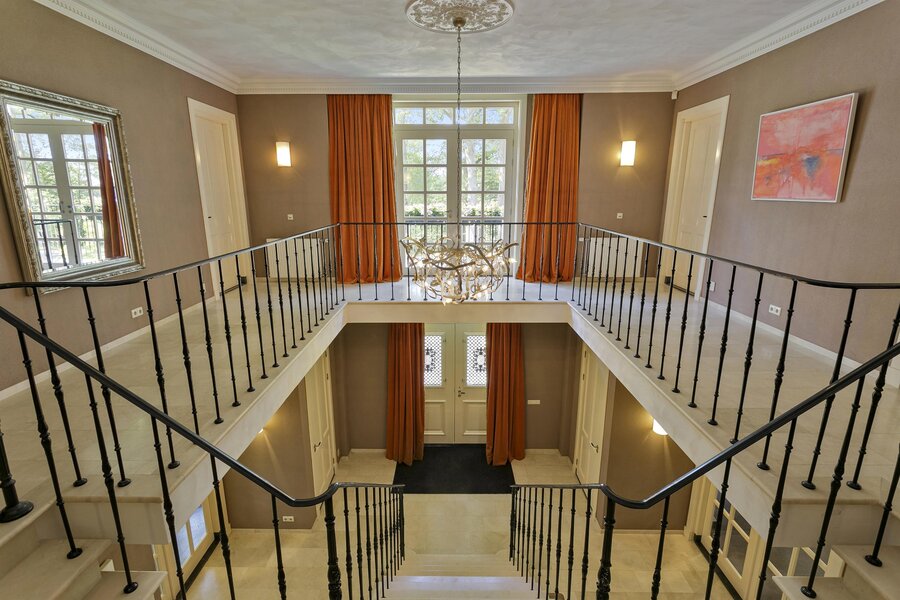 Een dubbele, stijlvolle voordeur geeft toegang tot de imposante hal met prachtige beige marmeren vloer en een centrale trapopgang. Vanuit de hal zijn onder andere de woonkamer, bibliotheek, ouderslaapkamer, keuken en bijkeuken bereikbaar.