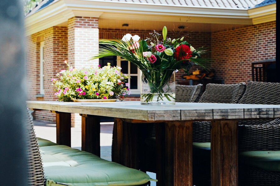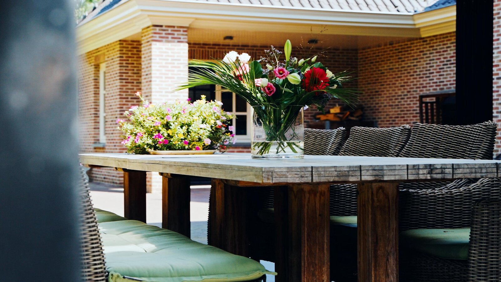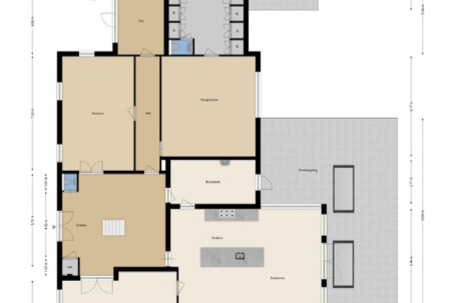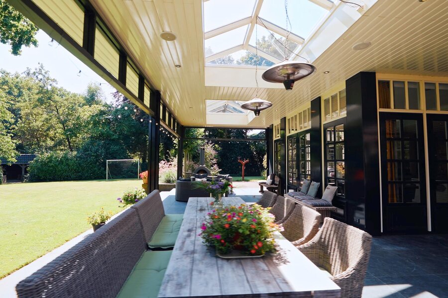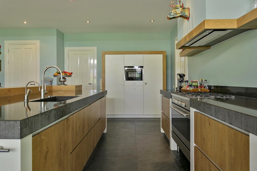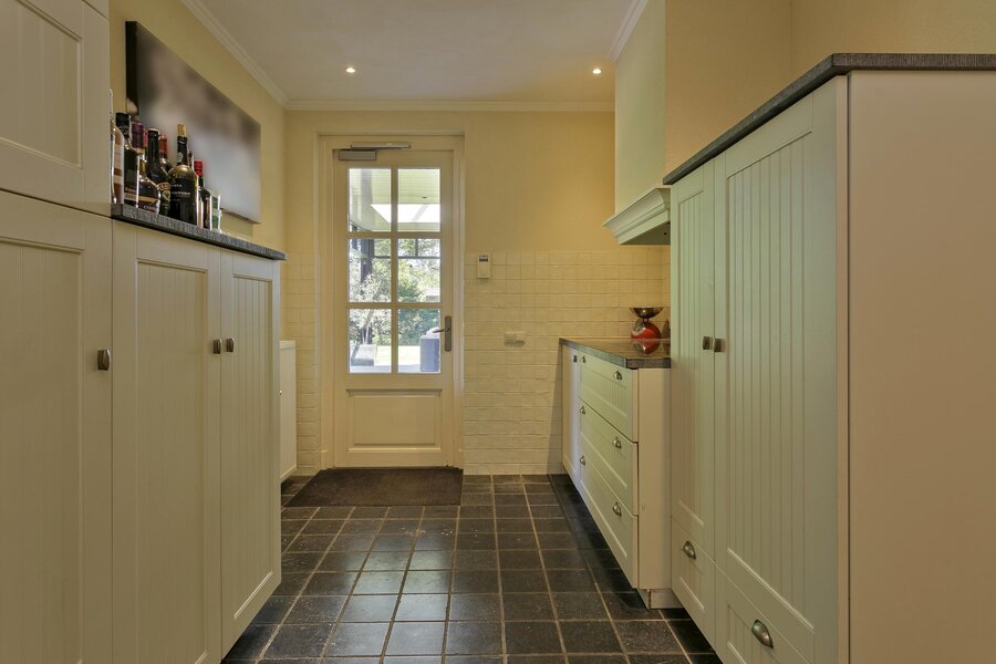 Het hart van het huis. Een warme, sfeervolle leef keuken met Belgisch hardstenen werkbladen, houten kastfronten en een centraal spoeleiland. De royale eethoek met glas rondom voelt als een oranjerie en biedt ruimte voor ten minste 10 personen. Gashaard op hoogte, fraaie antraciet leistenen vloer, diverse inbouwapparatuur en zicht op de tuin maken deze ruimte tot een plek waar u wil zijn. Vanuit de keuken, via openslaande deuren, is een royaal bemeten veranda met heaters en daklichten bereikbaar. Perfect voor lange zomeravonden. Ook is direct vanuit de keuken de bijkeuken bereikbaar met achteringang, veel kastruimte en een aanrecht met afzuigkap en uitstort gootsteen.