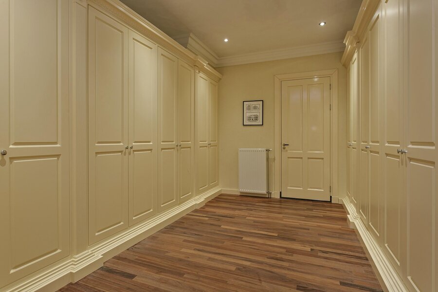 De royale ouderslaapkamer op de begane grond biedt rust en heeft uitzicht op de tuin. Aansluitend aan deze prachtige slaapkamer is een garderobekamer voorzien van op maat gemaakte kasten wanden en een separaat toilet. Achter de garderobekamer komt u in een adembenemende badkamer met ruim luxe rond bad onder een sterrenhemel, inloopdouche en dubbele wastafel met maatwerk onderkasten.