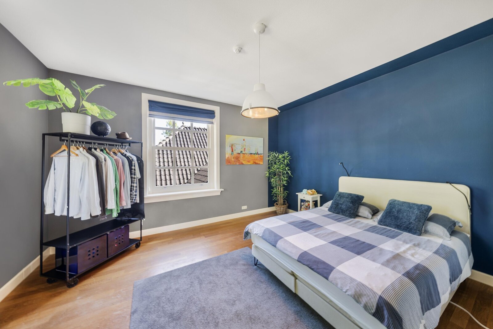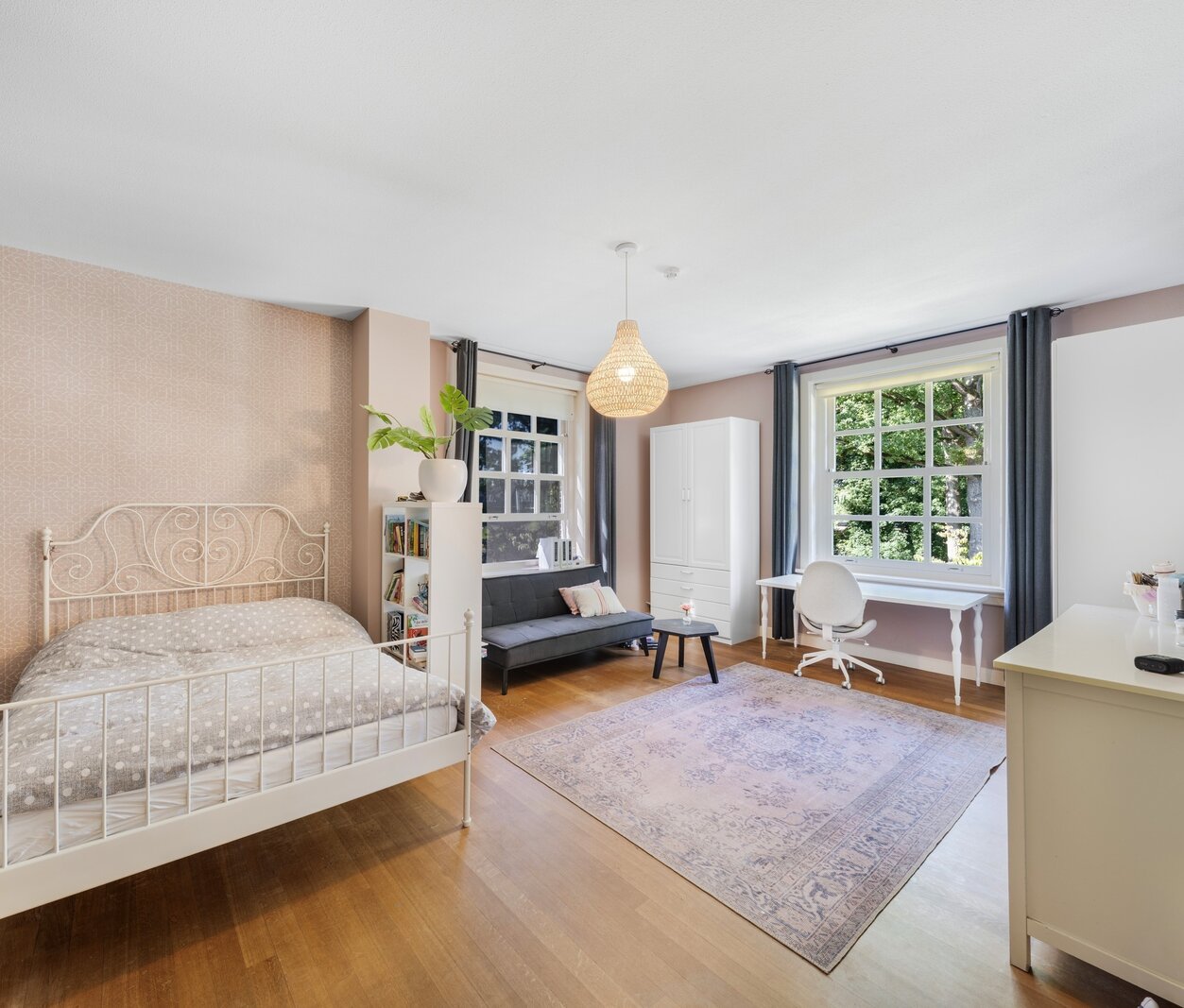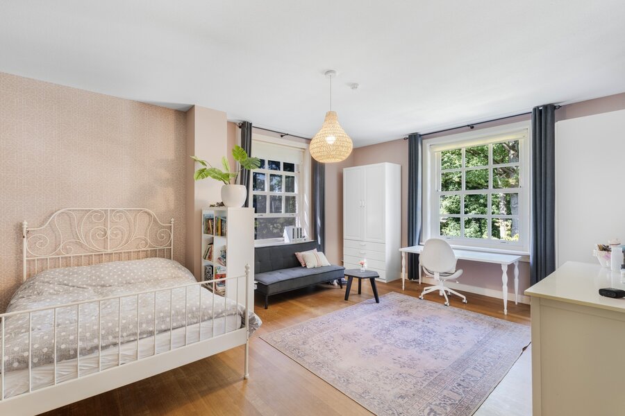 A wide landing surrounds the central staircase and gives access to four spacious bedrooms and a smaller bedroom or office (all with oak floors). Each room is beautifully finished with garden or neighborhood views. One room even includes a built-in play/sleep nook—a children’s dream.