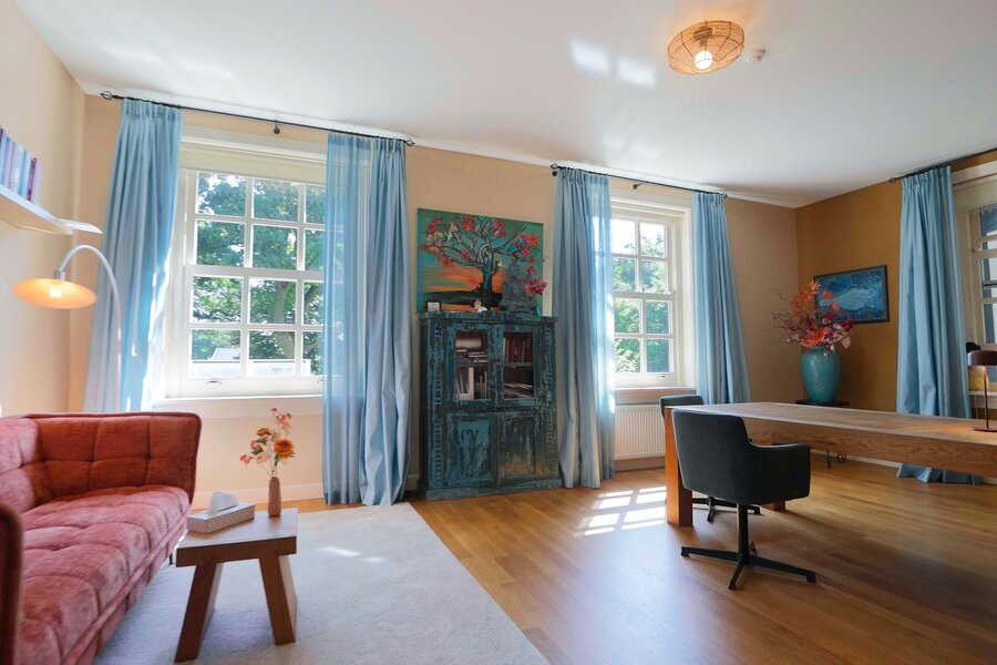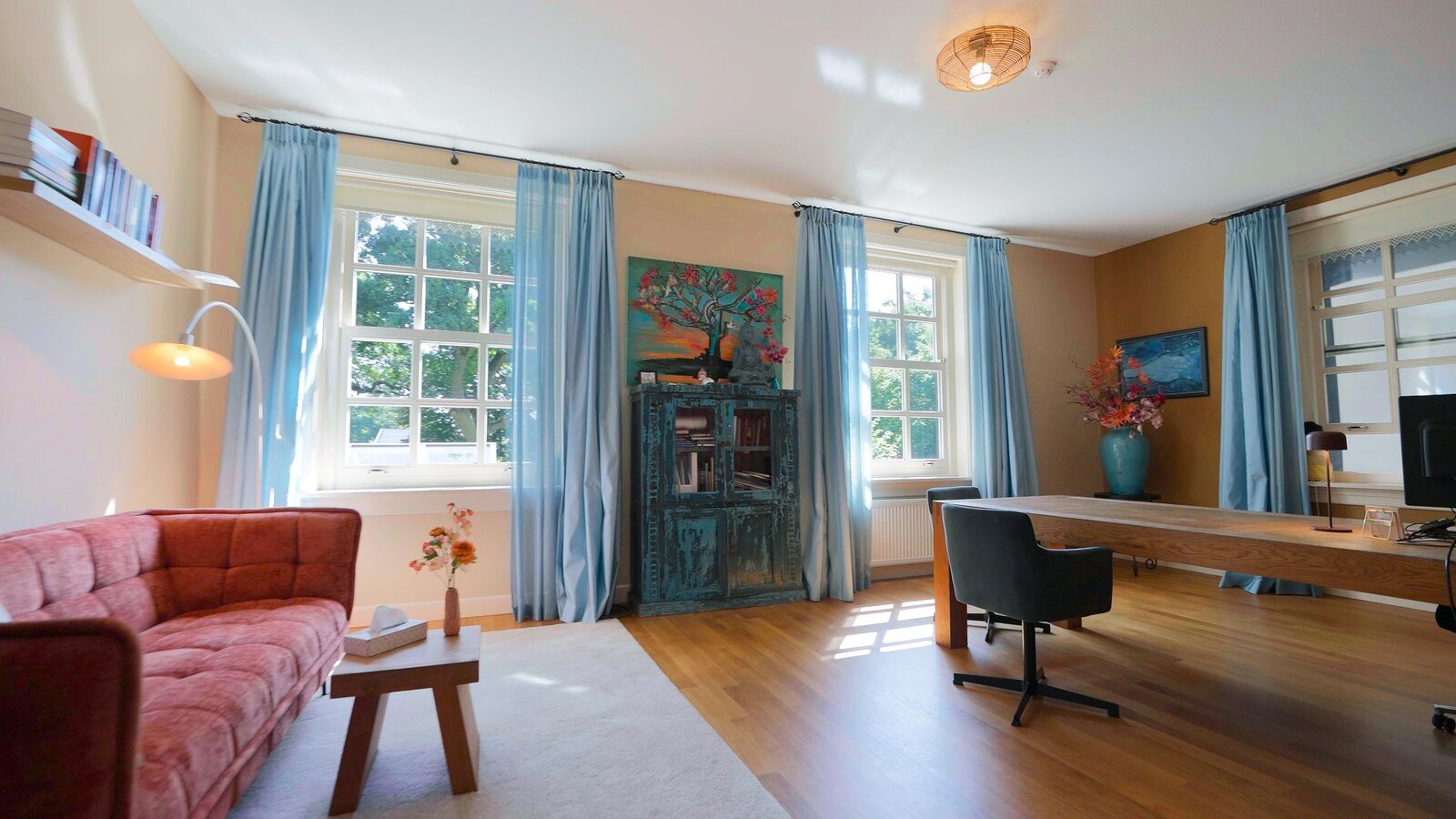 Gelegen aan de voorzijde van het huis, met maatwerk boekenkasten en ruimte voor meerdere werkplekken. Ideaal voor thuiswerken of praktijk aan huis.