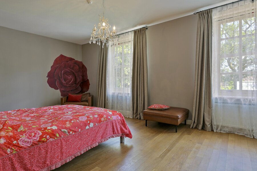 Rondom de centrale trap een brede overloop met toegang tot vier riante slaapkamers en een kleinere slaap- of werk/strijkkamer. (alle kamers zijn voorzien van eiken vloeren). Allen mooi afgewerkt en voorzien van ramen met prachtig zicht op de tuin of omgeving. Eén van de kamers heeft zelfs een ingebouwde speel- of slaap nis, een droom voor kinderen.
