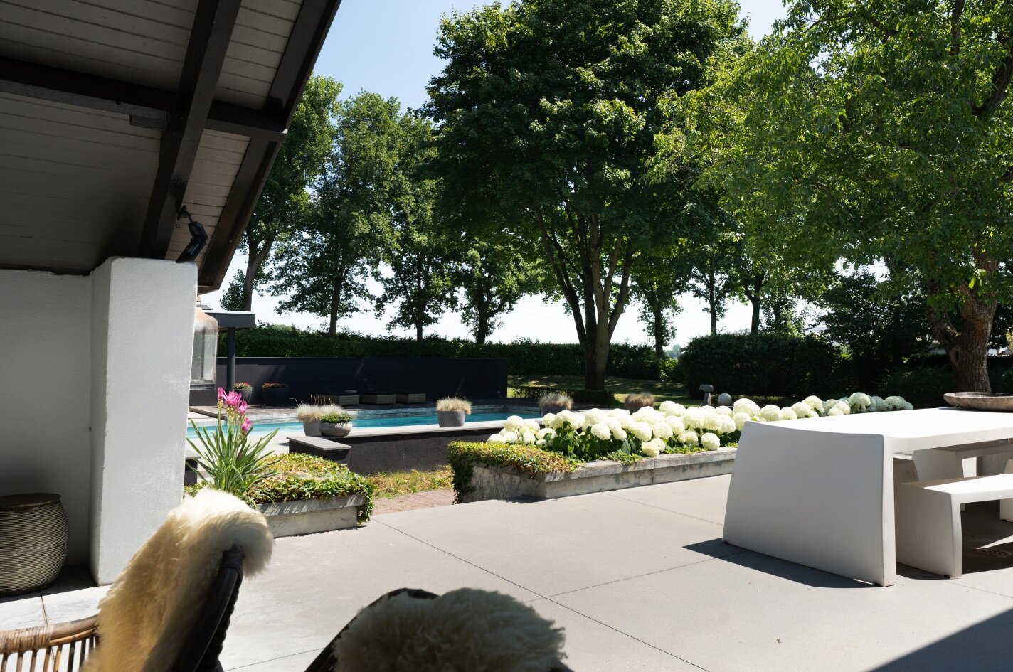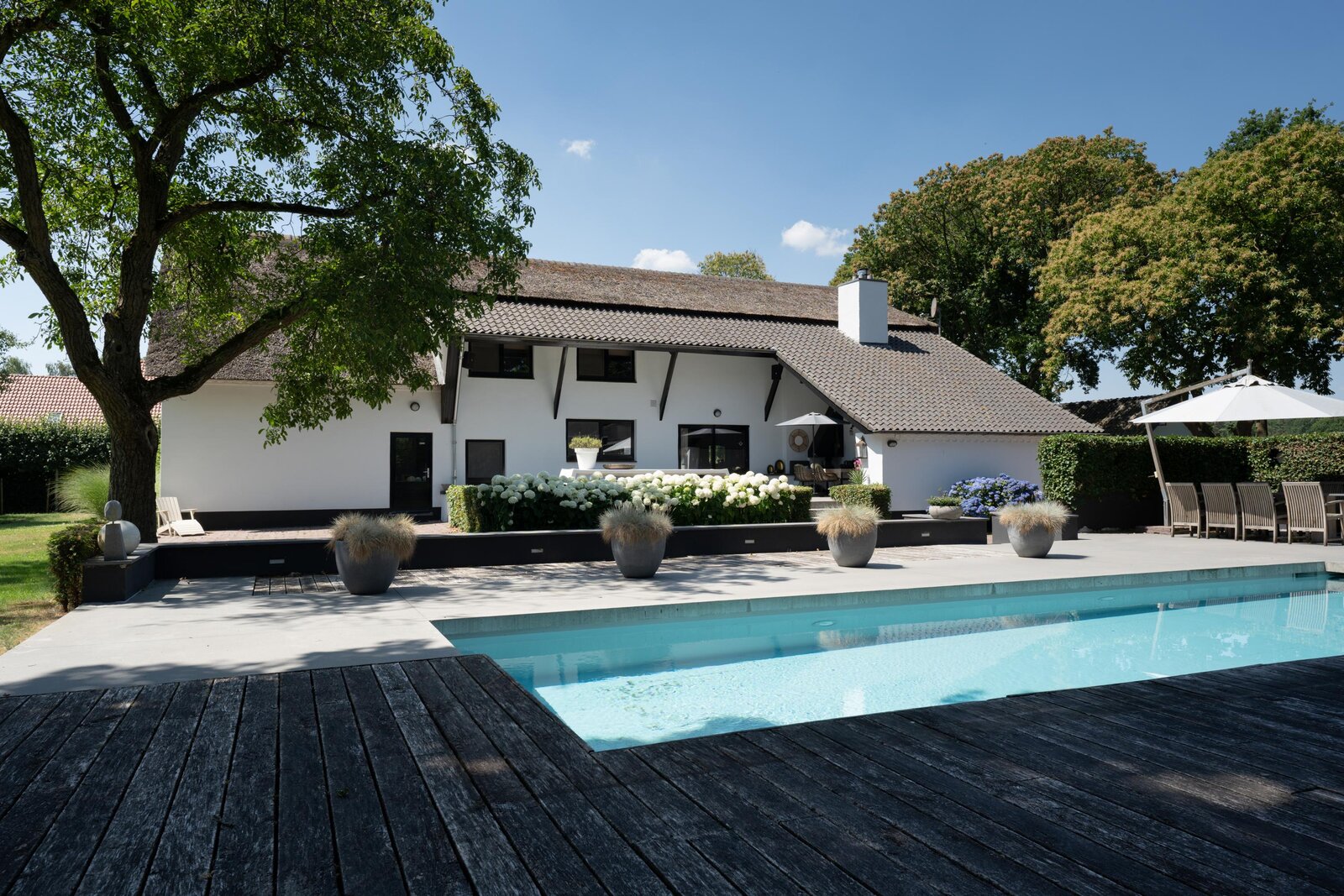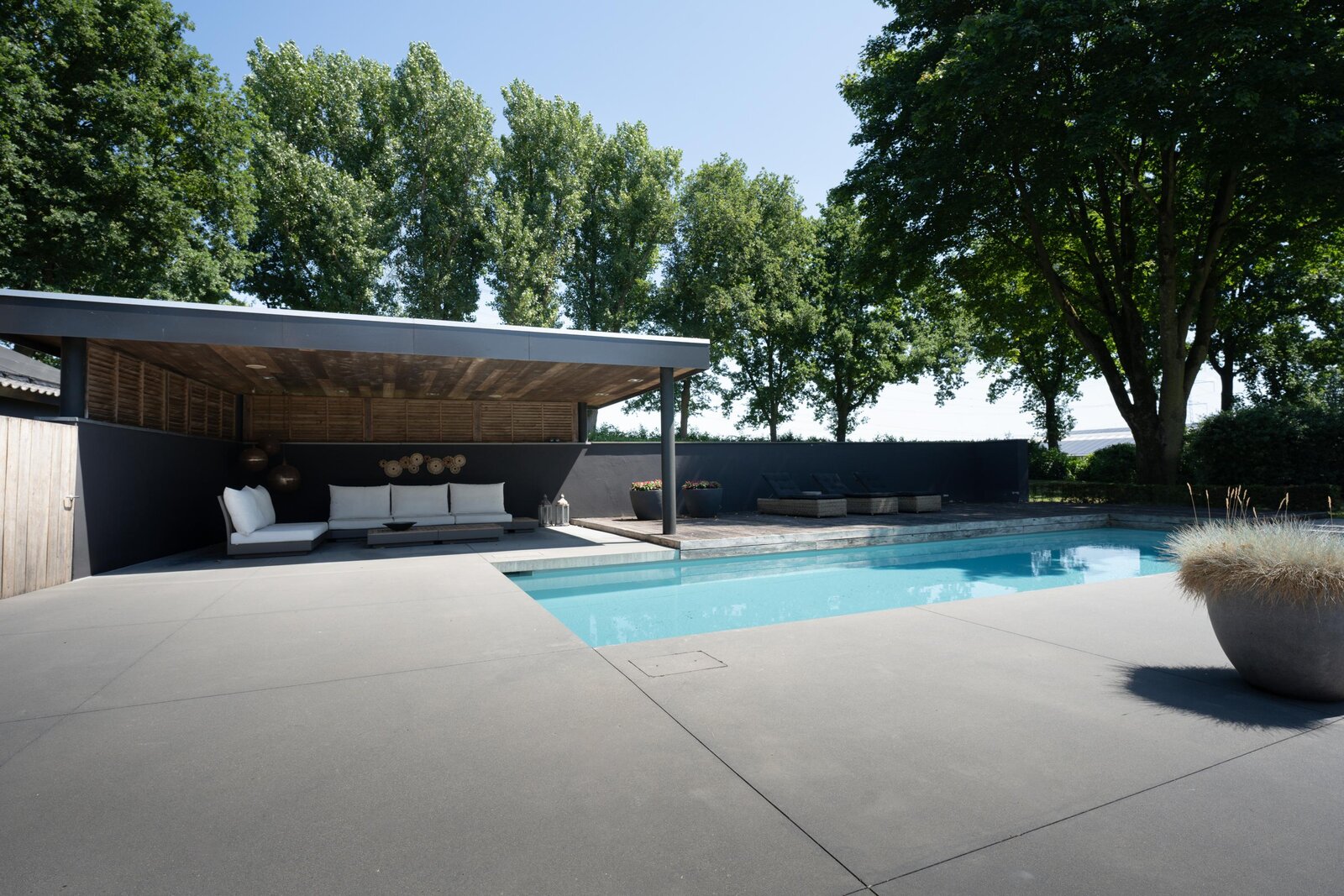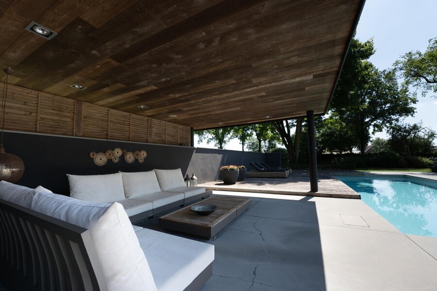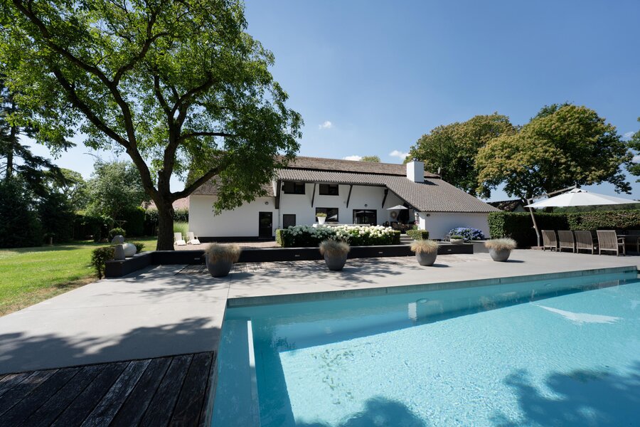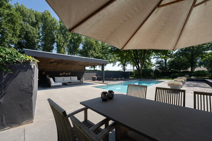 In de tuin is -bij een houten paviljoen met terras- het zwembad gelegen; door de ligging bij het paviljoen en deels een muurafscheiding is er veel privacy.