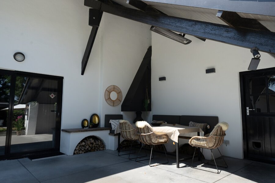 Aan de achterzijde van de woonboerderij is , over de volle breedte, een terras met sierbestrating gelegen; een gedeelte van het terras is beschut gelegen onder een overkapping met een buitenhaard zodat u hier in meerdere seizoenen heerlijk kunt genieten. Er is toegang tot een berging voorzien van een schakelkast en de opstelling van de ketel voor de hete lucht verwarming.