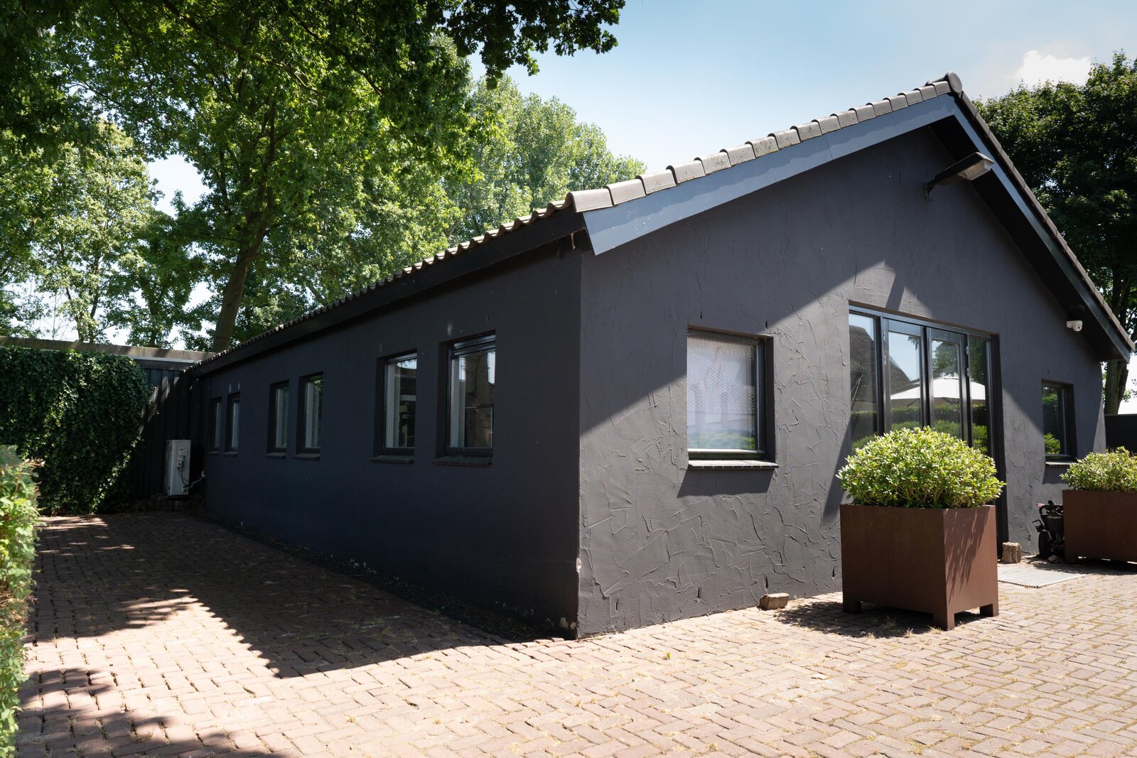 Het royale, multifunctionele bijgebouw is momenteel in gebruik als bedrijfsruimte c.q. showroom maar is uitermate geschikt voor atelier, kantoor-, praktijk- of hobbyruimte. Dit bijgebouw heeft qua interieur een open karakter en is voorzien van gedeeltelijk vloerverwarming en airconditioning (koelen en verwarmen). De halfopen keukenruimte met aanrechtblok beschikt over een spoelbak met warm & koud stromend water en een koelkast. In een halletje bevindt zich een technische ruimte met schakelkast en de installatie voor het zwembad. De toiletruimte is voorzien van een wandcloset en fontein.