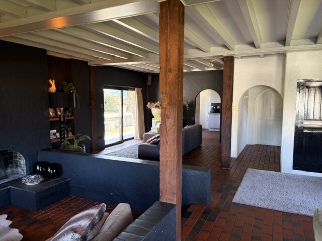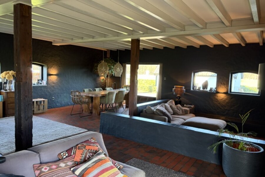 De royale woonkamer heeft een balkenplafond en is voorzien van een tegelvloer; het zitgedeelte is gerealiseerd in de zogenaamde zitkuil met houtgestookte open haardpartij. Door de verdiepte ligging ontstaat er een knusse hoek dat een geborgen gevoel geeft. Door de diverse raampartijen is er een aangename lichtinval. Er is een praktische inbouwkast met fraaie luiken. Een schuifpui aan de achterzijde geeft toegang tot het terras.